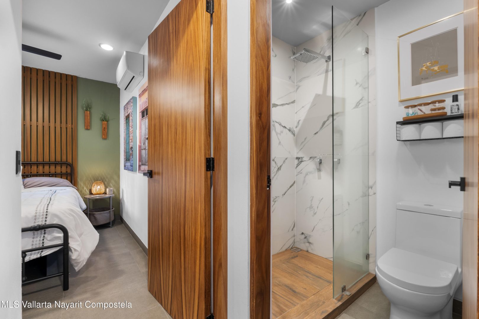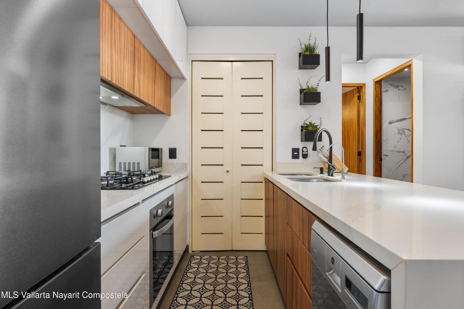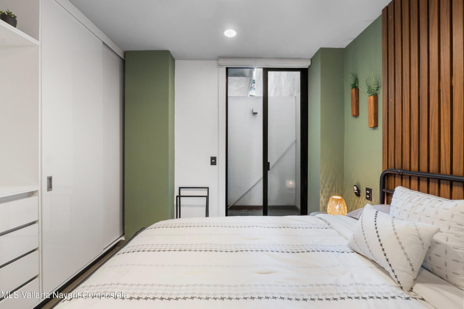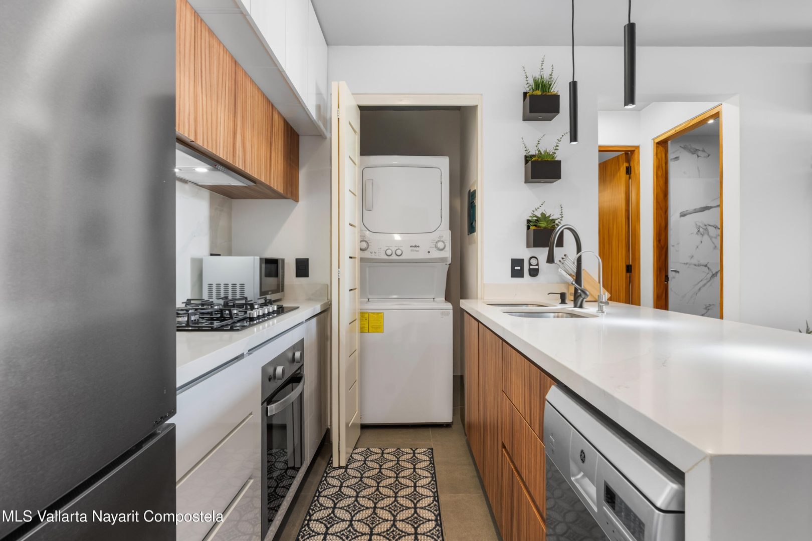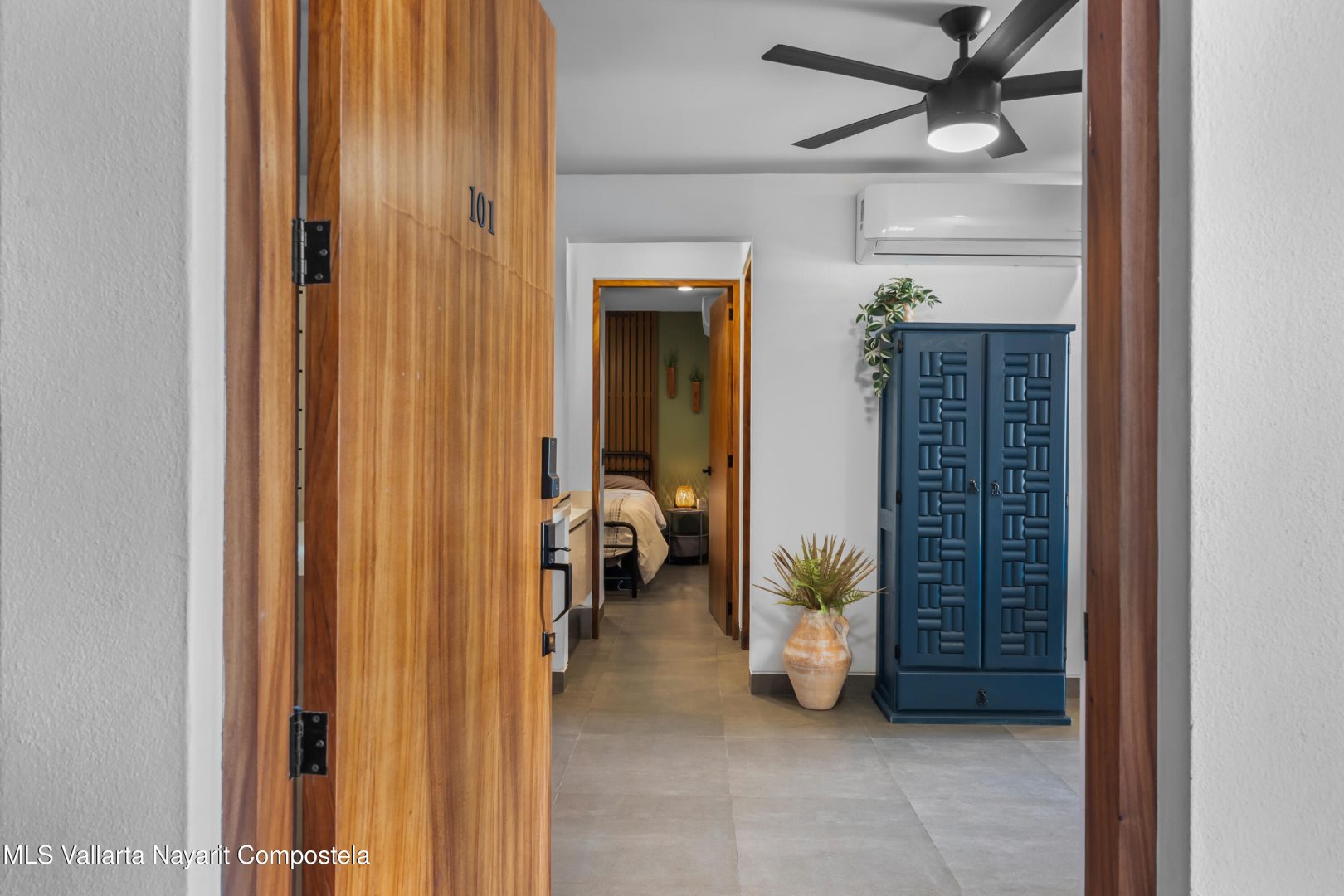 Beautiful newer, tastefully furnished 2-bedroom, 2-bathroom condominium located on the growing and highly desirable east side of Bucerias–just five short blocks from the stunning Golden Zone beaches. This prime location offers easy access to an abundance of restaurants, shops, pharmacies, and everyday conveniences. The unit is impeccably furnished and showcases high-end finishes throughout, including custom electronic blinds, blackout blinds in bedrooms,granite countertops, decorative wood panels, painted accent walls and ceilings, and soft indirect lighting in both the living room and primary bedroom. Comfort is elevated with controllable inverter A/C mini-splits, including a living room unit equipped with a programmable mobile app for remote operation, as well as ceiling fans throughout