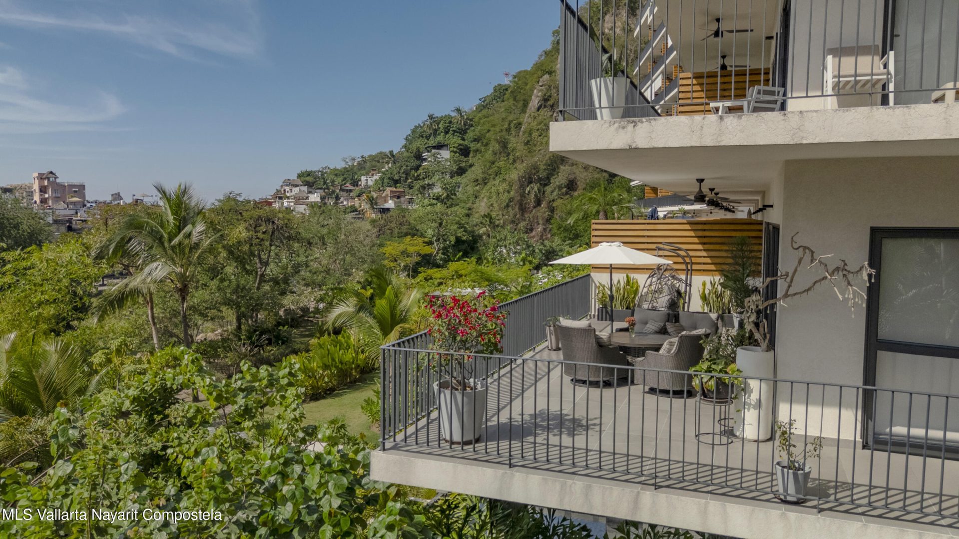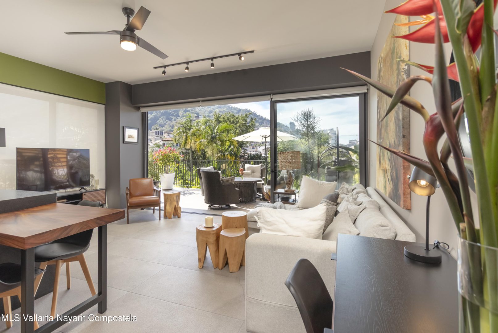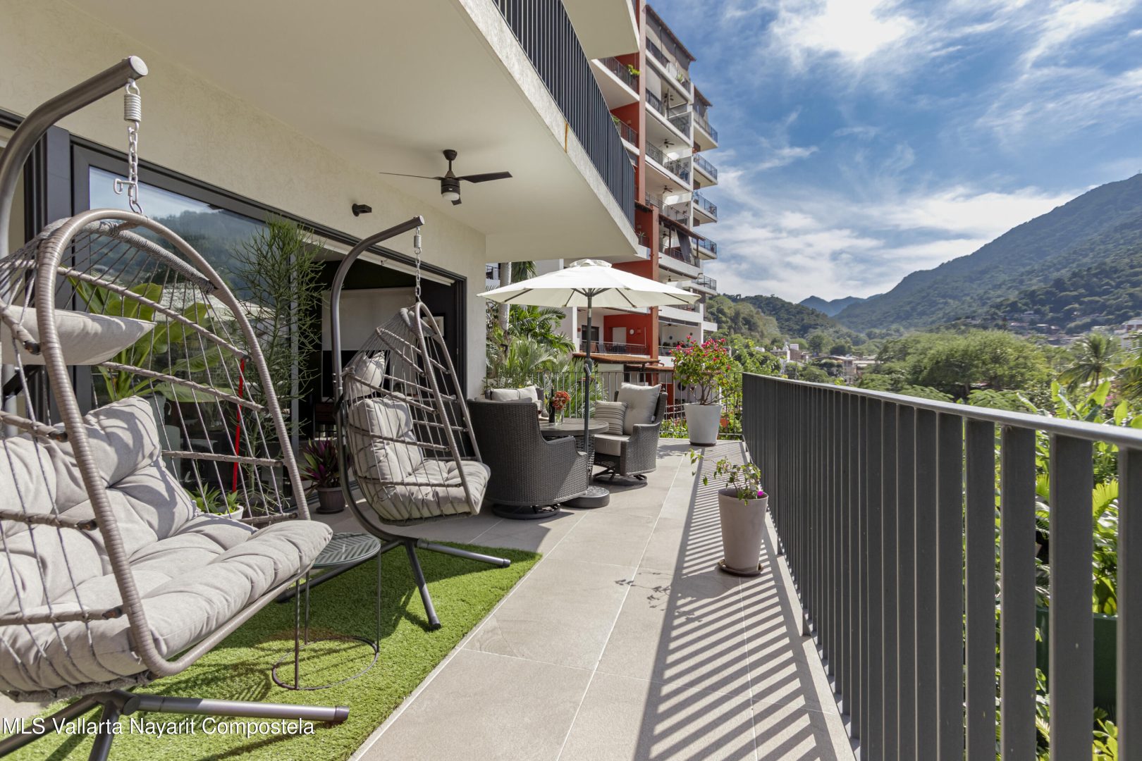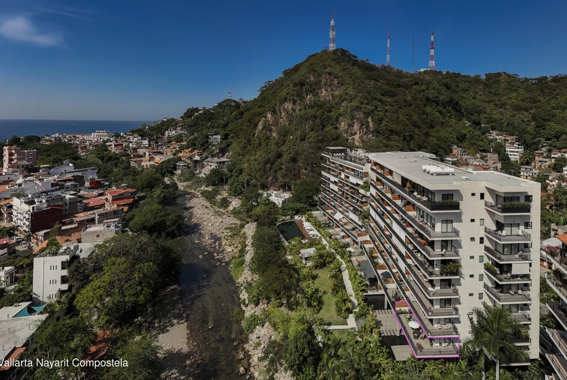 Ubicada a orillas del Rio Cuale, la Unidad 212 del Condominio Oasis es una luminosa residencia esquinera de 2 recamaras y 2 banos que ofrece tranquilas vistas al rio, las montanas circundantes y el pueblo. Una excepcional terraza envolvente de 50 m, una de las mas grandes del edificio, proporciona abundante luz natural y un amplio espacio al aire libre, ideal para disfrutar del amanecer.La sala de estar de concepto abierto cuenta con una cocina renovada con gabinetes a medida, una gran isla y un comedor adicional, ideal tanto para el entretenimiento como para la vida diaria. La recamara principal tiene acceso directo a la terraza, lo que realza el estilo de vida interior y exterior y la conexion con el entorno natural.Condominio Oasis es una comunidad riberena con todos los servicios