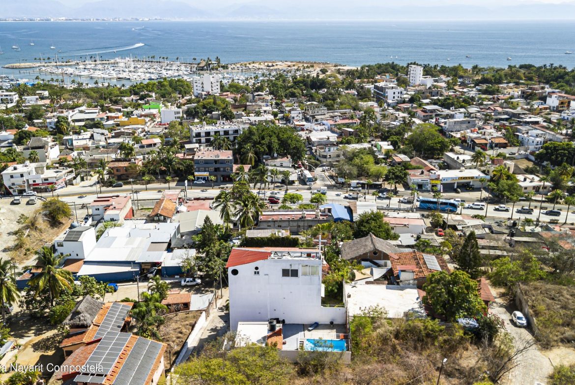 Cordillera #3 is a standalone home located on a quiet street in the Monte Calvario neighborhood, just a 15-minute walk from the beach in La Cruz de Huanacaxtle. This hidden gem offers a flexible two-level layout ideal for full-time living or rental potential. The main floor features a bright open-concept living and dining area, a modern kitchen with dark cabinetry and breakfast bar, two air-conditioned bedrooms (one with a large built-in closet), two full bathrooms, a laundry area, and a one-car garage. Upstairs, an independent suite with a private terrace adds versatility. The highlight is the expansive rooftop terrace with a private pool, perfect for enjoying tropical views and stunning sunsets. Contact us for more information or to schedule a private showing.