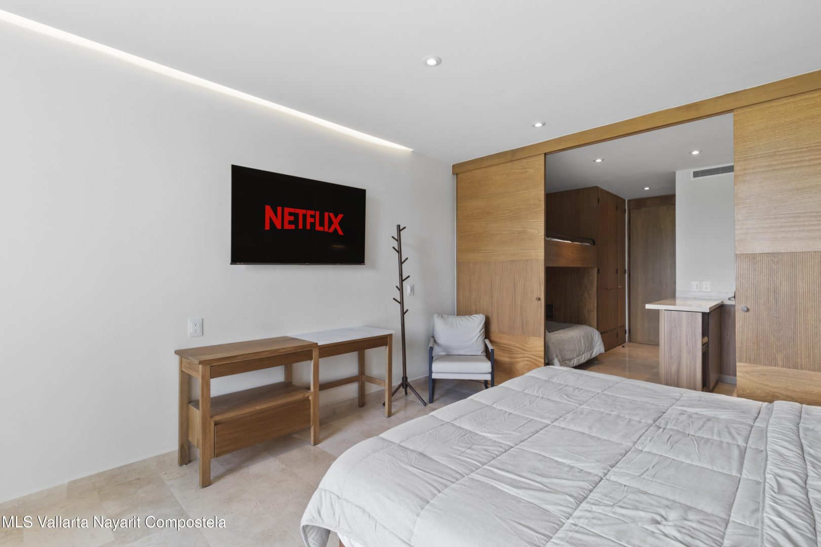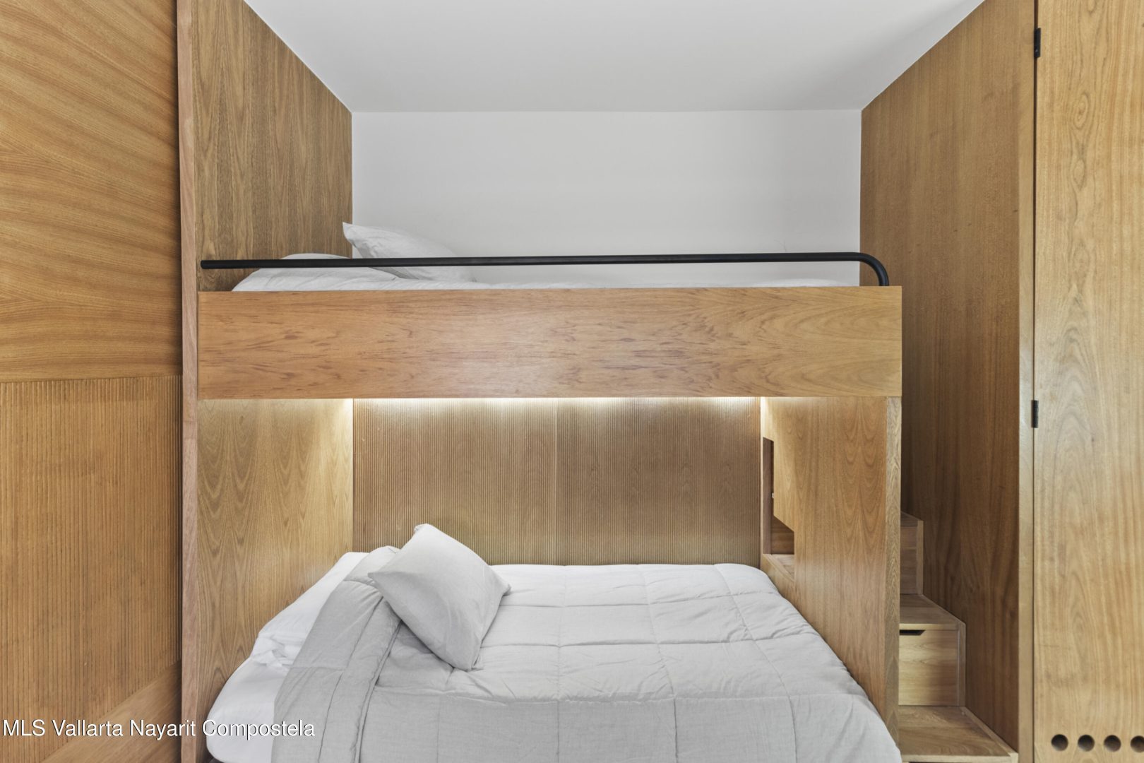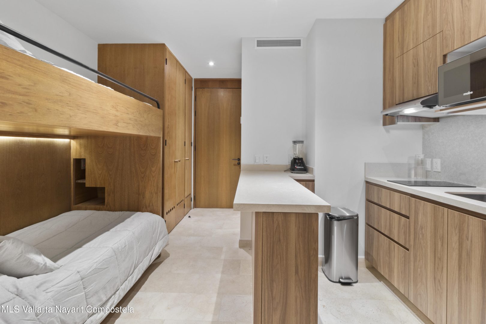 El departamento cuenta con una cama king size ademas de una litera con camas individuales, por lo que comodamente se pueden hospedar 4 personas. Cuenta con cocineta equipada, esta amueblado y tiene 2 banos completos. En el desarrollo disfurte de sus albercas, gym, ludoteca, areas verdes entre otras amenidades. Departamento frente al mar para caminatas en la playa, rentas vacacionales y dias de descanso.