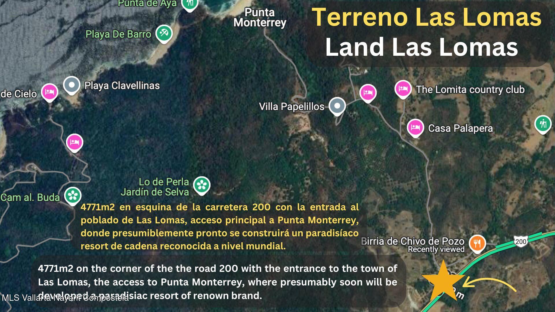 The Land is located in the corner of the main entrance to the road to Playa Monterrey, it counts with services from the municipality. – El Terreno se encuentra en la esquina del acceso principal a la carretera a Playa Monterrey, cuenta con servicios del municipio.