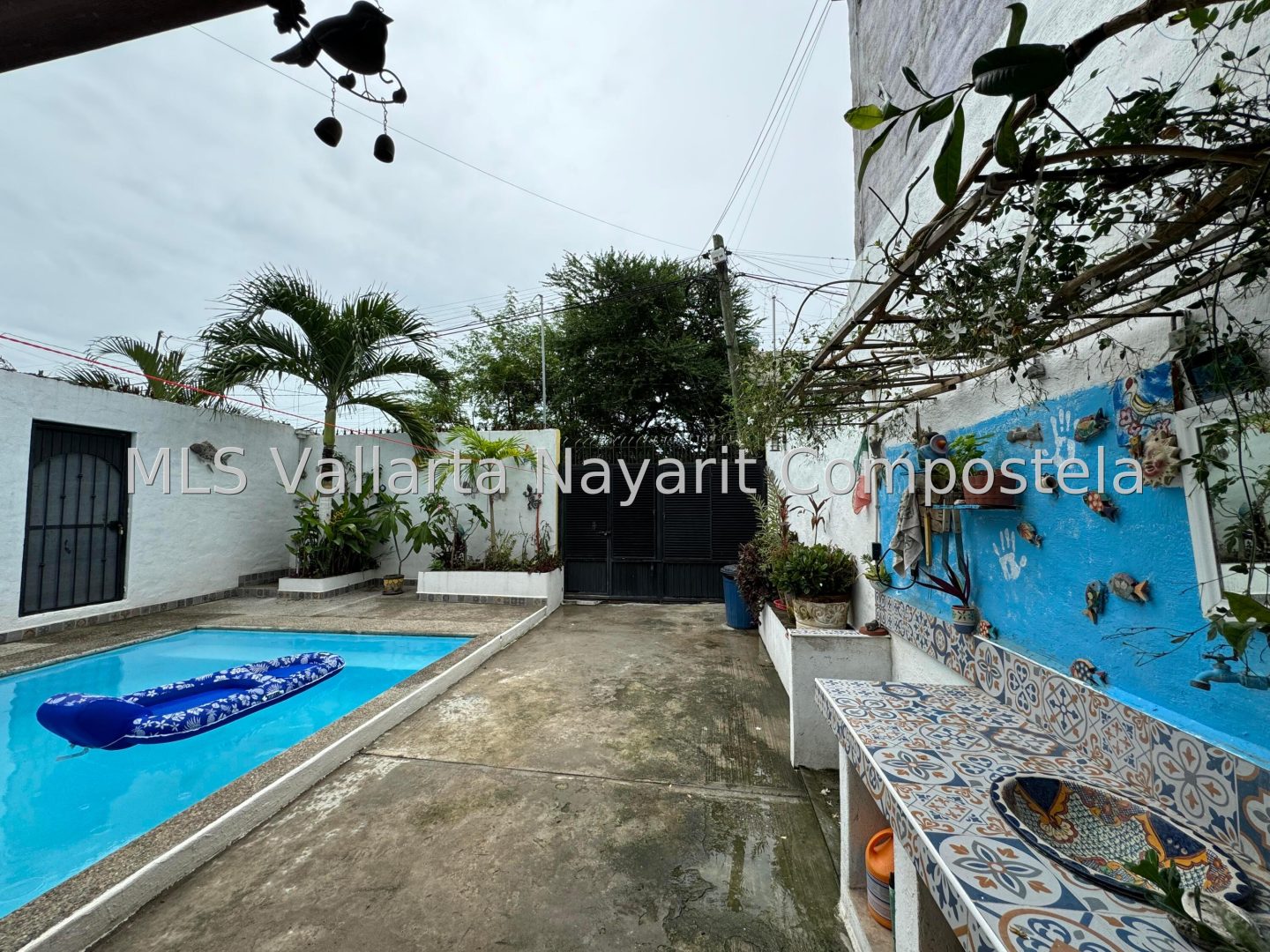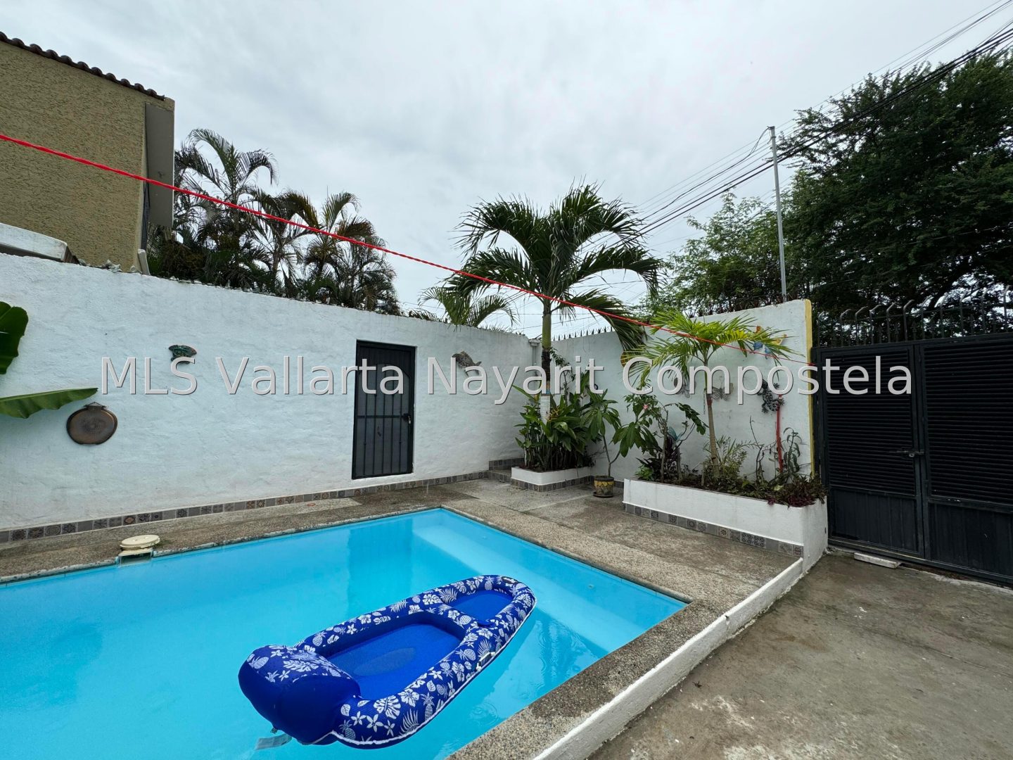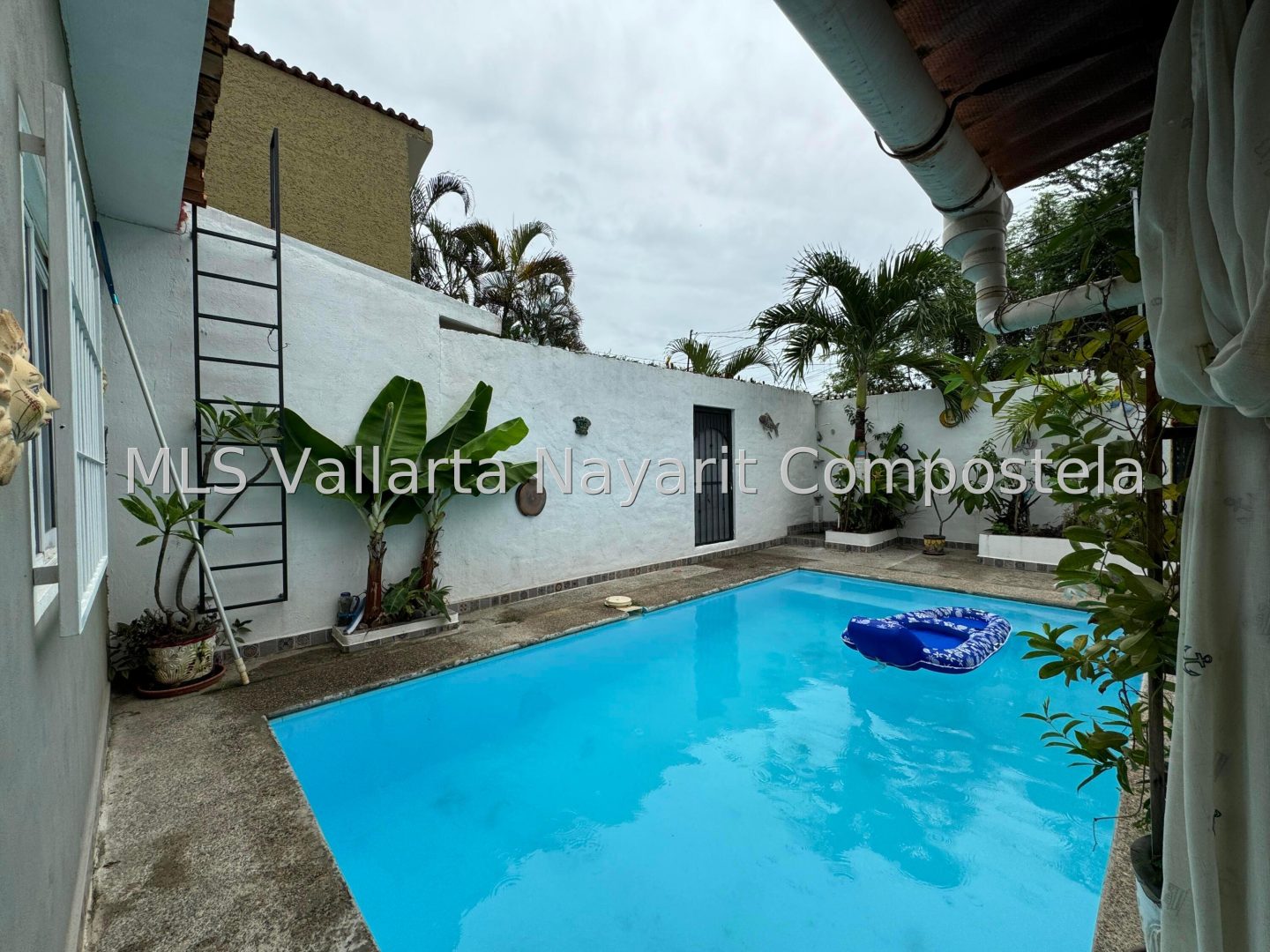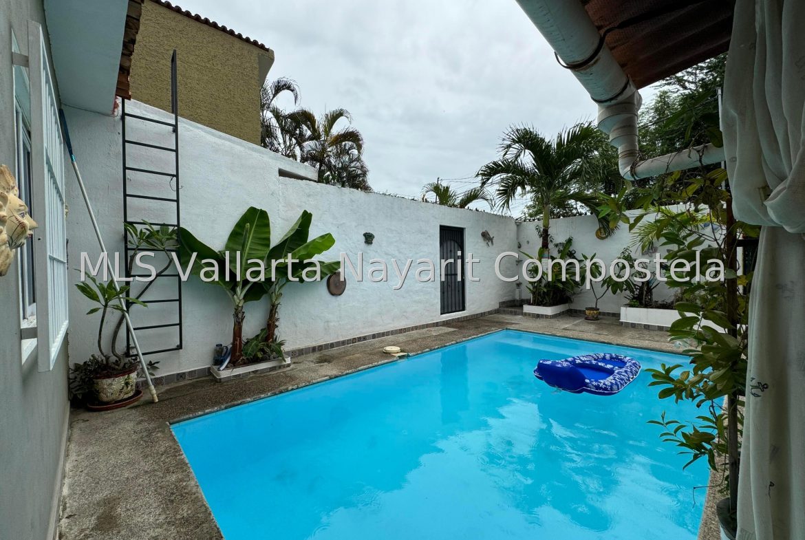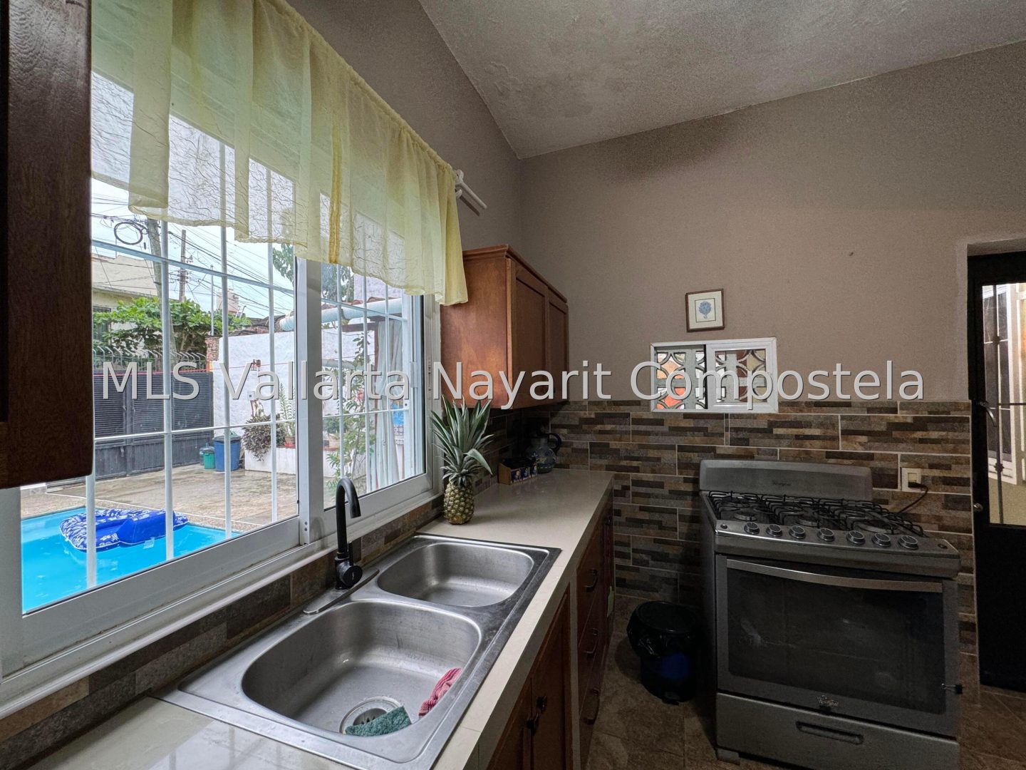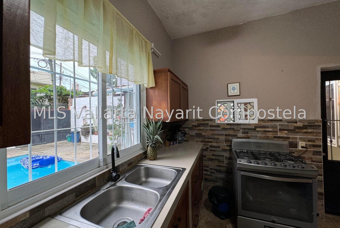 Cozy 1-story house with a private pool on Girasol Street in Bucerias, Nayarit. It has 2 bedrooms and 1 bathroom, a kitchen with a view of the pool and a small laundry area inside the house.