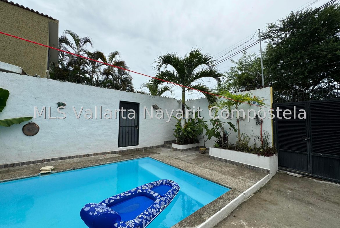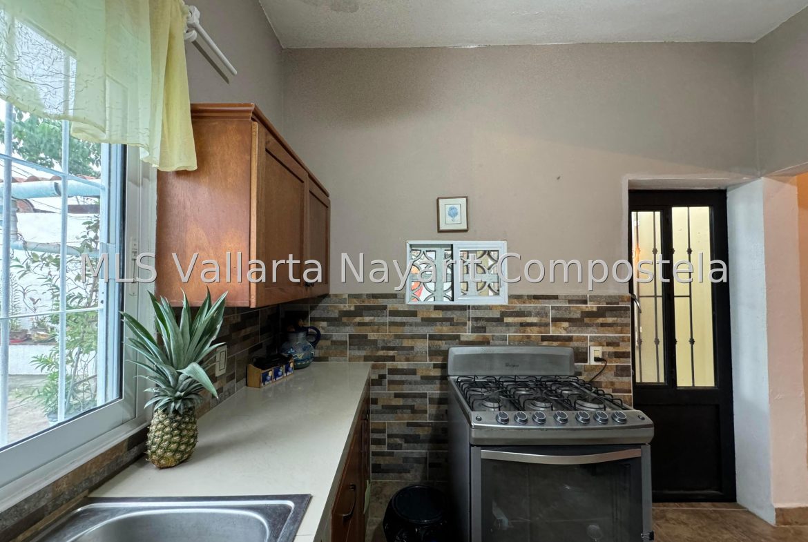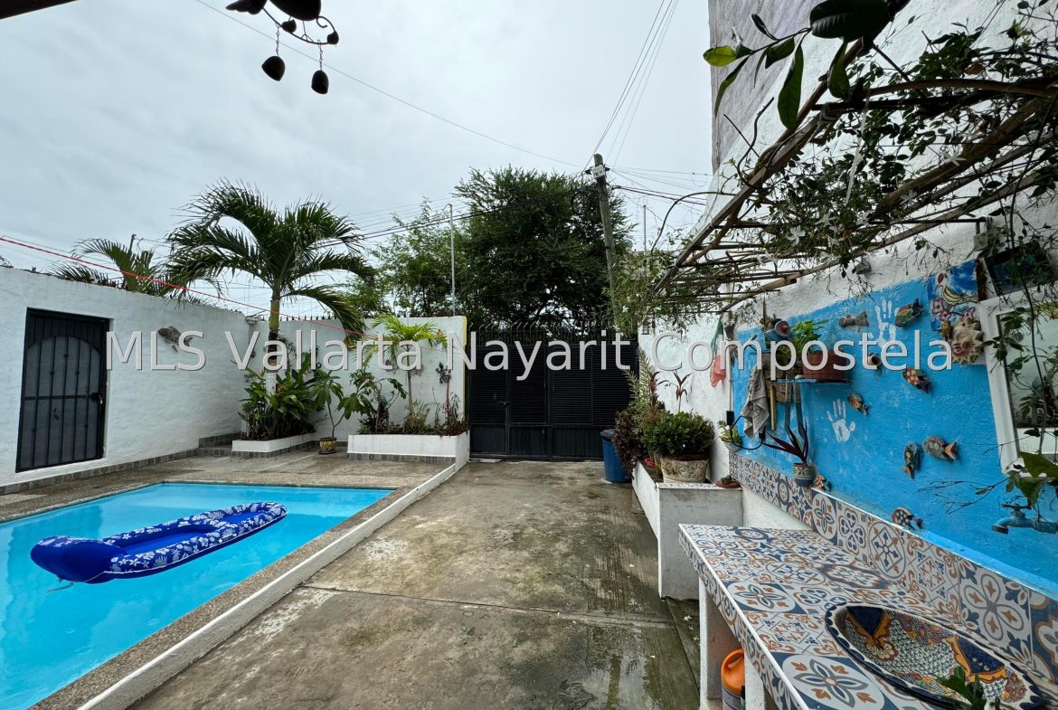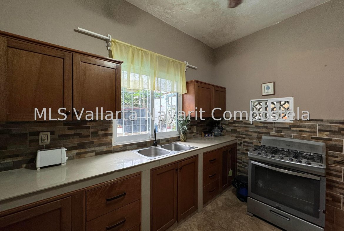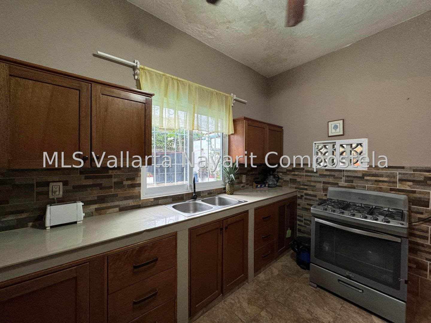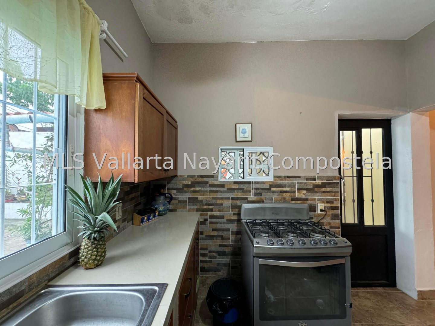 Cozy 1-story house with a private pool on Girasol Street in Bucerias, Nayarit. It has 2 bedrooms and 1 bathroom, a kitchen with a view of the pool and a small laundry area inside the house.