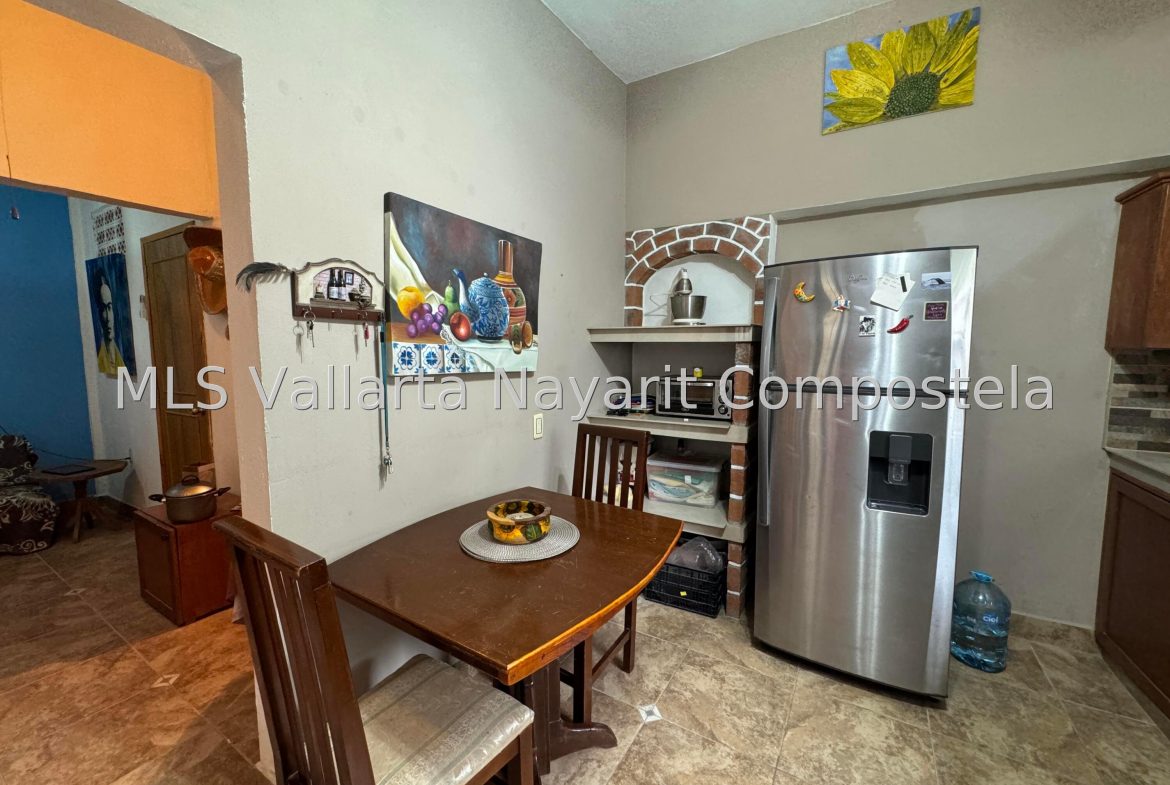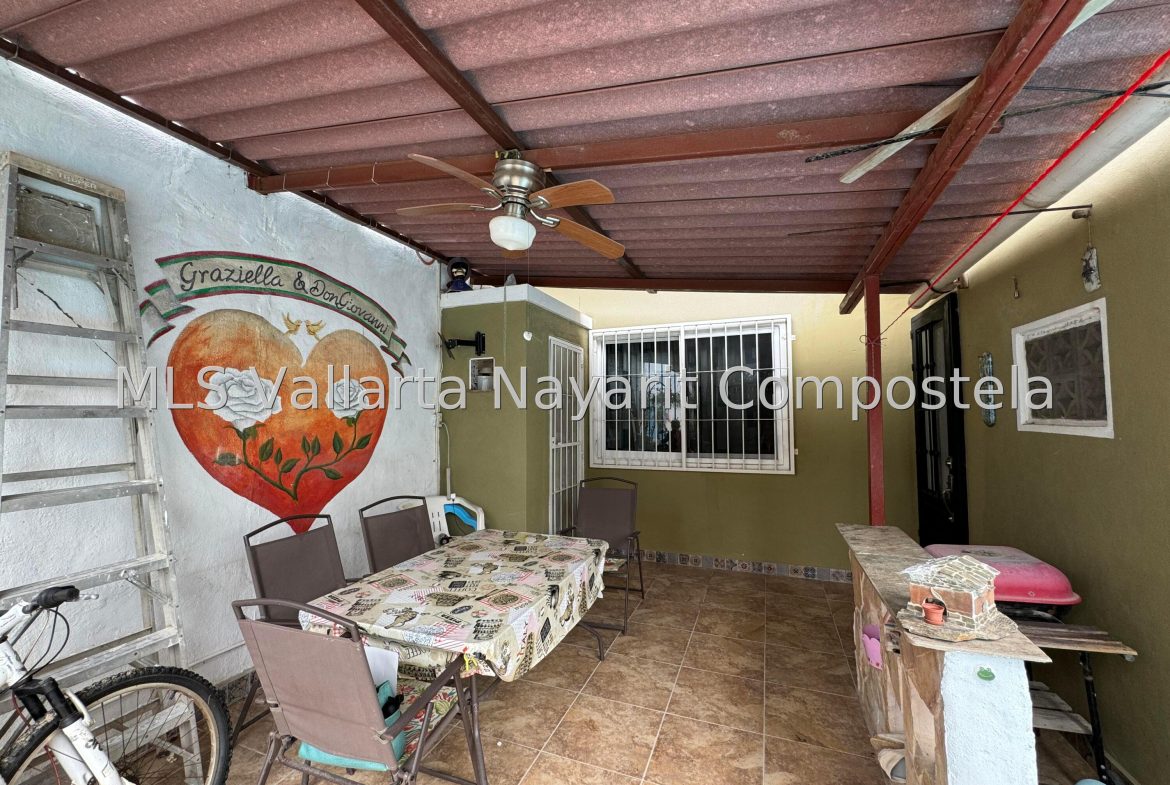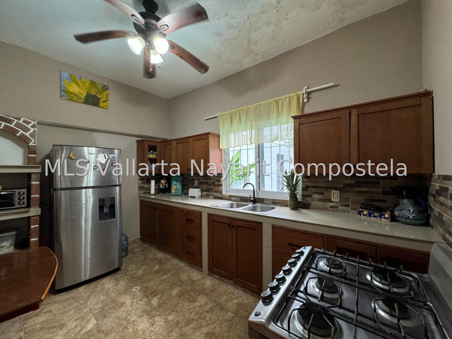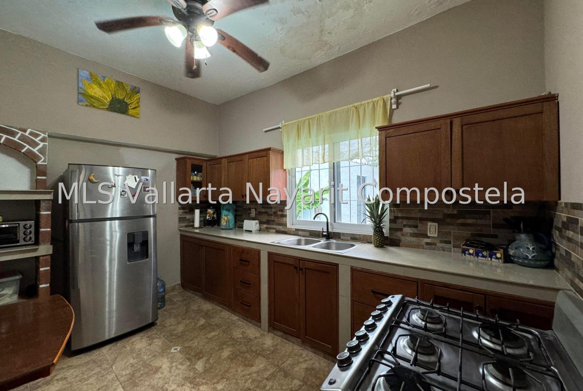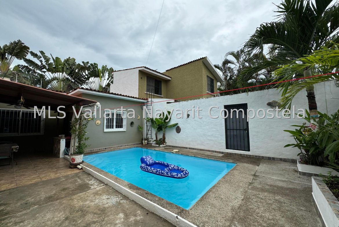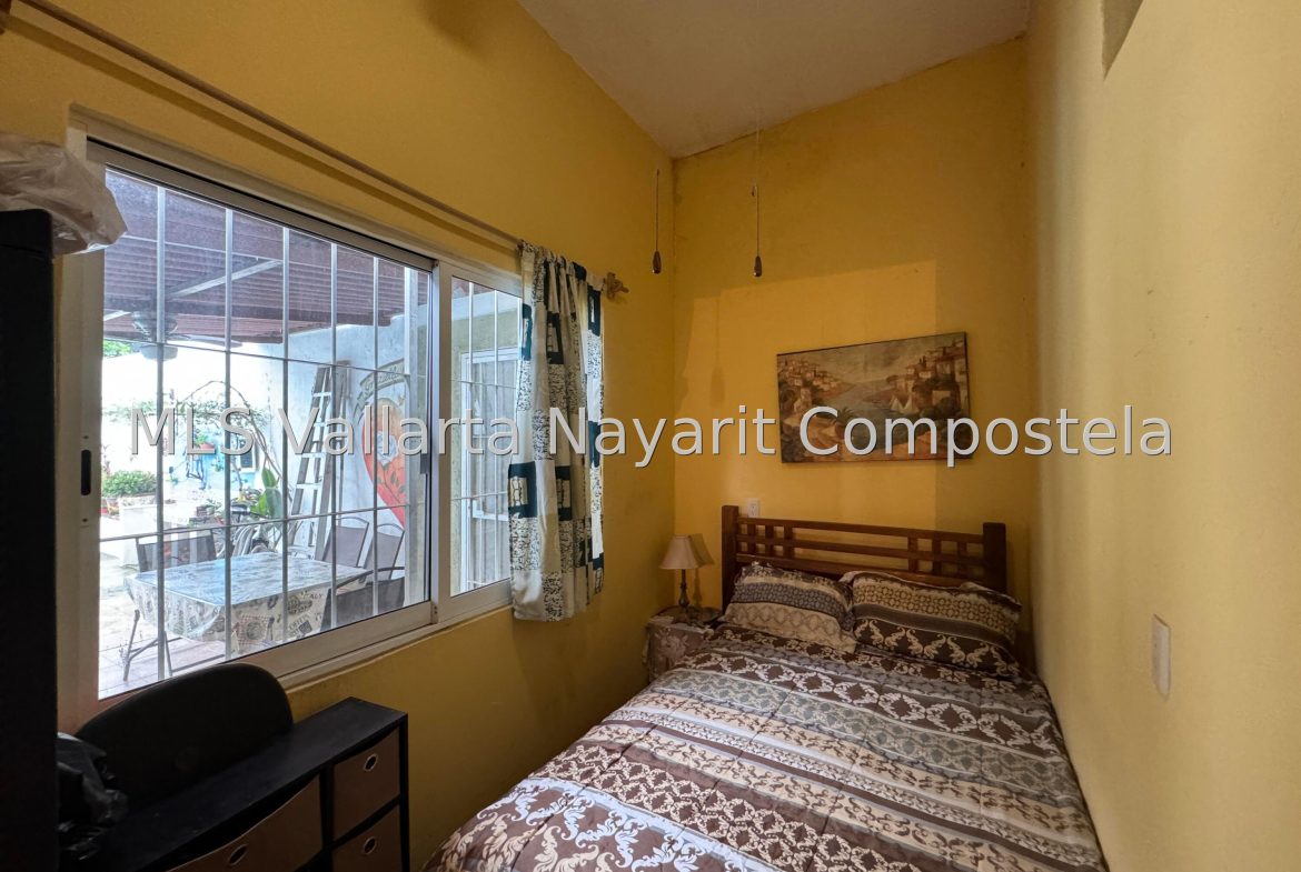 Cozy 1-story house with a private pool on Girasol Street in Bucerias, Nayarit. It has 2 bedrooms and 1 bathroom, a kitchen with a view of the pool and a small laundry area inside the house.