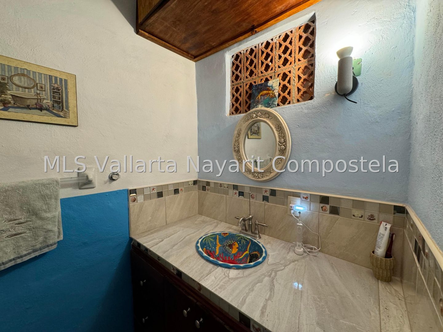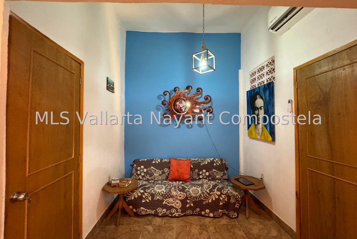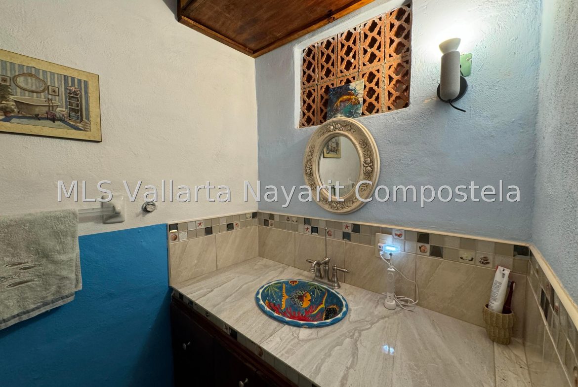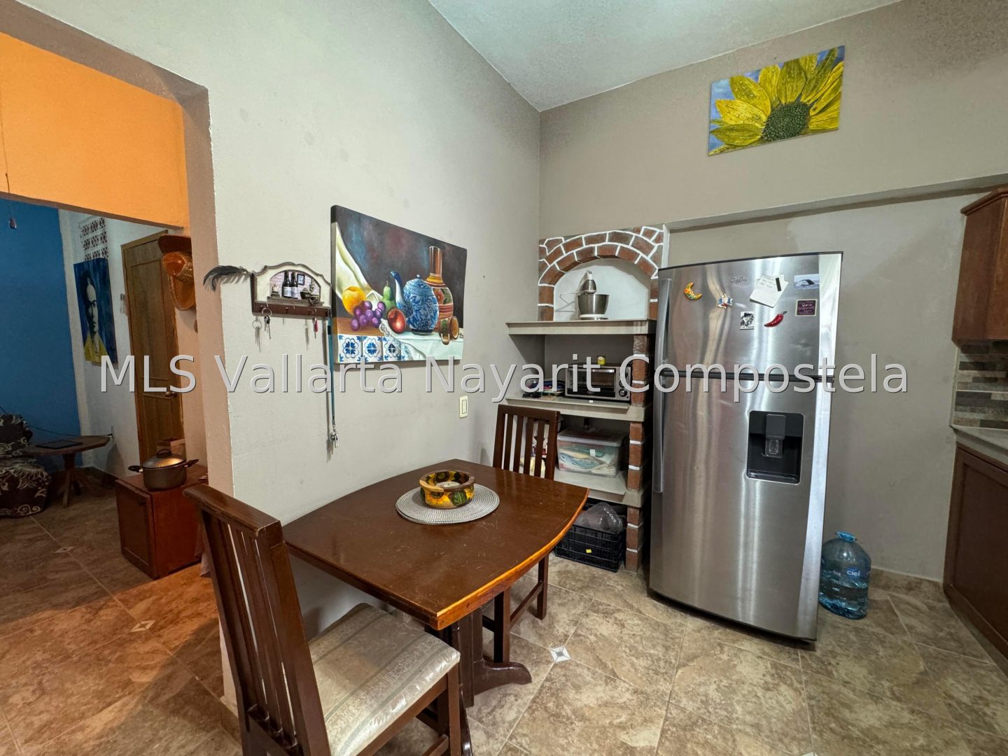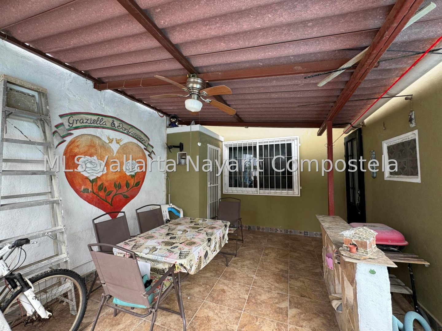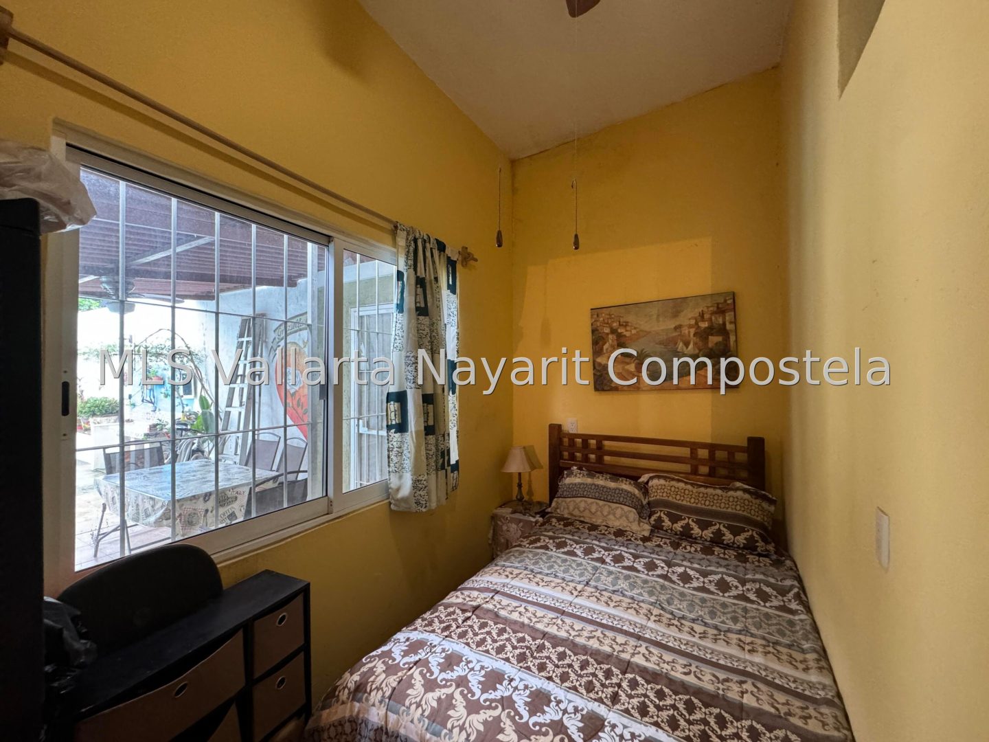 Cozy 1-story house with a private pool on Girasol Street in Bucerias, Nayarit. It has 2 bedrooms and 1 bathroom, a kitchen with a view of the pool and a small laundry area inside the house.
