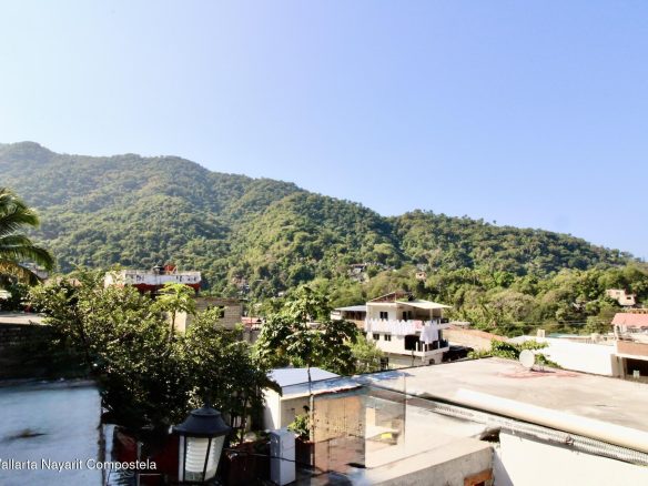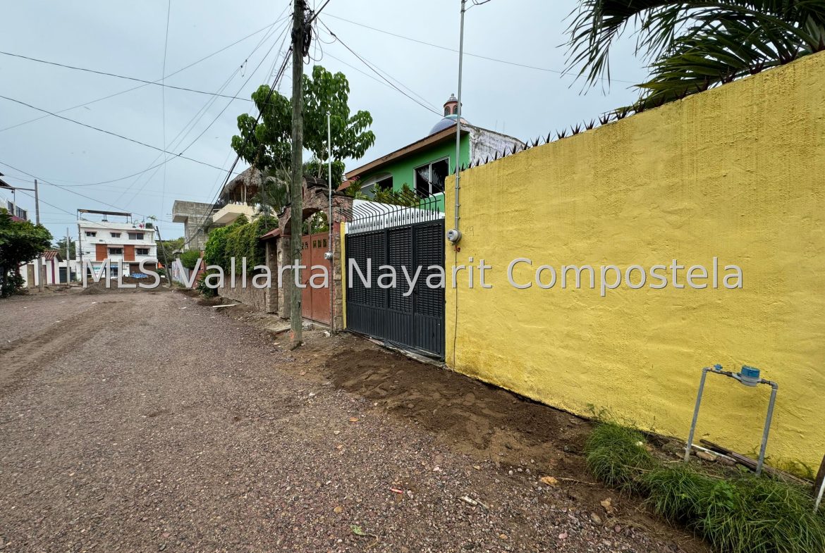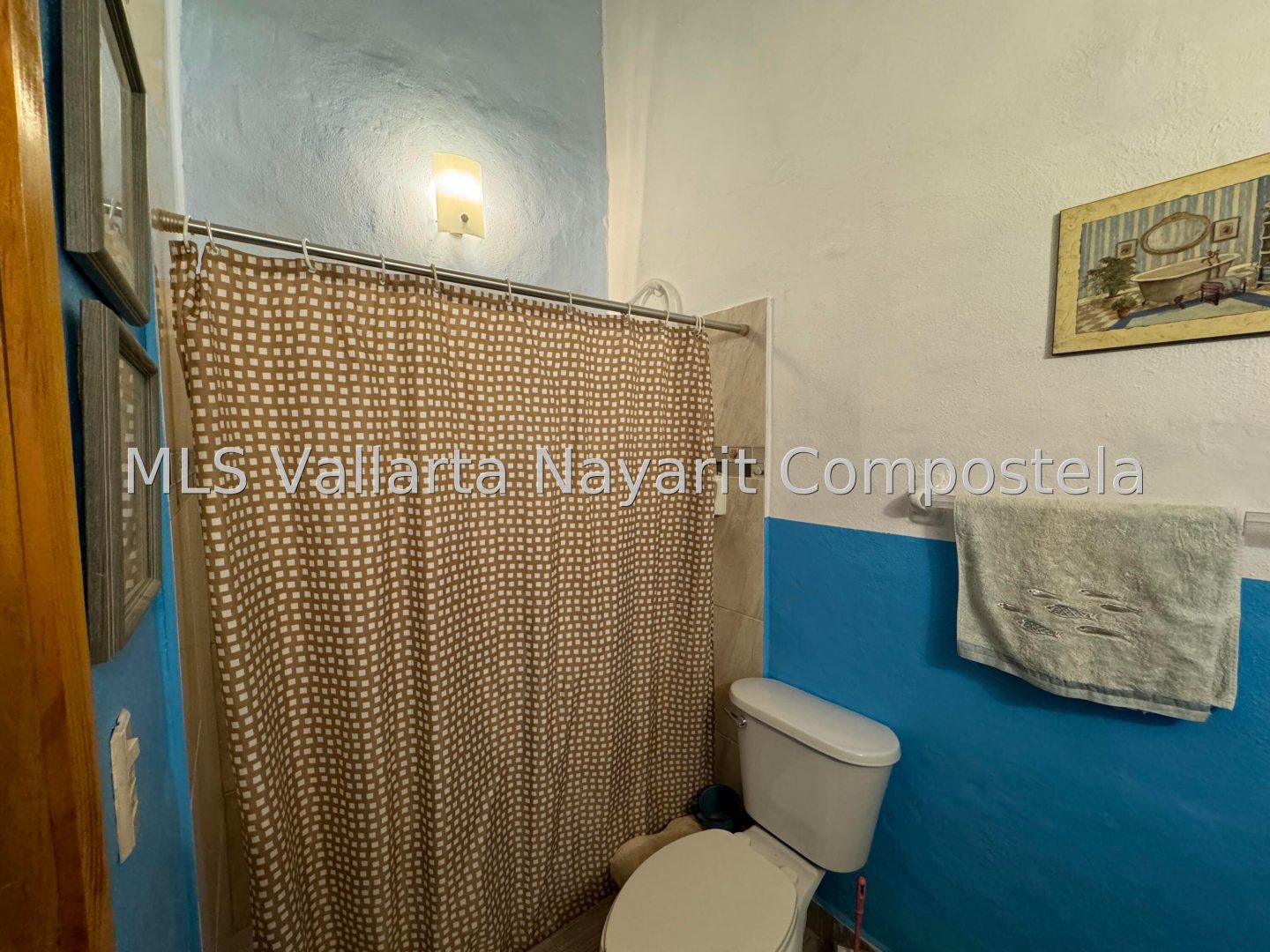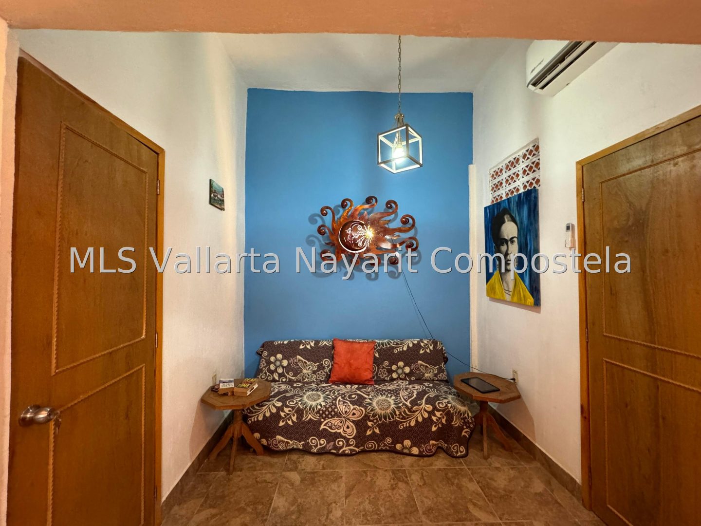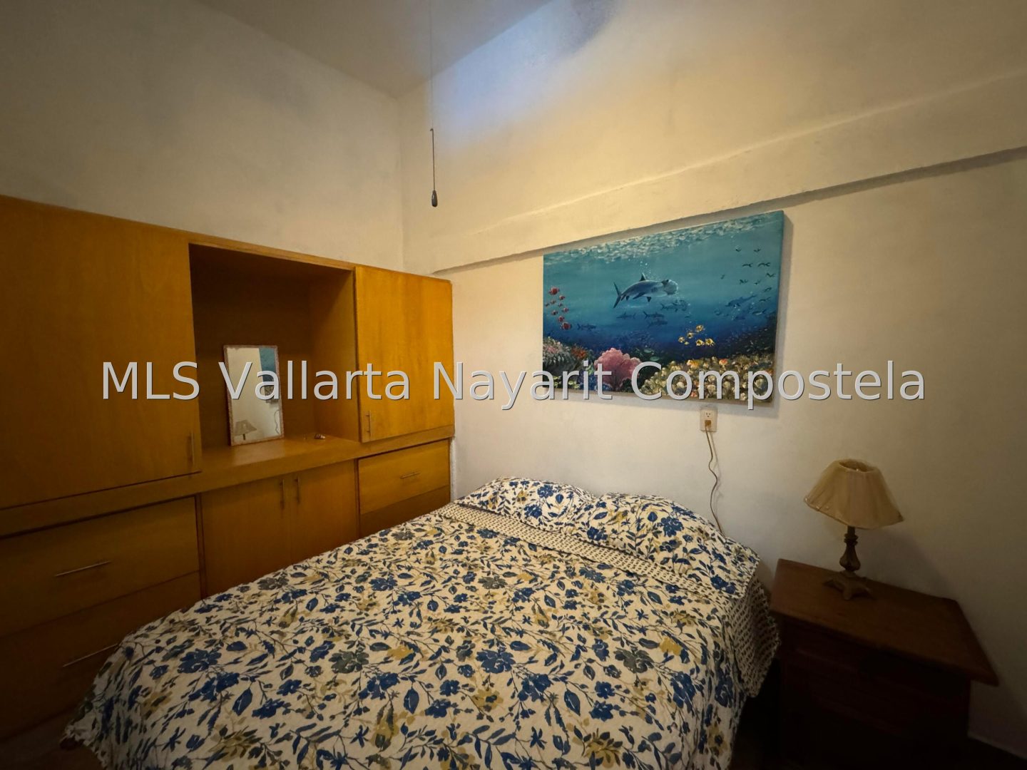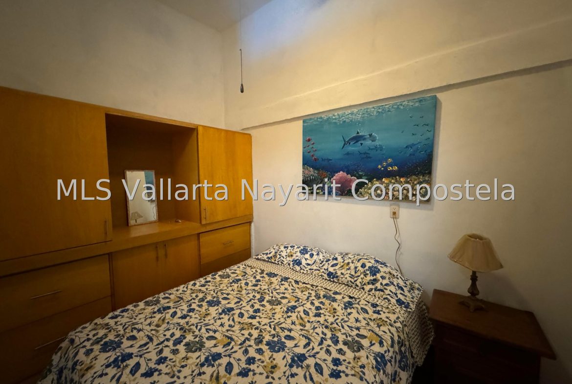 Cozy 1-story house with a private pool on Girasol Street in Bucerias, Nayarit. It has 2 bedrooms and 1 bathroom, a kitchen with a view of the pool and a small laundry area inside the house.