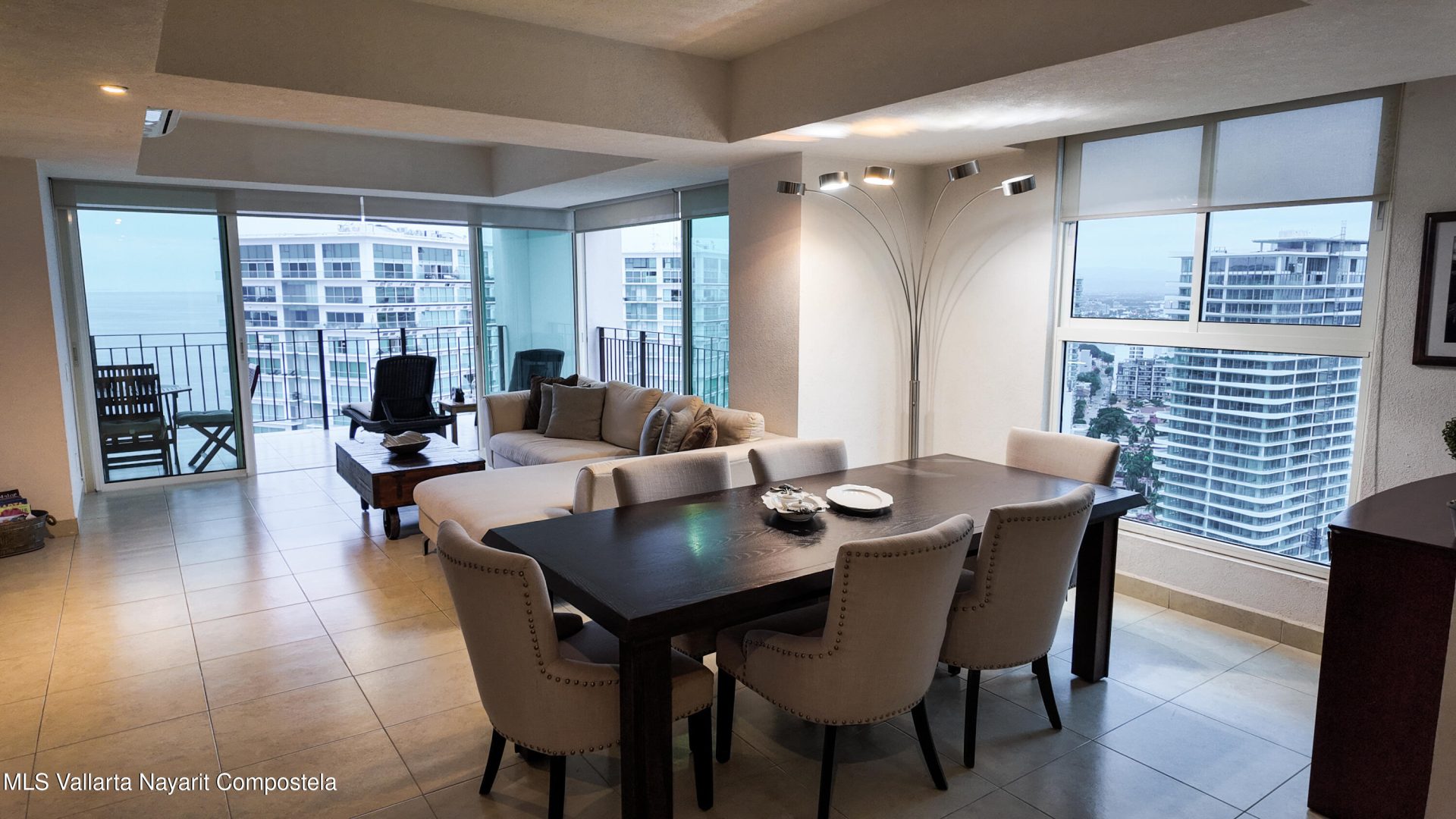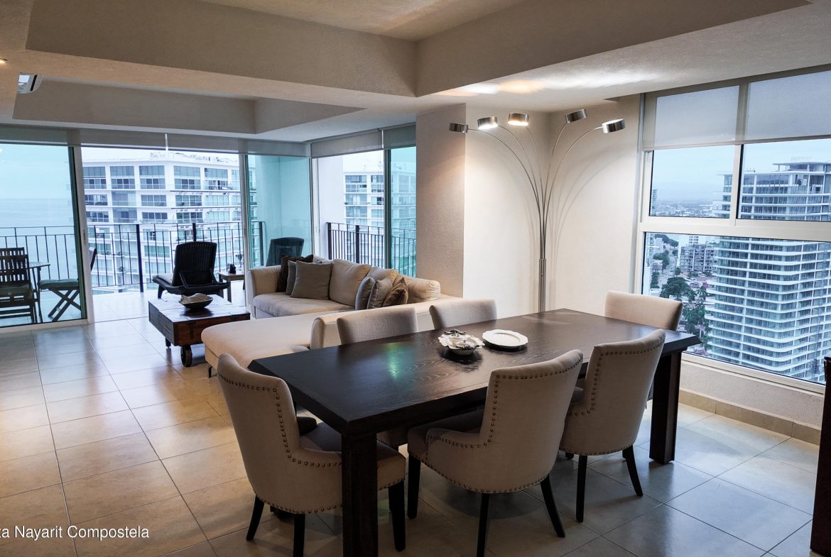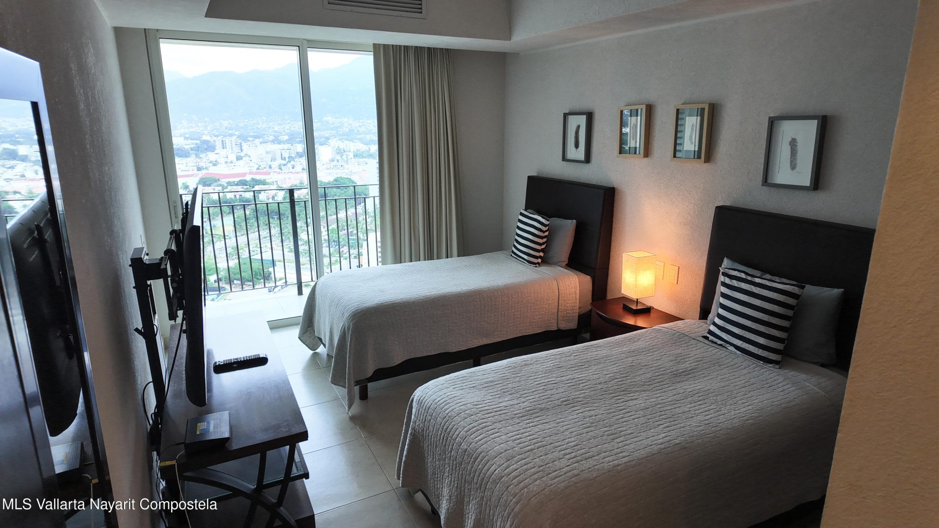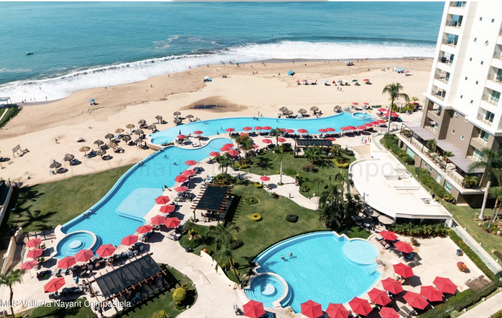 Experience elevated coastal living in this exquisite two-bedroom, two-bathroom residence perched on the 25th floor of the prestigious Grand Venetian. This luxurious oceanfront condo showcases breathtaking views of both the Pacific Ocean and El Pitillal River, beautifully framed by its expansive wraparound terrace–ideal for entertaining or unwinding against the backdrop of vibrant sunsets. The open-concept living area seamlessly integrates indoor and outdoor spaces, creating an inviting ambiance of comfort and sophistication. Each bedroom features its own private balcony, offering sweeping vistas of the city skyline and the majestic Sierra Madre mountains. Residents enjoy access to world-class, resort-style amenities, including three beachfront infinity pools, beautifully landscaped garden