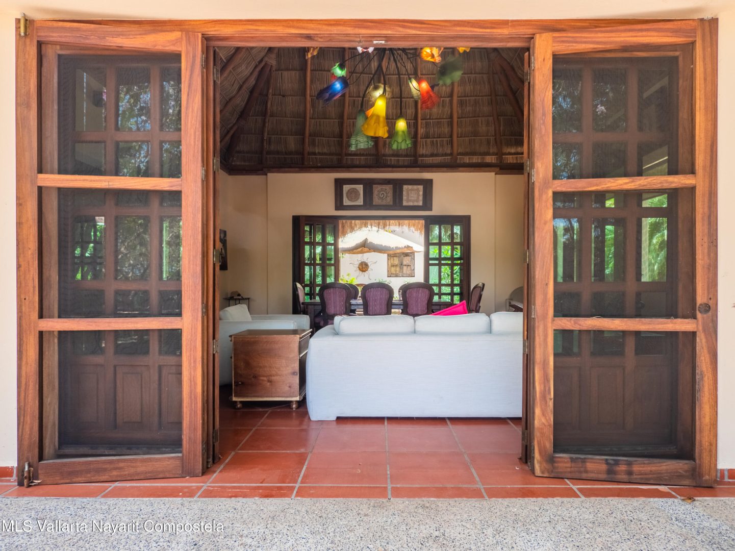 Welcome to your dream retreat in the heart of the charming beach town of Lo de Marcos. This beautifully designed six-bedroom Hacienda is just steps from the golden sands and offers a rare blend of comfort, privacy, and income potential.The main house features spacious, open-concept living areas under a stunning palapa that invites seamless indoor-outdoor living. It includes three generous bedrooms plus a bonus room that can easily serve as a fourth bedroom, office, or studio space. The rooftop lounge boasts panoramic views of the ocean and mountains–perfect for sunset cocktails or stargazing.The lush, walled property is surrounded by mature trees and vibrant gardens, offering both shade and seclusion.