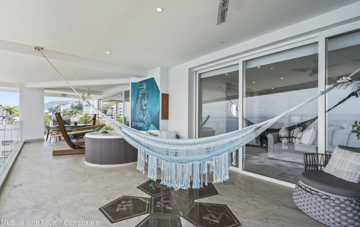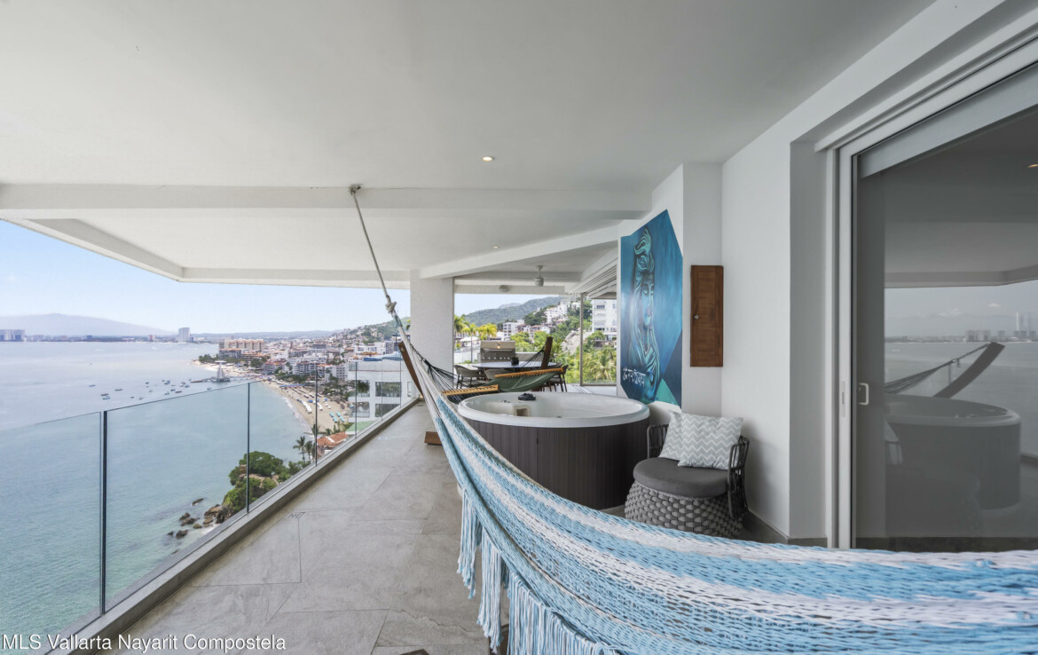 Beautiful corner 5 Bedroom PH unit located in beautiful Conchas Chinas, Puerto Vallarta most renowned area. Situated in the exclusive enclave of Conchas Chinas. framed by expansive floor to ceiling glass doors and complemented by thoughtfully curated interiors and custom furnishings. The entire south-west corner of the home vanishes with the sliding doors opening entirely to the ocean views . Each bedroom features a high-end modern feel, en-suite bathroom, enhancing providing both luxury and confort.