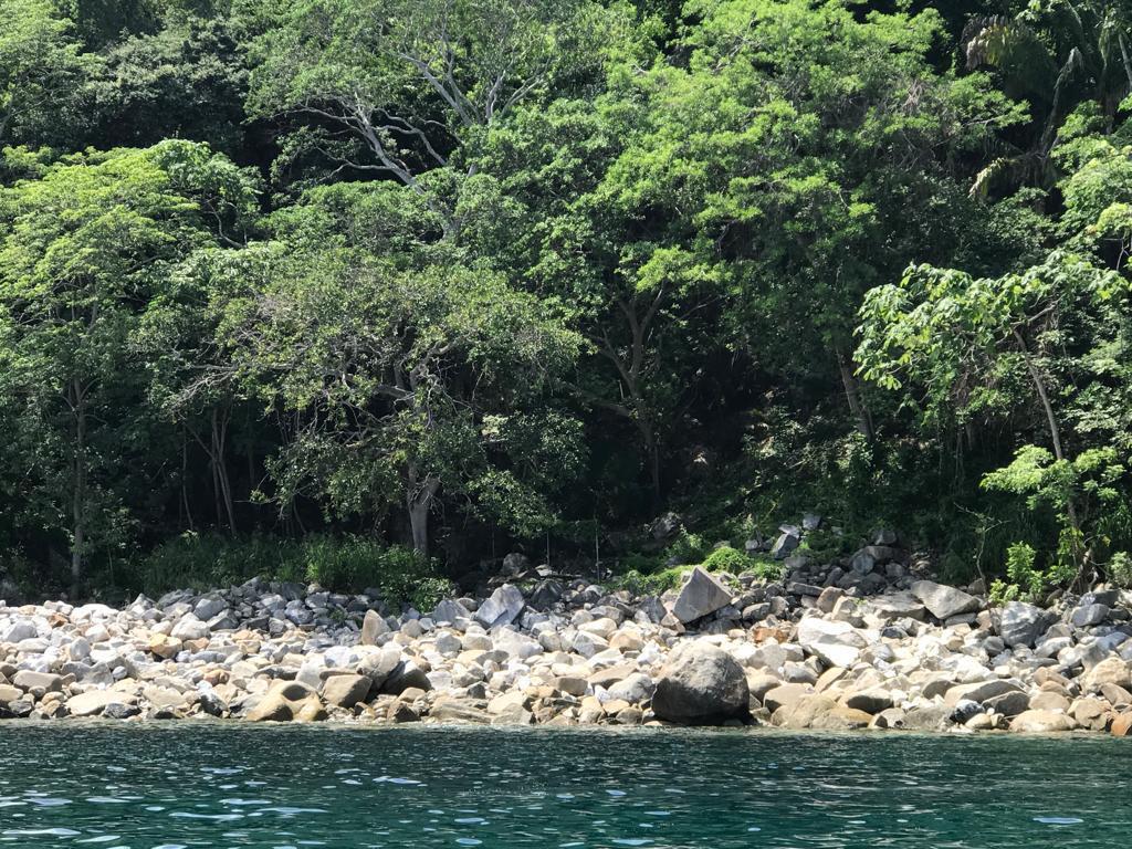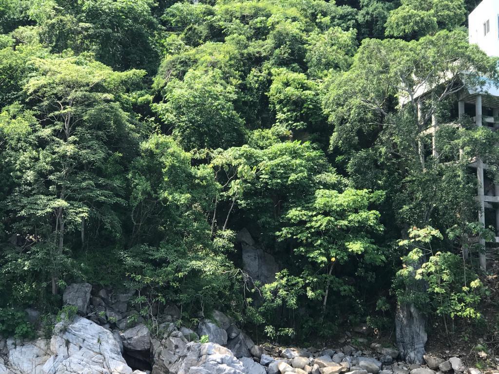 –400 sq meters atop and down a 105 foot cliff on a small bay in Mismaloya. The site sits near its mouth. –The mouth is a bit less than 300 meters from point to point and faces NW. Feels private. –Its NW point was the location for the 1964 film ”Night of the Iguana”. –The beach below is rocky with a large boulder that breaks the water. –Water is crystal clear. –Mountains rise immediately on east side of the two lane highway and gives late morning shade. –A 300 meter walk to a large fully sanded beach at the Playa Mismaloya with covered stalls of restaurants, massage, kayaking, and drinks. Perfect for building a beautiful, unique and private water home villa or if you are an investor or developer a nice boutique condo building.