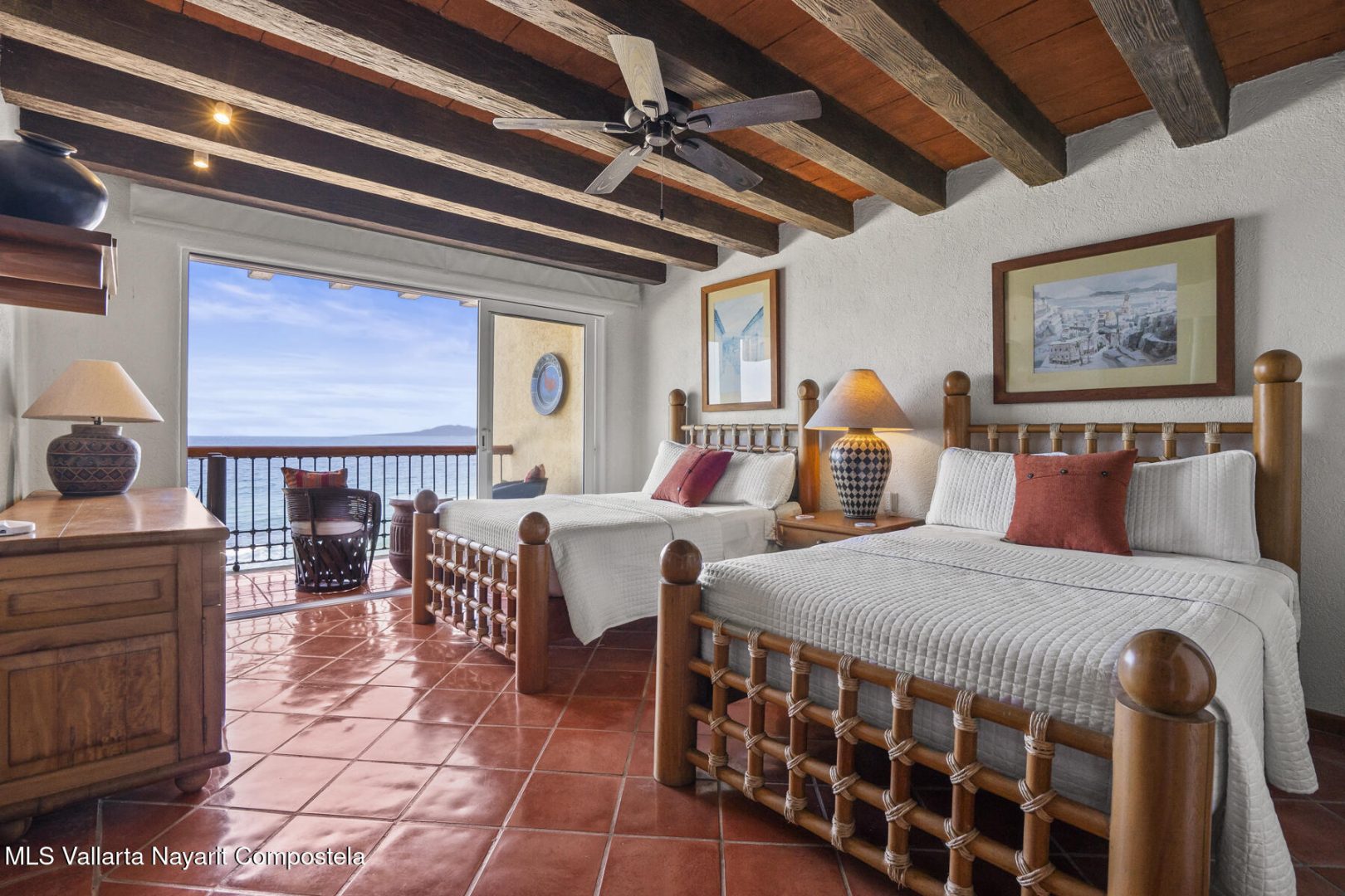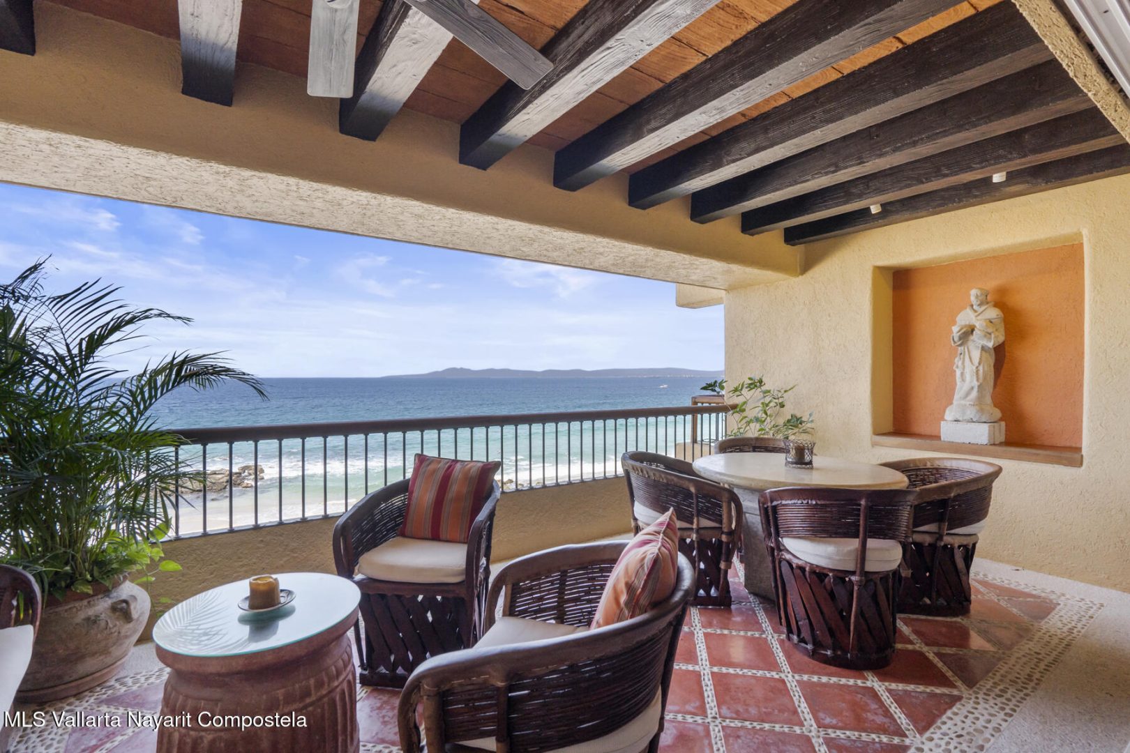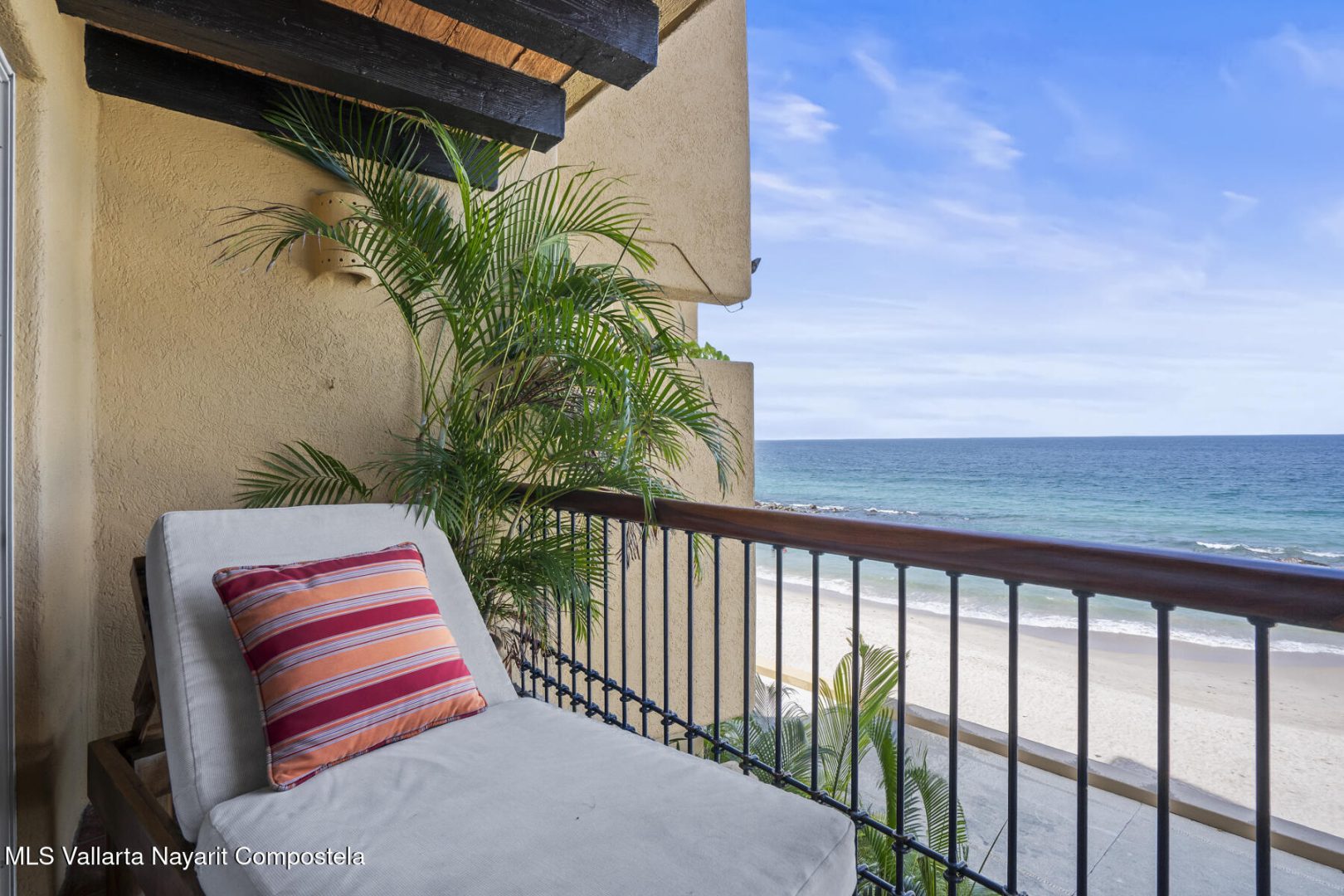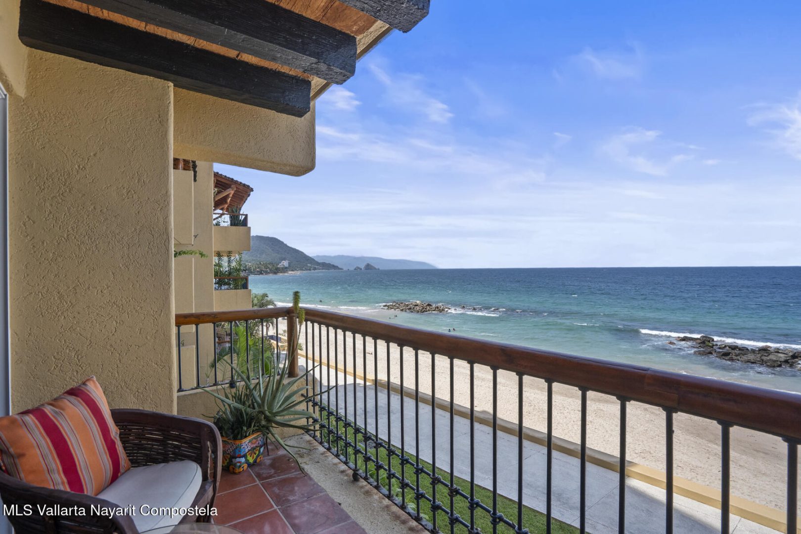Residence 302 showcases timeless old-world Vallarta architecture with warm tones and quality finishes, including Saltillo tile flooring, solid tropical wood cabinetry, and exposed wooden beams that enhance its open-concept living spaces. The recently remodeled kitchen blends modern design with traditional Vallarta style, offering both functionality and harmony with the home’s original character. Both en-suite bedrooms feature private balconies with stunning views of the beach, Banderas Bay, Los Arcos, and the Sierra Madre Mountains. Common areas include a palapa Restaurant gym, lush gardens, and a large infinity pool, kids pool and a jacuzzi with access to the white sand beach.