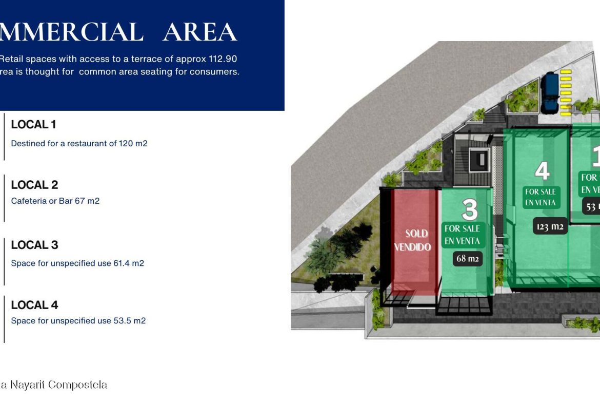 Situated within the esteemed MEE-TAH Luxury Condos complex in Punta de Mita, Riviera Nayarit, this commercial unit is poised to be a prime restaurant location. Available at a preconstruction price of 5’250,000 MXN, the space offers future restaurateurs an opportunity to thrive in a sought-after community. Punta de Mita is renowned for its breathtaking ocean views, vibrant local culture, and affluent resident and tourist base. Being part of the MEE-TAH complex ensures synergy with the upscale residences and guarantees foot traffic. The area is known for its culinary scene, luxurious resorts, and beautiful beaches, making this a perfect spot for a restaurant aiming to serve both locals and tourists.