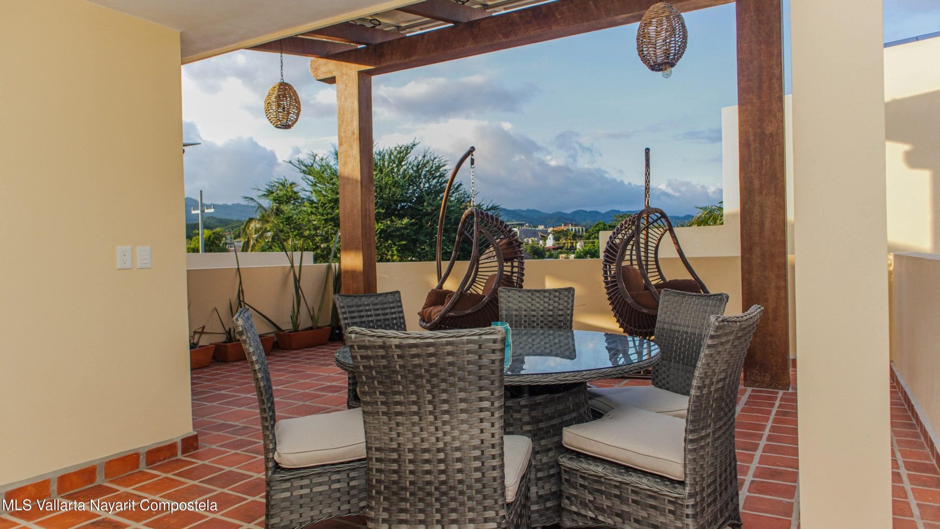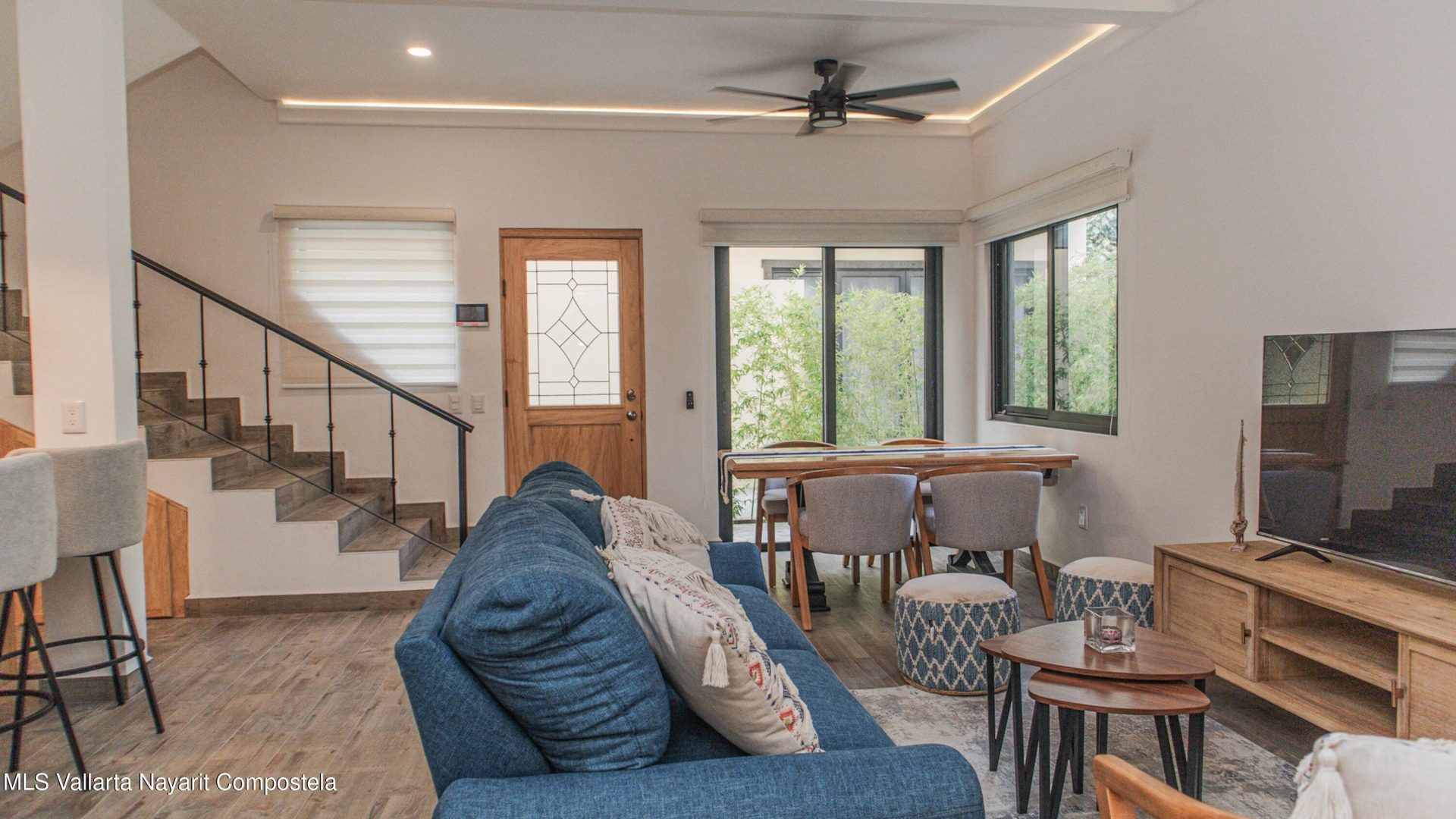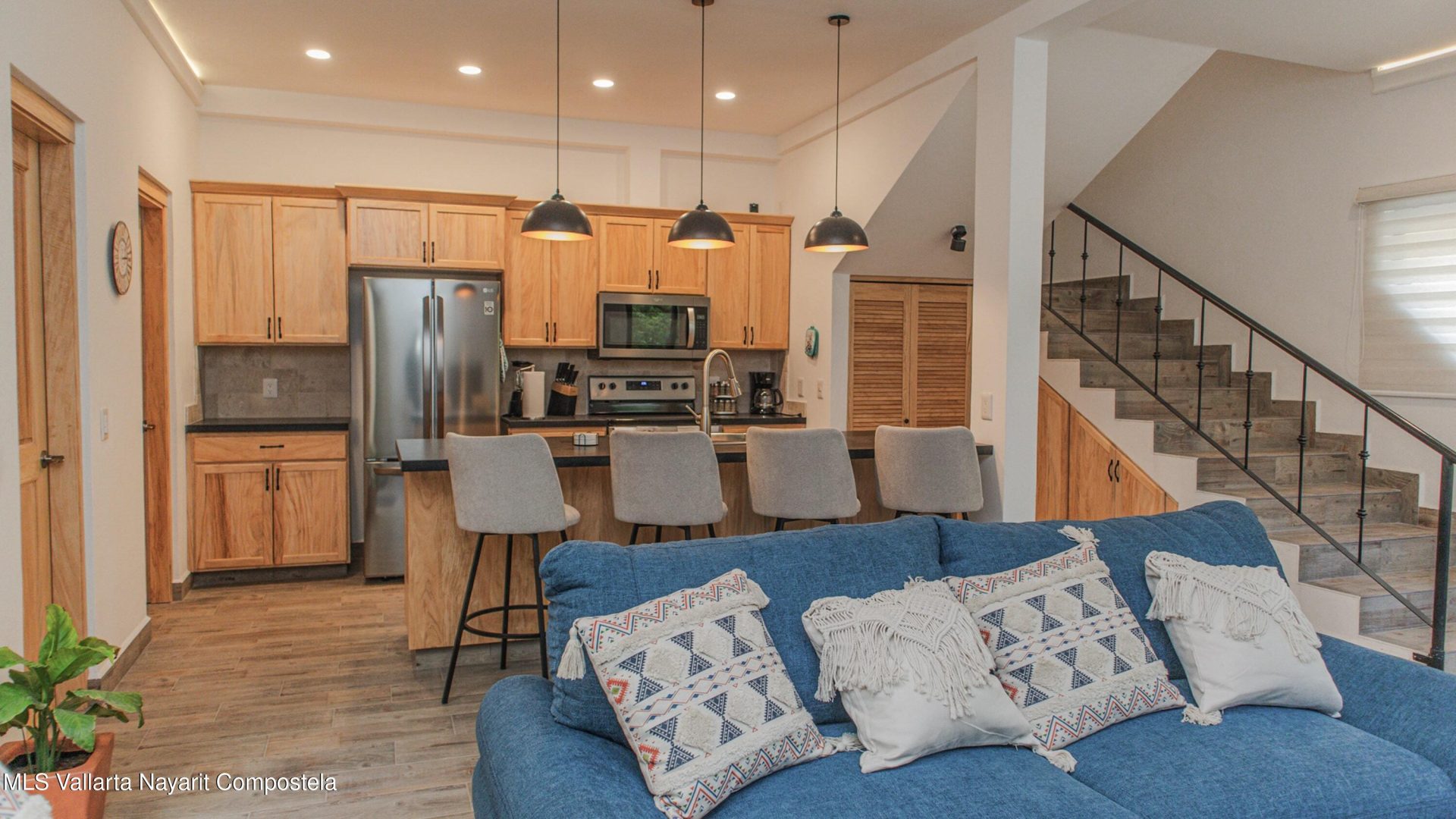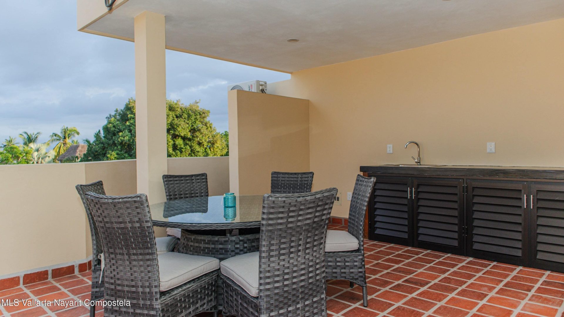 Casa Azul is a boutique 2-bed/2.5-bath home in a gated 9-unit community, just 3 blocks from La Cruz Marina and beach. Features include a private garage, full kitchen, laundry, and solar panels for low CFE bills. The highlight is the rooftop terrace with kitchenette, shaded lounge, and sweeping views. Common amenities: heated pool, palapa, outdoor kitchen, keypad entry.Casa Azul es una casa de 2 recamaras y 2.5 banos en condominio exclusivo de 9 unidades, a solo 3 cuadras de la marina y playa de La Cruz. Con cochera, cocina equipada, lavanderia y paneles solares. Roof garden con terraza, cocineta y vistas panoramicas. Areas comunes: alberca climatizada, palapa, cocina exterior y acceso con codigo.