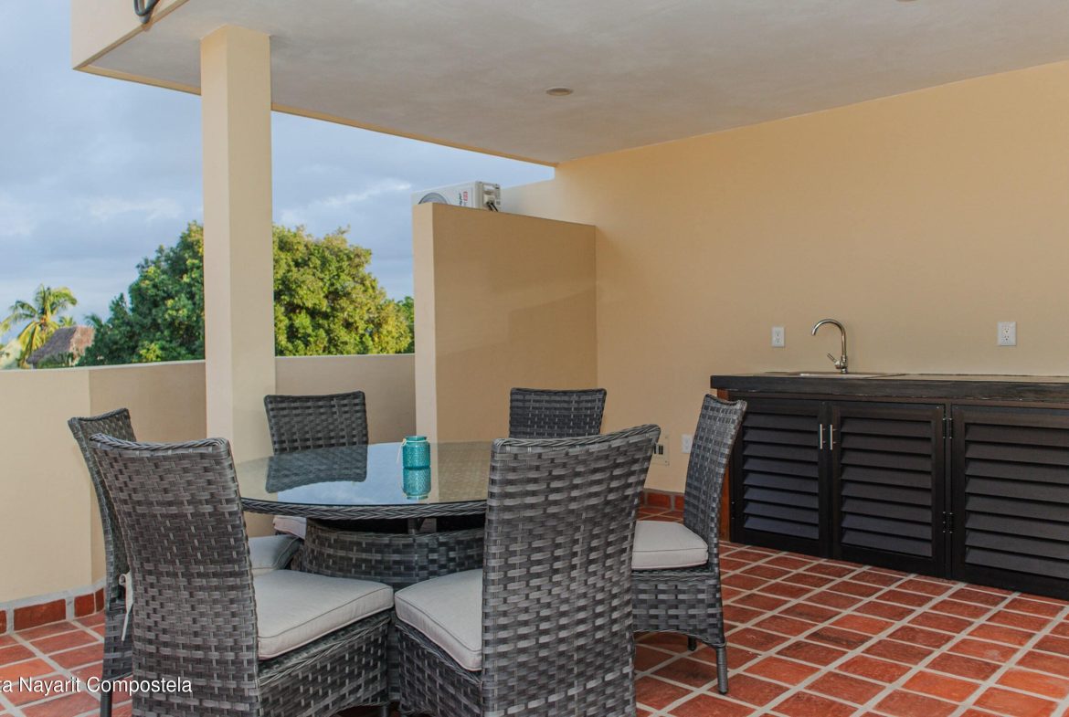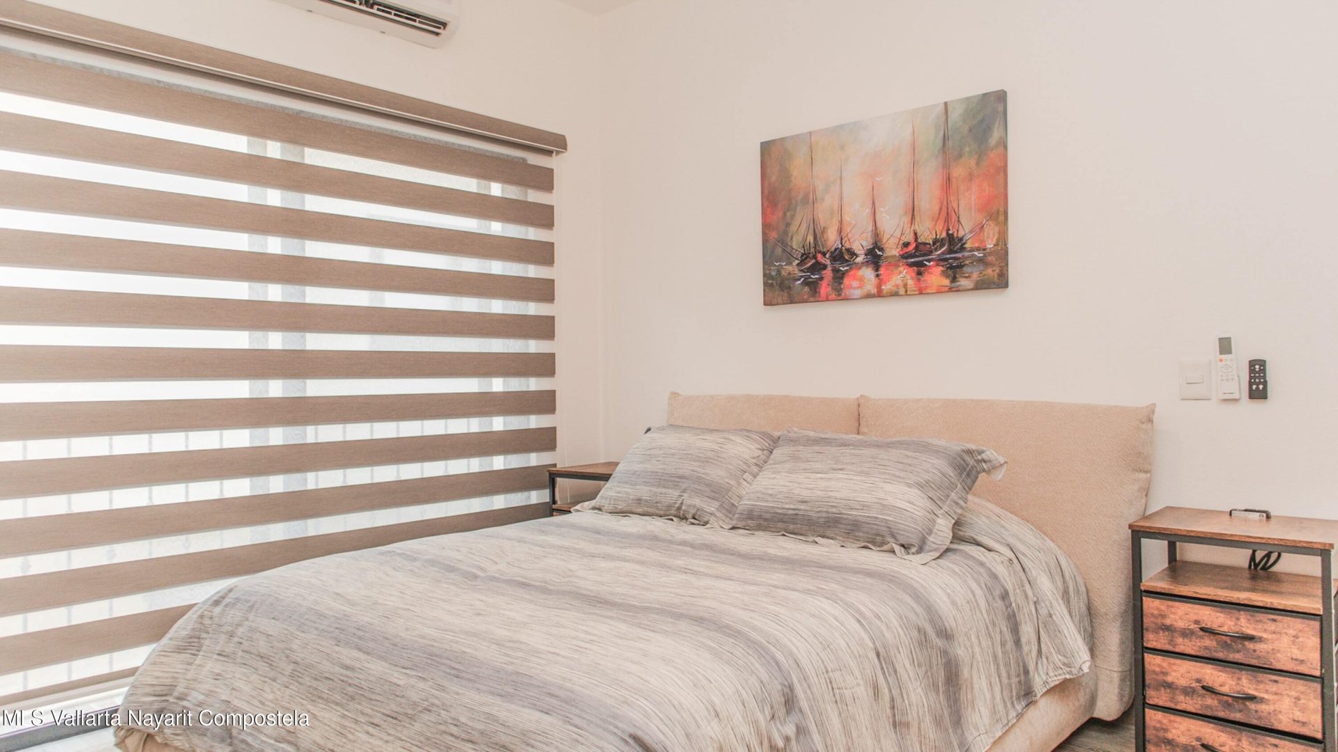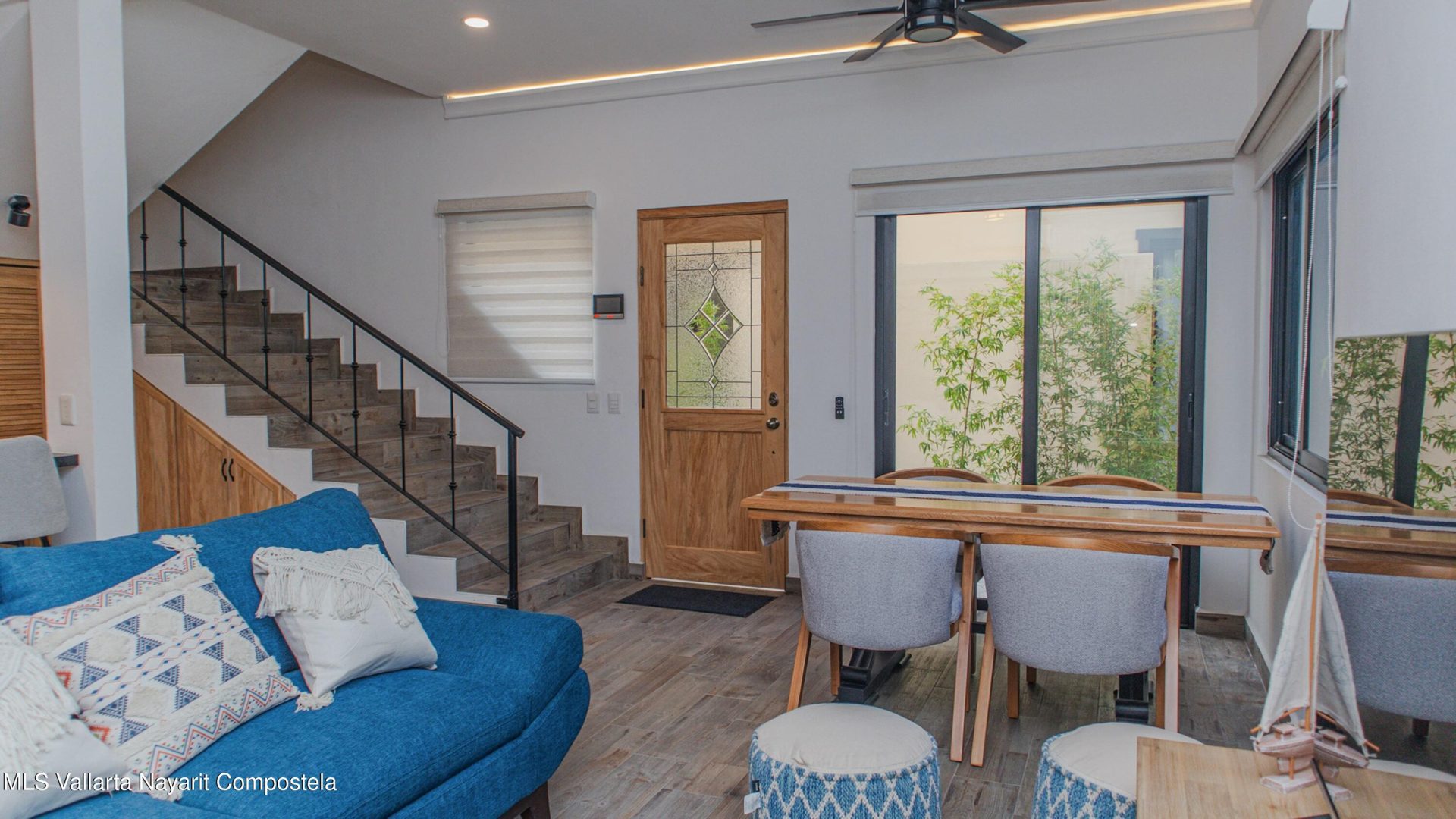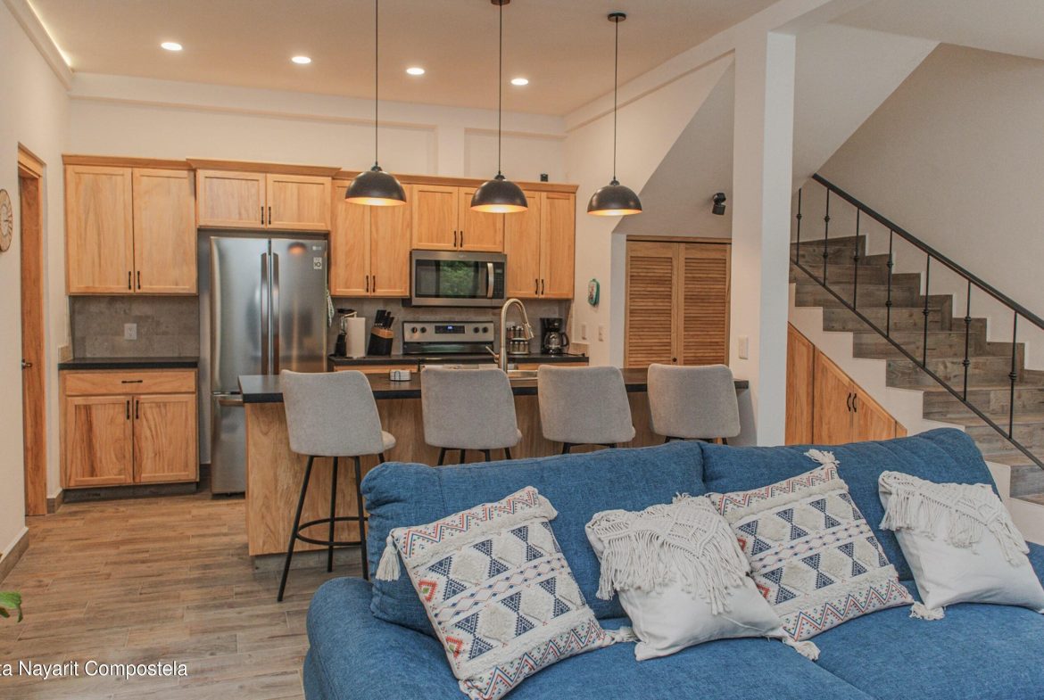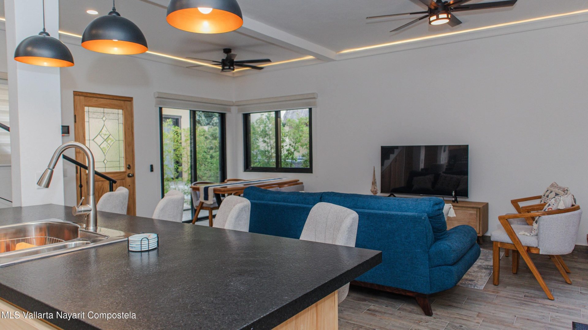 Casa Azul is a boutique 2-bed/2.5-bath home in a gated 9-unit community, just 3 blocks from La Cruz Marina and beach. Features include a private garage, full kitchen, laundry, and solar panels for low CFE bills. The highlight is the rooftop terrace with kitchenette, shaded lounge, and sweeping views. Common amenities: heated pool, palapa, outdoor kitchen, keypad entry.Casa Azul es una casa de 2 recamaras y 2.5 banos en condominio exclusivo de 9 unidades, a solo 3 cuadras de la marina y playa de La Cruz. Con cochera, cocina equipada, lavanderia y paneles solares. Roof garden con terraza, cocineta y vistas panoramicas. Areas comunes: alberca climatizada, palapa, cocina exterior y acceso con codigo.