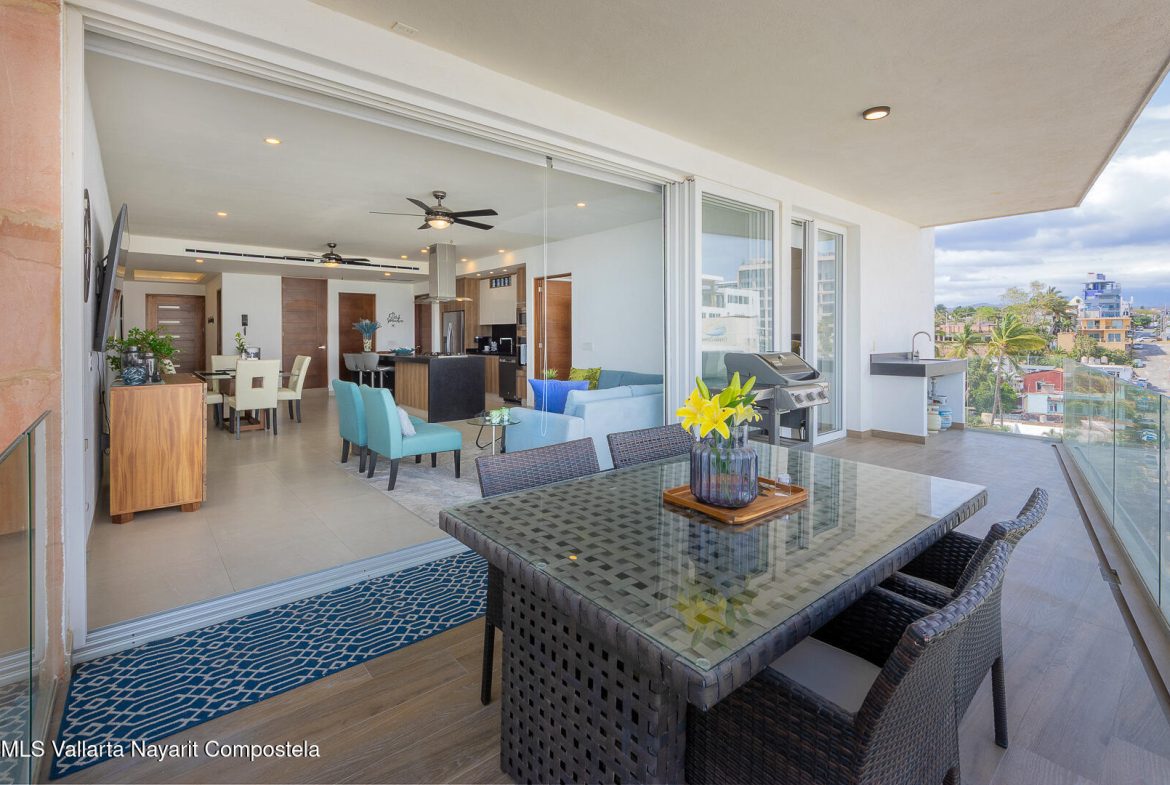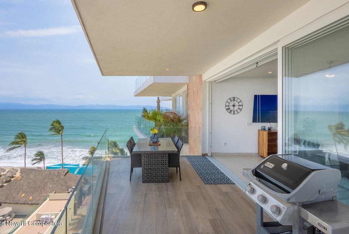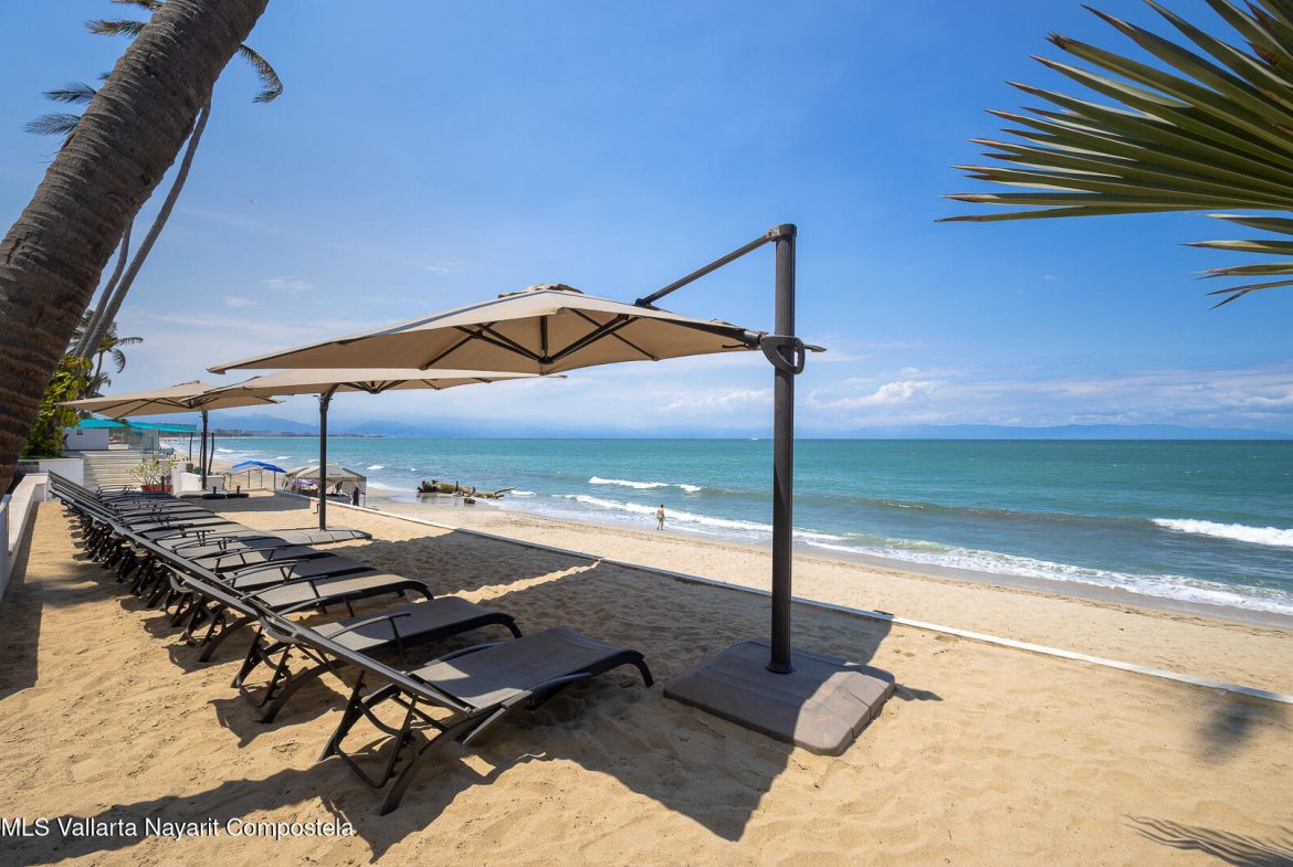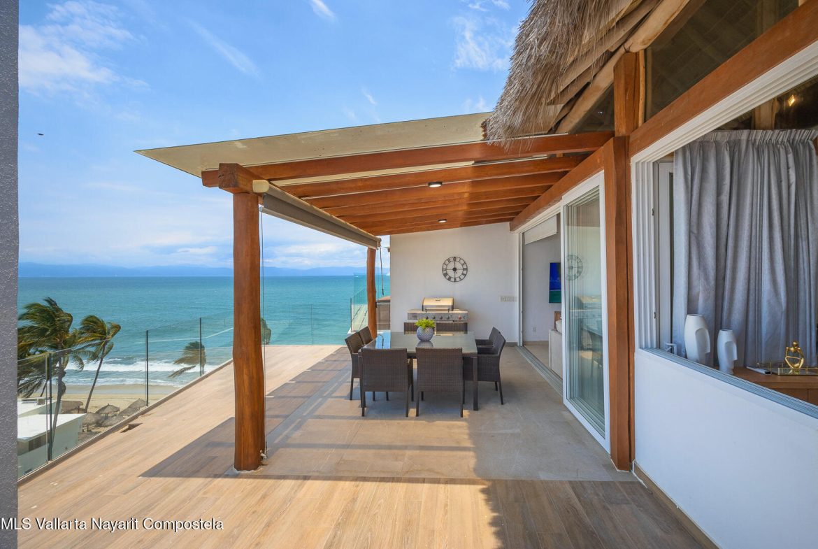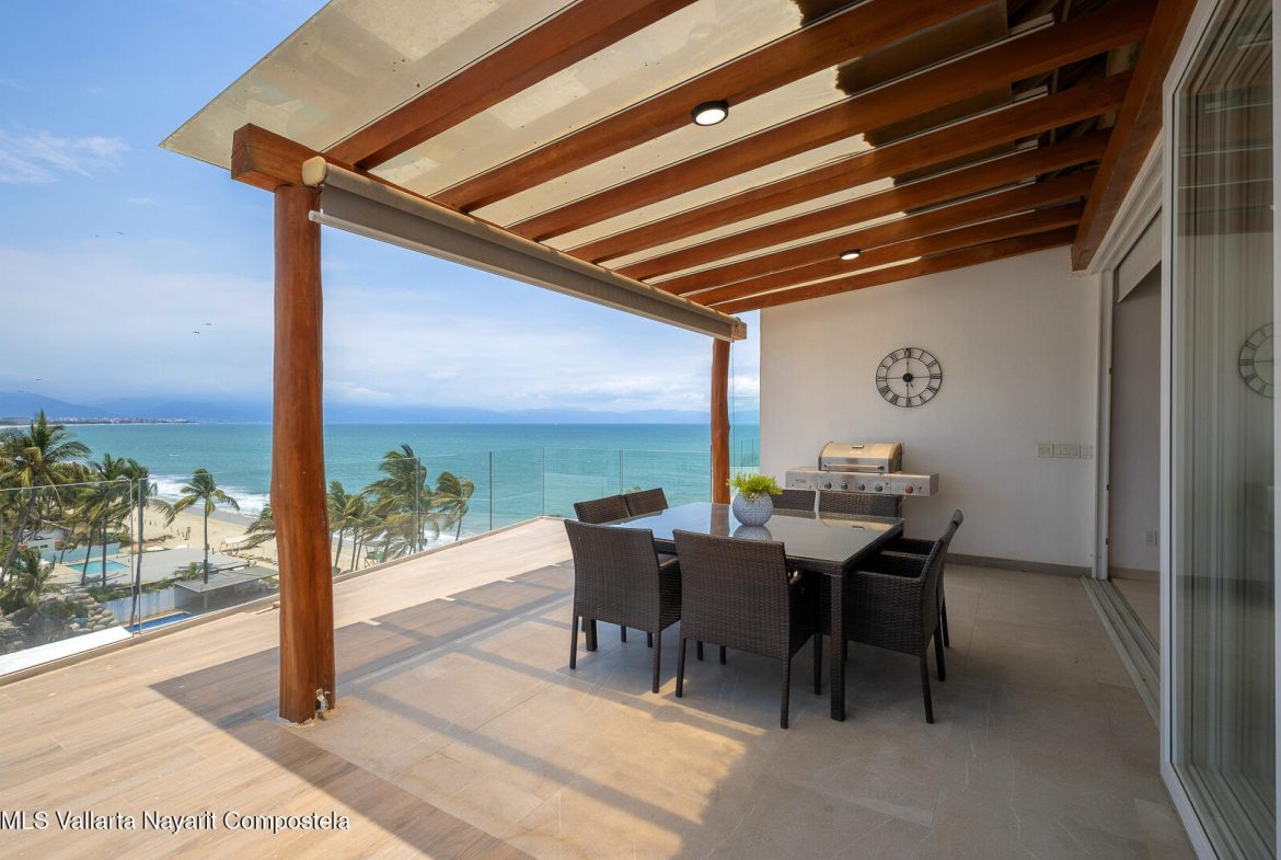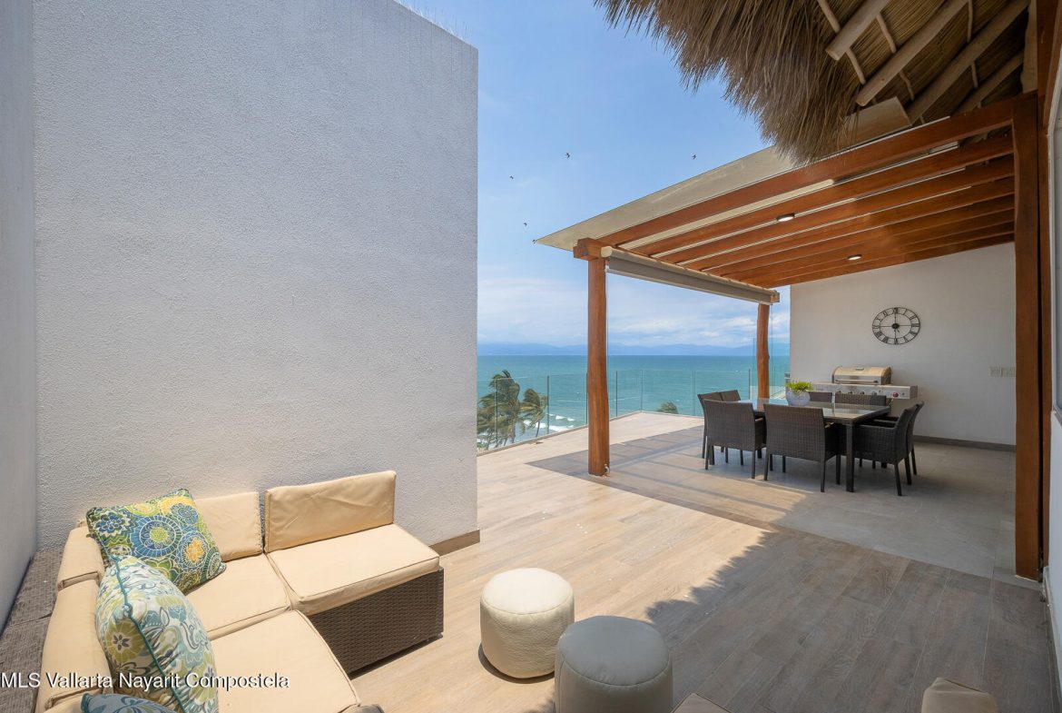 This stunning 2 level Ocean front penthouse in Zona Dorada in Bucerias offers amazing ocean views. Each level has its own spacious terrace. Each level also offers 2 separate entrances, if you choose to rent individually or access via staircase internally. The 1st level features 2 bedrooms with full bathrooms, and full kitchen. Rooftop level includes a master suite bedroom & bathroom, 1/2 bath, 2nd kitchen & laundry room. Each level is beautifully furnished. Fine finishings throughout. The property comes with a deeded parking space. Residents can also enjoy an infinity pool over looking the beach. Property offers a gym & small private restaurant. 24/7 security. Walking distance to all Golden Zone restaurants, cafes & boutique shops. Enjoy a piece of paradise with stunning ocean views