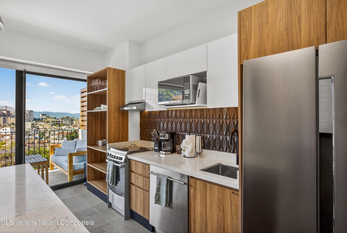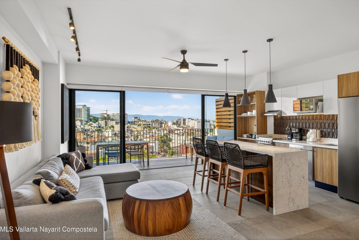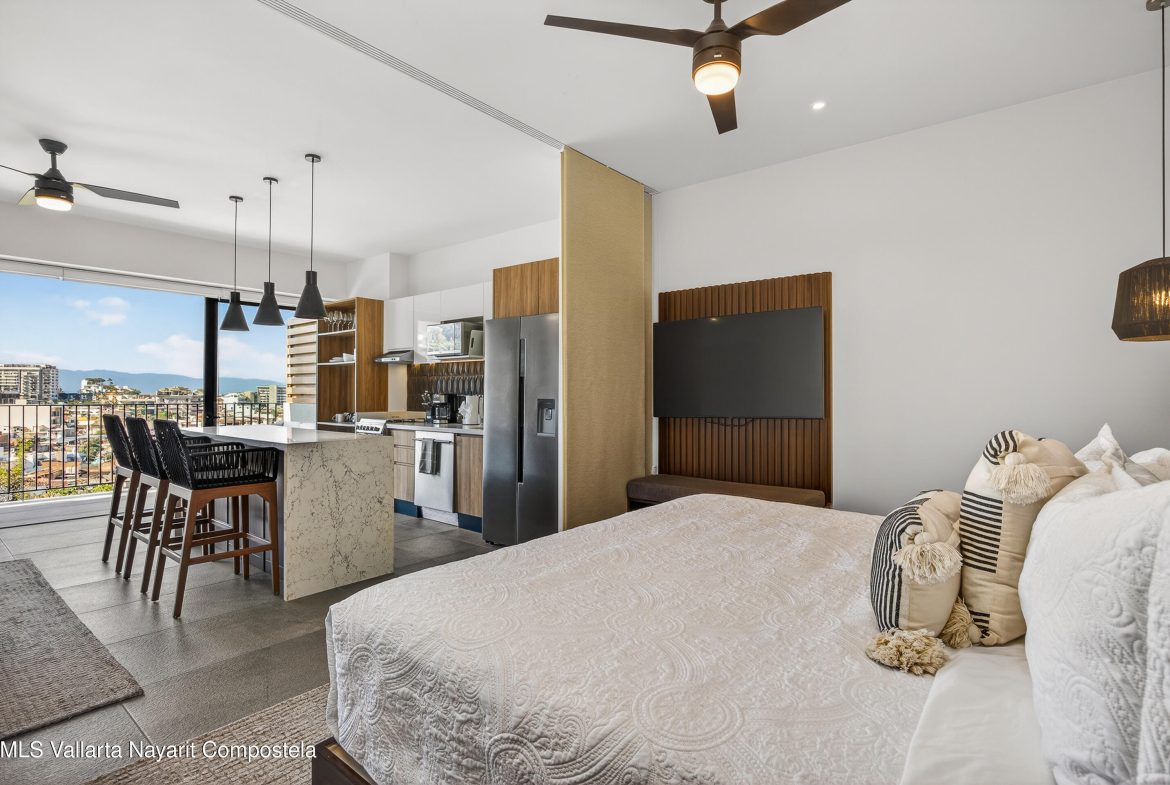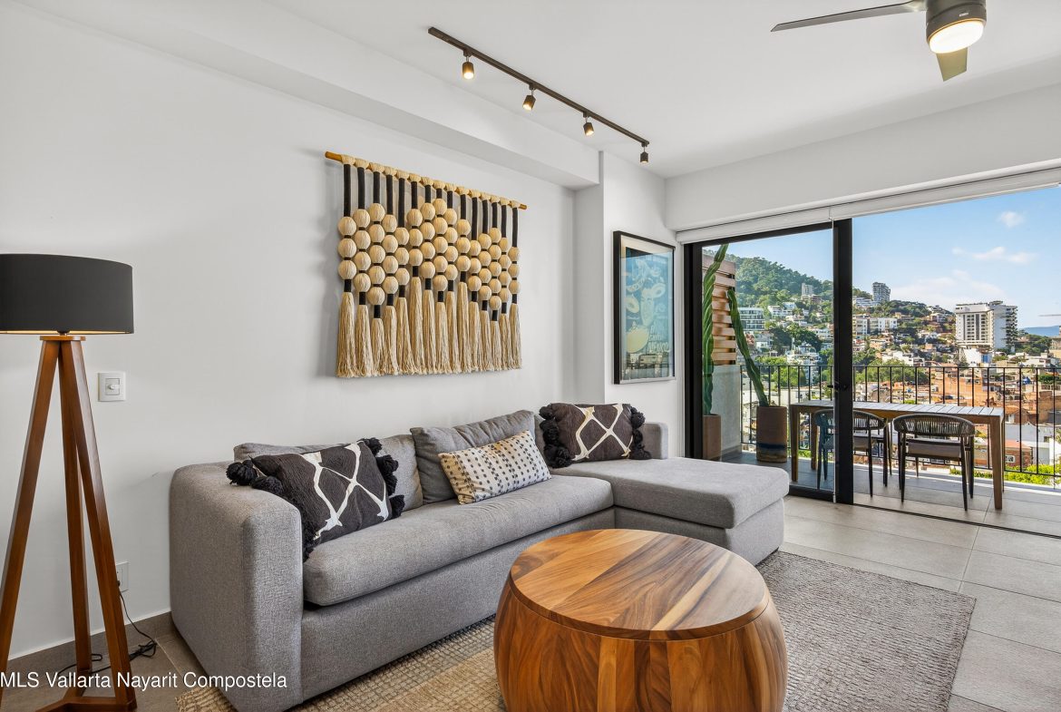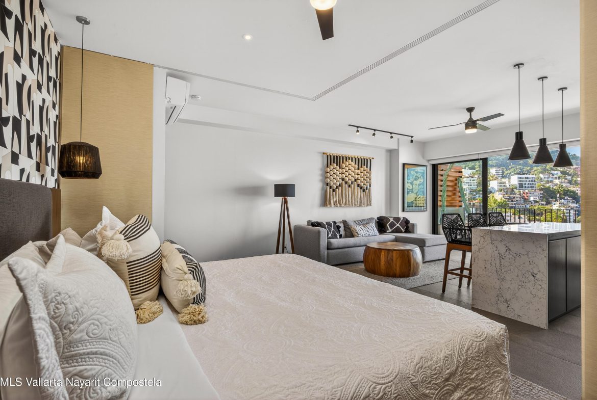 This beautiful 1 bedroom condo has everything you could want! Being on the 7th floor you have mountain, city, ocean and river views! The building is located on the flat, just behind the romantic zone, so there are no hills to climb and you have easy walking access to all the activities of the Romantic Zone like beach clubs and night life. As well, you have endless options for great restaurants and cafes nearby.