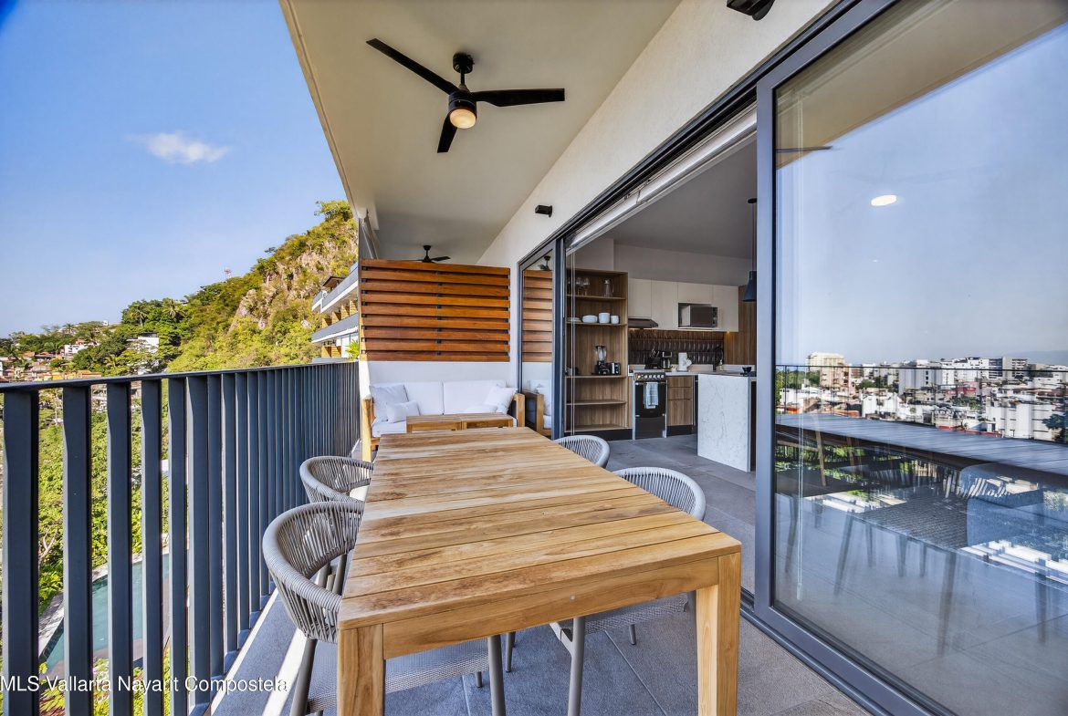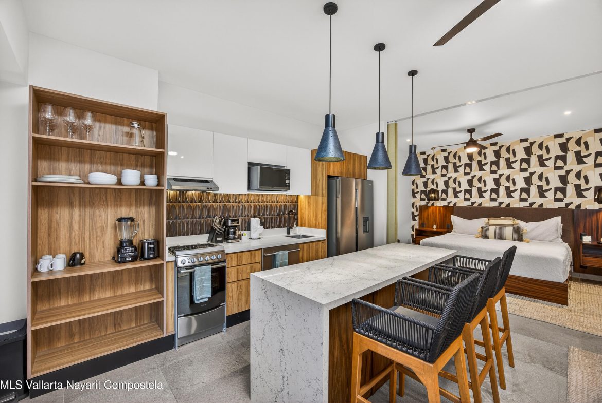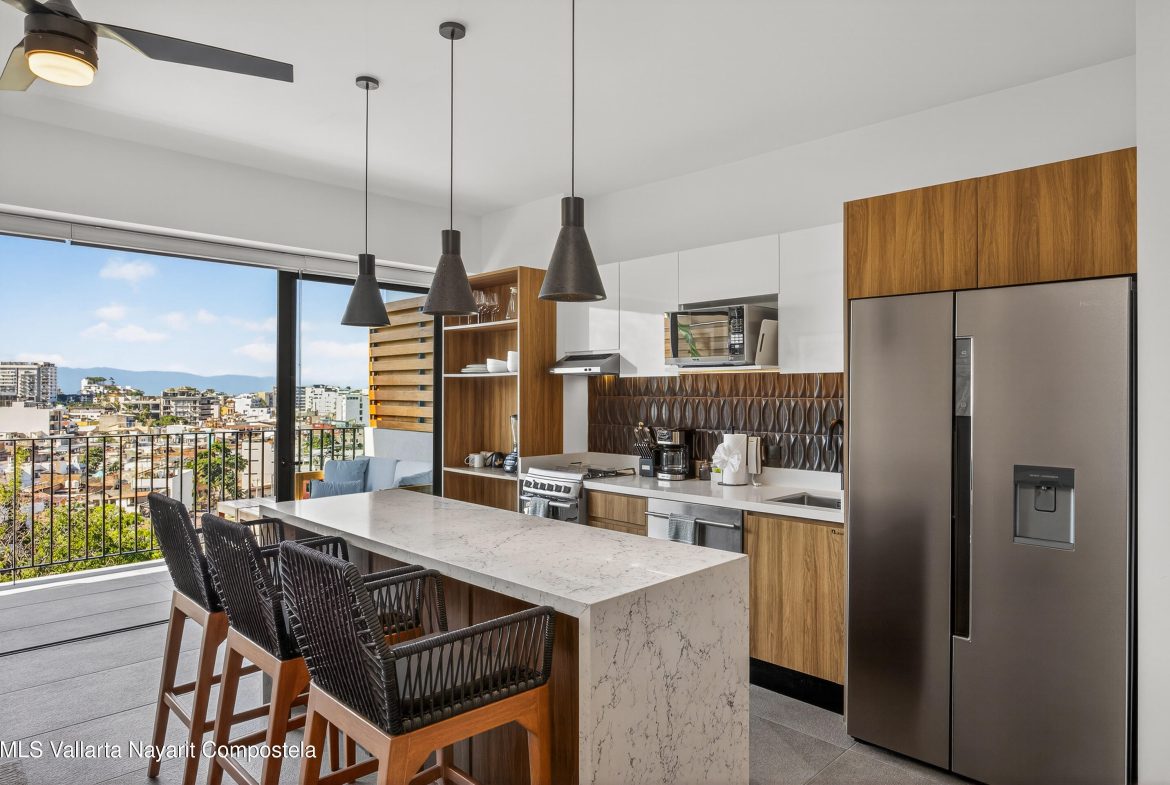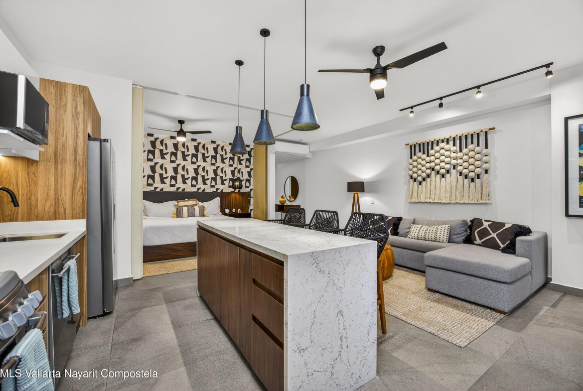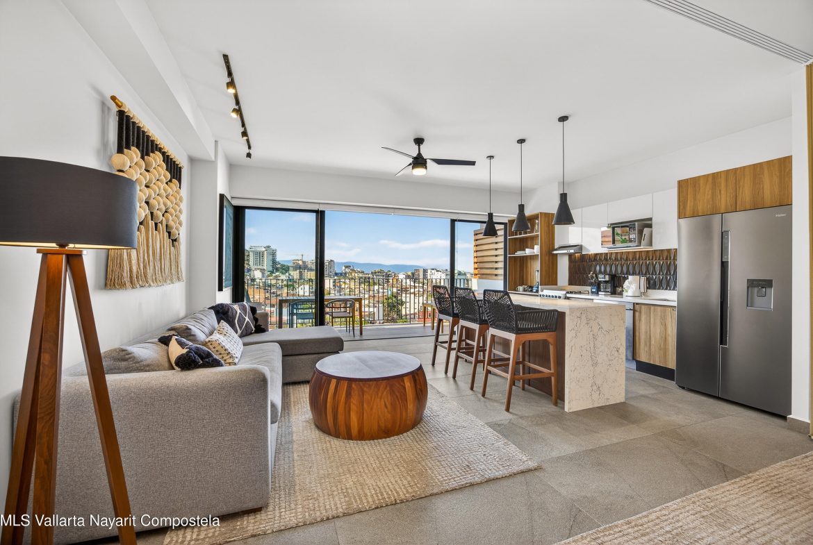 This beautiful 1 bedroom condo has everything you could want! Being on the 7th floor you have mountain, city, ocean and river views! The building is located on the flat, just behind the romantic zone, so there are no hills to climb and you have easy walking access to all the activities of the Romantic Zone like beach clubs and night life. As well, you have endless options for great restaurants and cafes nearby.