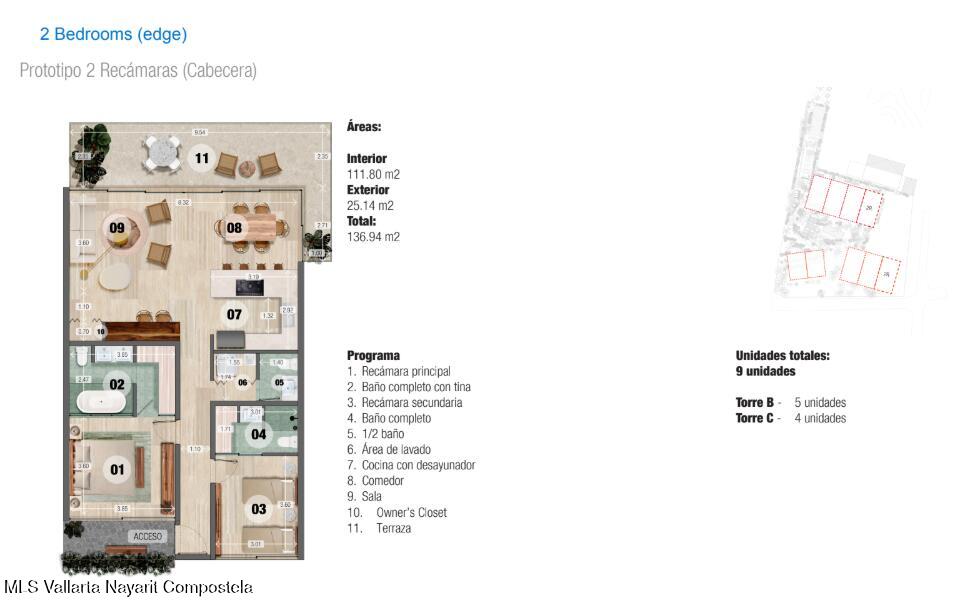 The 2-bedroom Edge offers 136 square meters of indoor and outdoor living space. Each bedroom includes an ensuite, with the master featuring a full-size bathtub. The residence also includes a half bath, an owner’s closet, and a spacious private patio, perfect for entertaining and maximizing natural light. Olaya combines thoughtful design and functionality, making it ideal as your dream home or investment property.