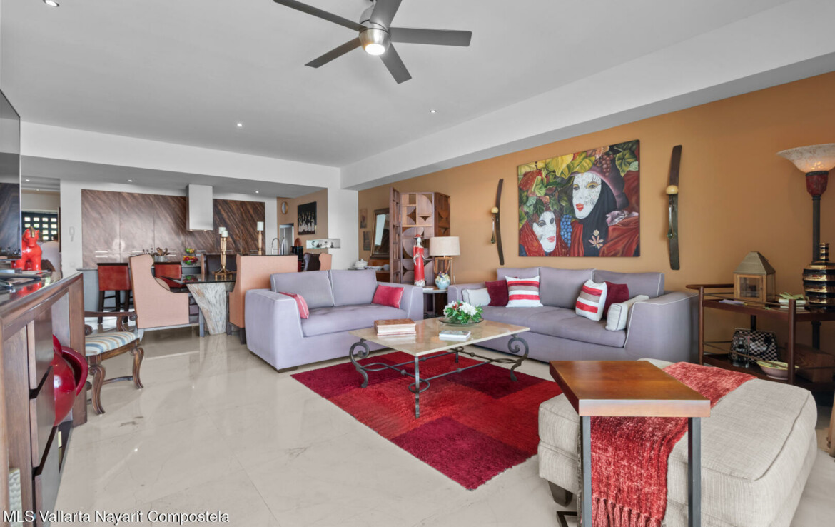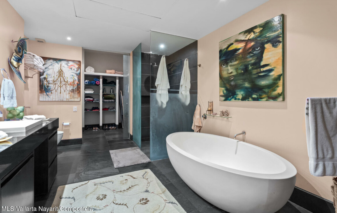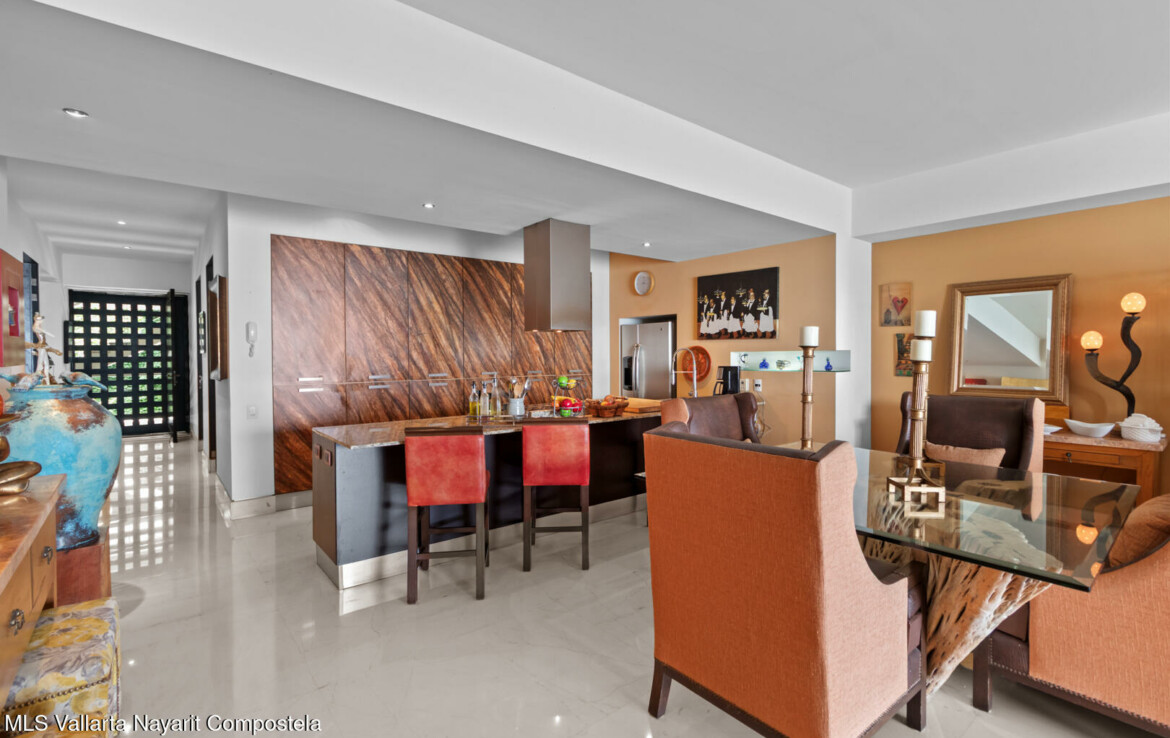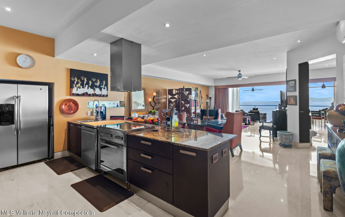 This sophisticated seventh floor residence offers a spacious covered terrace designed to showcase expansive views of the ocean, town, and surrounding jungle hillside. The kitchen is equipped with custom Italian Berloni cabinetry in rich wood tones, a large peninsula with bar seating, granite counter-tops, and stainless-steel appliances. Adjacent to the kitchen, the dining area comfortably accommodates eight guests, while the elegant living space opens seamlessly onto the terrace, enhancing the indoor-outdoor living experience. The master suite provides a tranquil retreat featuring a walk-in closet, double sinks with designer fixtures, a tempered glass shower, and a modern oval bathtub.