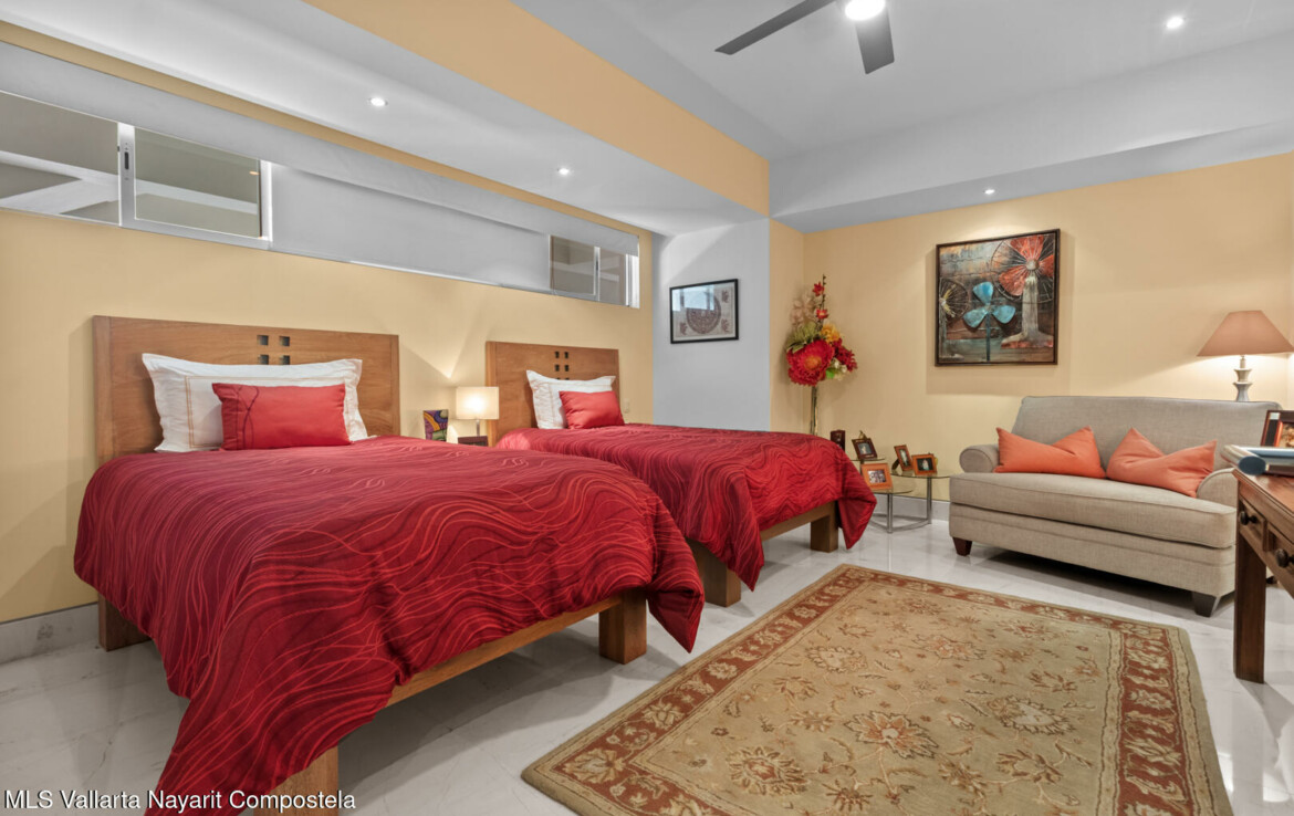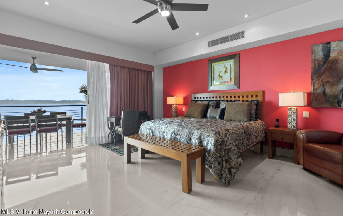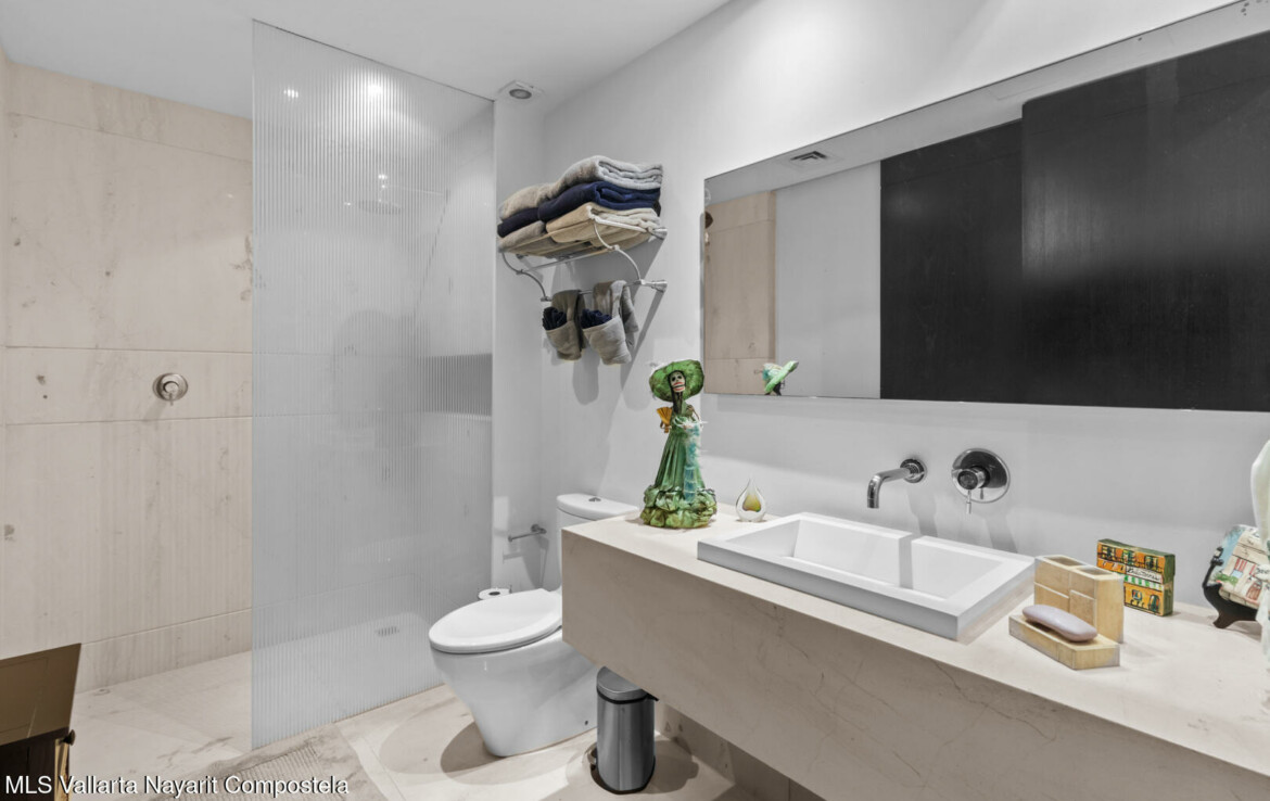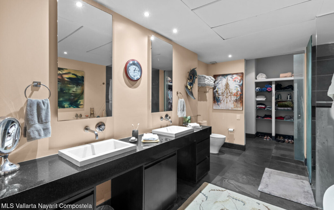 This sophisticated seventh floor residence offers a spacious covered terrace designed to showcase expansive views of the ocean, town, and surrounding jungle hillside. The kitchen is equipped with custom Italian Berloni cabinetry in rich wood tones, a large peninsula with bar seating, granite counter-tops, and stainless-steel appliances. Adjacent to the kitchen, the dining area comfortably accommodates eight guests, while the elegant living space opens seamlessly onto the terrace, enhancing the indoor-outdoor living experience. The master suite provides a tranquil retreat featuring a walk-in closet, double sinks with designer fixtures, a tempered glass shower, and a modern oval bathtub.