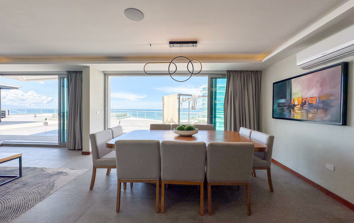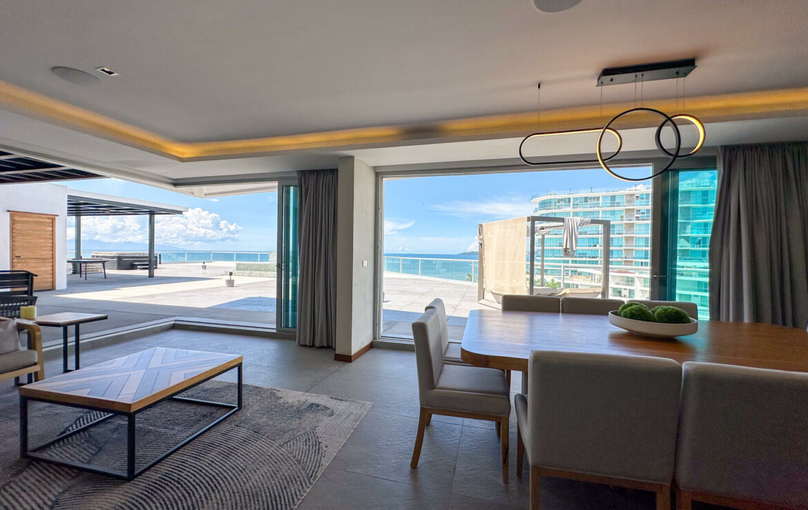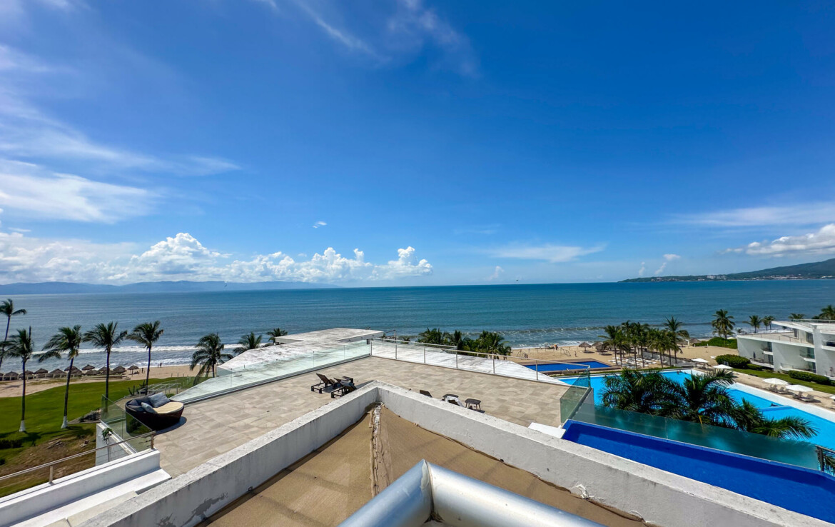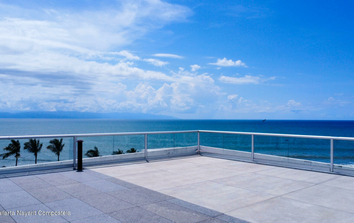 Descubre el Penthouse Coral, en el condominio maestro Flamingos Acqua, dentro del desarrollo Flamingos en Bucerias, Nayarit. Esta propiedad cuenta con una superficie total de 678.55 m, distribuidos en 172.59 m de interiores, 92.21 m de terraza cubierta y 413.75 m de terraza descubierta, ofreciendo amplios espacios con vistas panoramicas.El penthouse se compone de 3 recamaras, 3 banos completos, un medio bano, cocina integral con desayunador, sala, comedor, terraza cubierta con bano y asador, y terraza descubierta con alberca y jacuzzi privados.La propiedad se vende amueblada y lista para habitar. Cuenta con acceso a servicios del condominio, incluyendo seguridad, alberca, con vistas frente al mar.