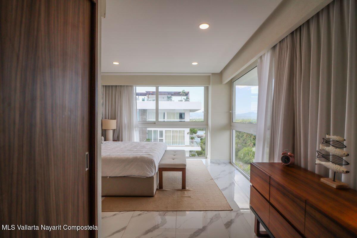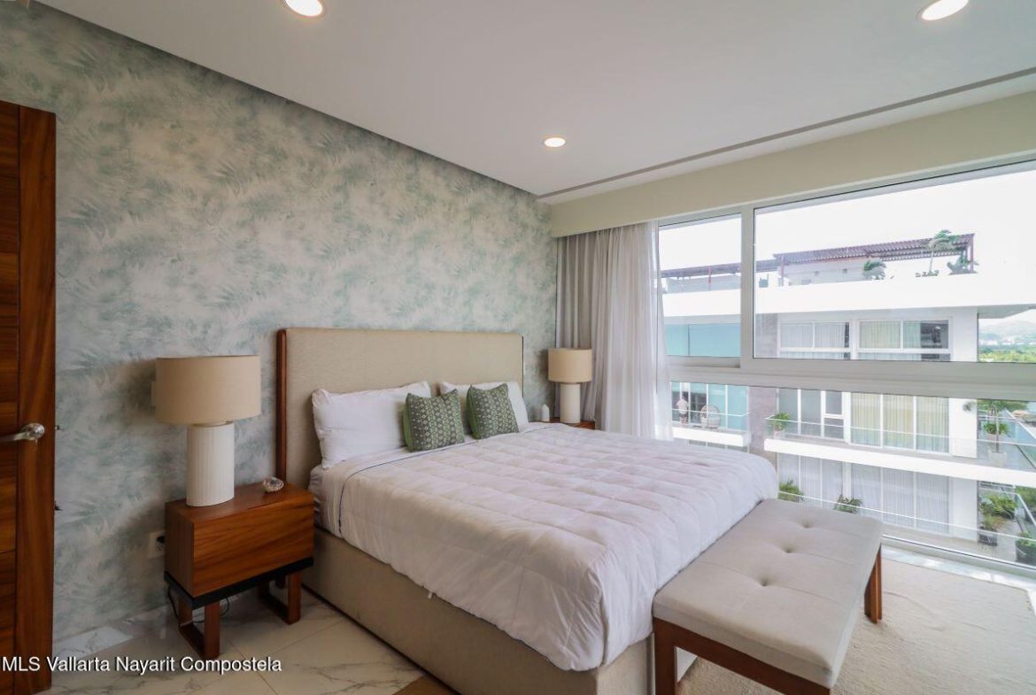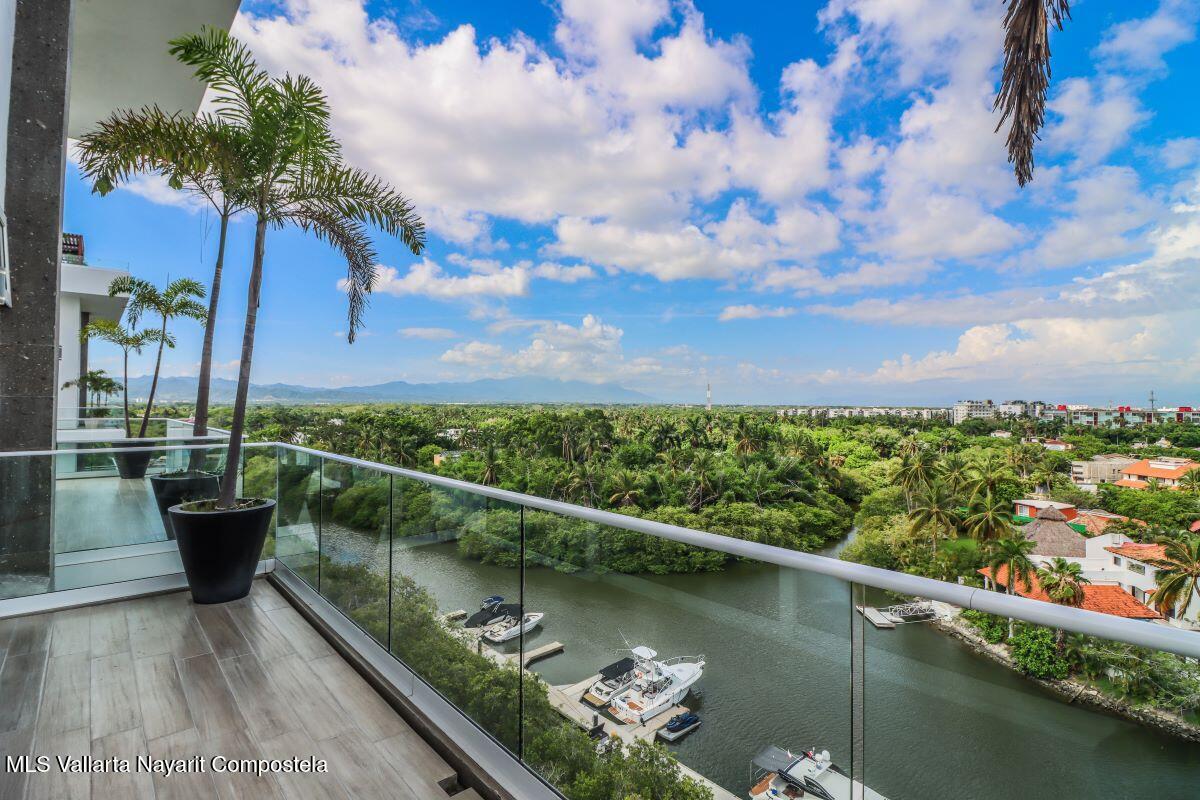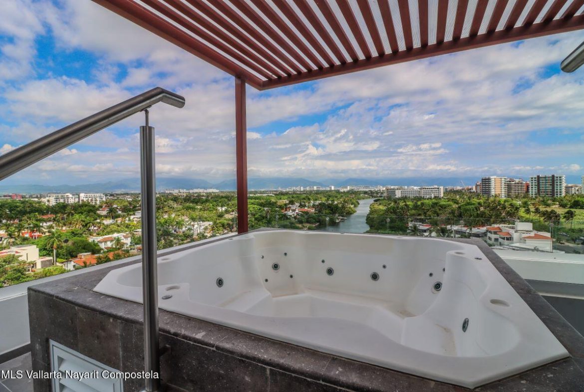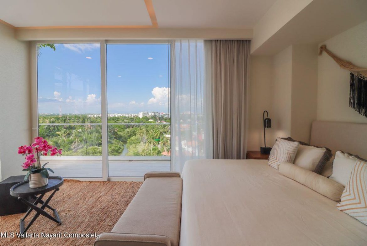 A residence where design, spaciousness, and surroundings blend in perfect harmony. This three-bedroom, five-bath penthouse offers a sophisticated lifestyle, with spaces focused on comfort and a direct connection to nature. Each bedroom is a bright sanctuary with large windows and private terraces overlooking the canal and pool. The fully equipped kitchen and living room feature double-height windows with electric blinds that elegantly control natural light. The main terrace includes dining area, and jacuzzi, perfect for enjoying uninterrupted views of the canal, villas, mountains, and distant sea. Located in Quinta San Miguel Ocean & Canal, the community offers a pool, gym, rooftop, and canal for water activities. Designed for those seeking the exceptional in Nuevo Vallarta.
