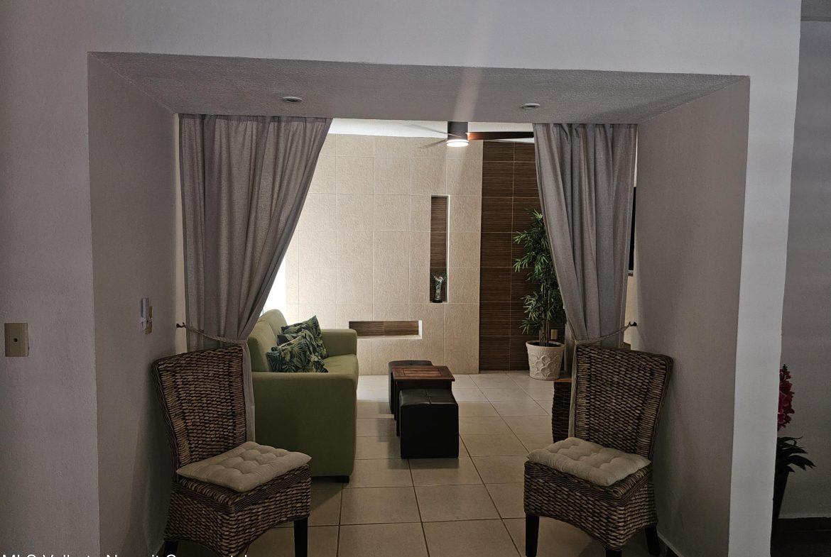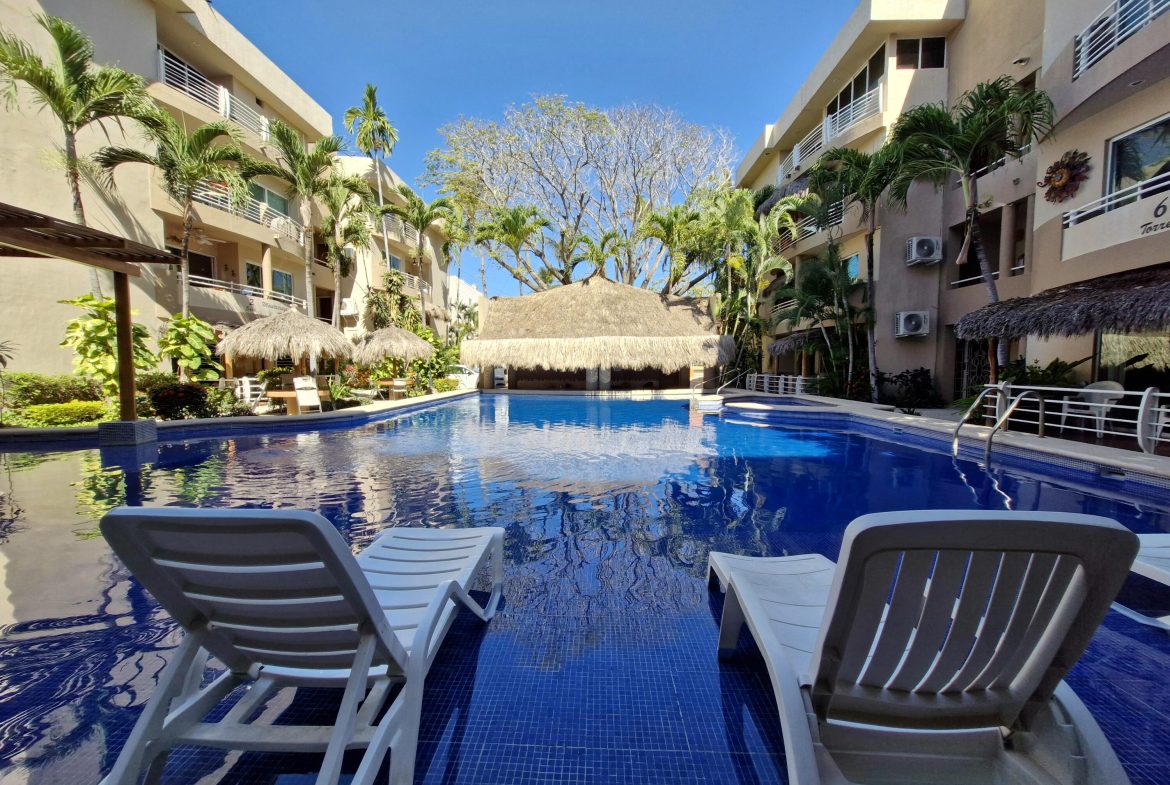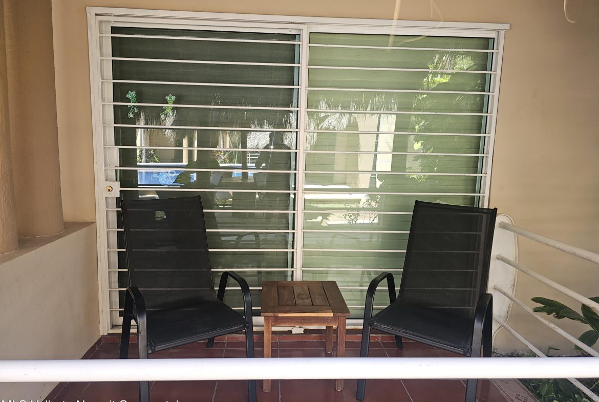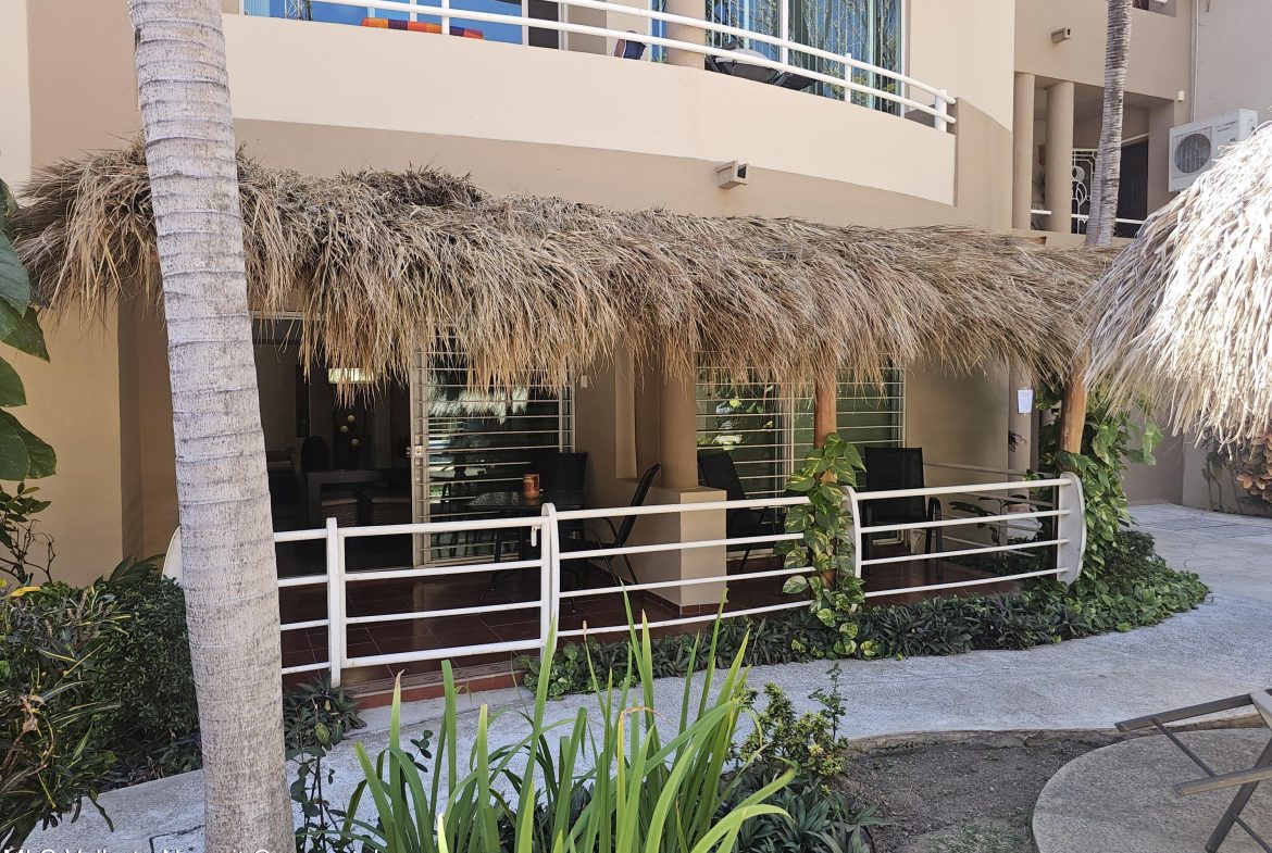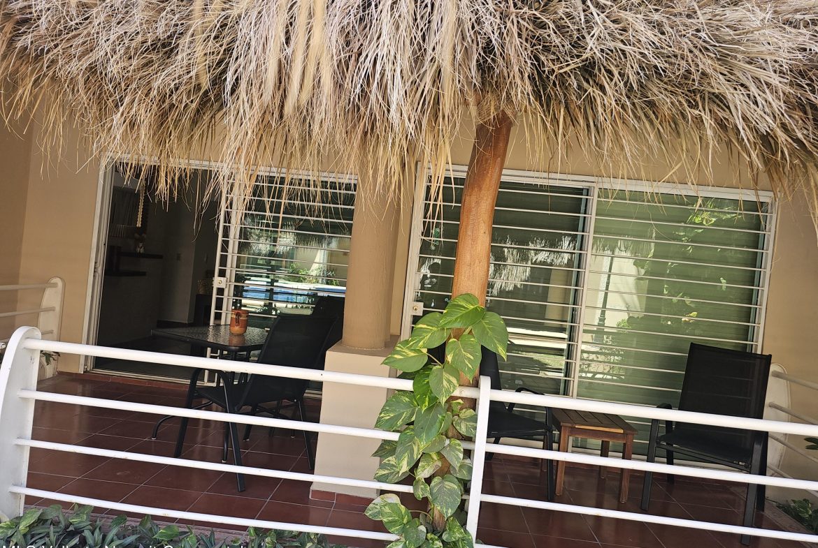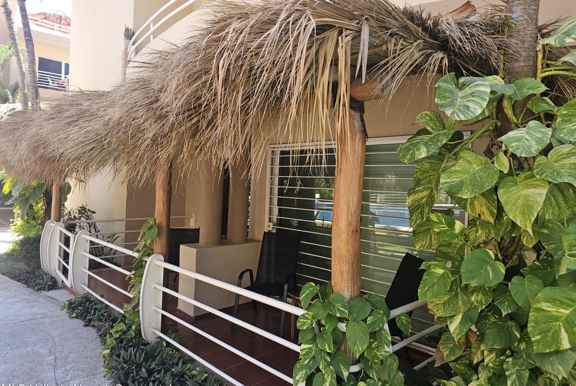 Located in beautiful Golden Zone Bucerias, walking distance to Beach, restaurants, stores, banks, pharmacy, & bus/taxi in a gated community. This beautiful Ground Level Condo, ideal for pool lovers or anyone with mobility issues. Offers quality finishings, granite countertops, & parota wood cabinetry. Recently updated with a New Palapa covered spacious patio is close to the amazing pool & swim up bar. Brand new ceiling fans, & recently painted interior. Common rooftop terrace overlooking the Bay of Banderas. This fully furnished 3 bdr/ 2 bath, fully equipped kitchen, laundry room, large double patio facing pool & private back patio, with secured parking on property for owners & outside guest parking. HOA includes gas & water. Great rental income generator or a Paradise Home