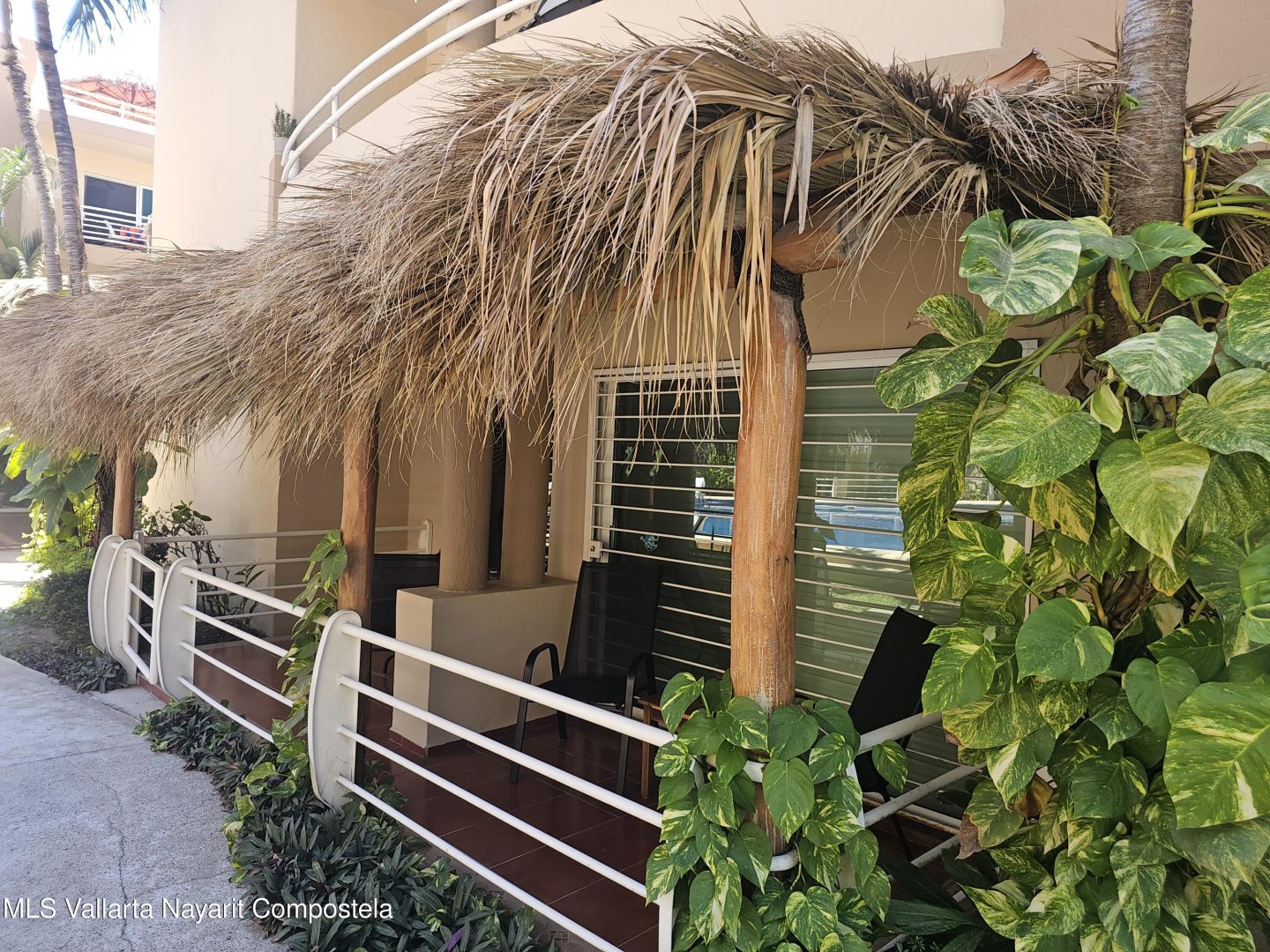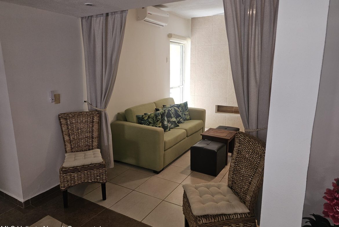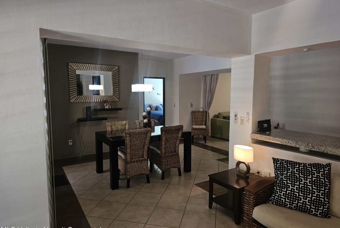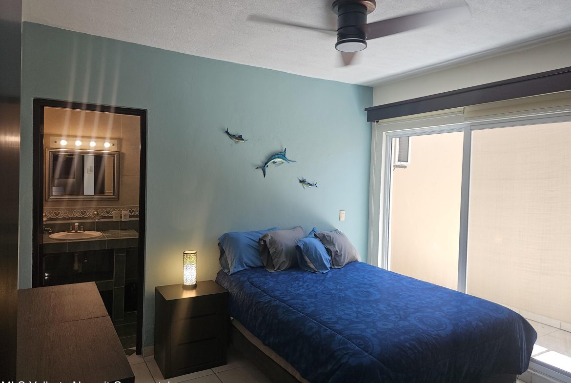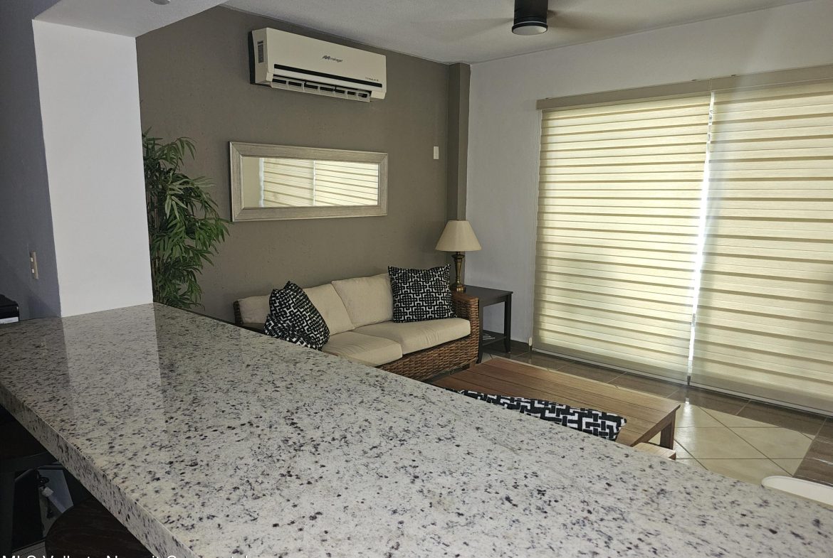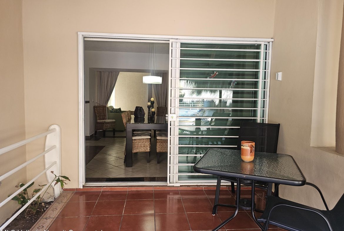Located in beautiful Golden Zone Bucerias, walking distance to Beach, restaurants, stores, banks, pharmacy, & bus/taxi in a gated community. This beautiful Ground Level Condo, ideal for pool lovers or anyone with mobility issues. Offers quality finishings, granite countertops, & parota wood cabinetry. Recently updated with a New Palapa covered spacious patio is close to the amazing pool & swim up bar. Brand new ceiling fans, & recently painted interior. Common rooftop terrace overlooking the Bay of Banderas. This fully furnished 3 bdr/ 2 bath, fully equipped kitchen, laundry room, large double patio facing pool & private back patio, with secured parking on property for owners & outside guest parking. HOA includes gas & water. Great rental income generator or a Paradise Home
