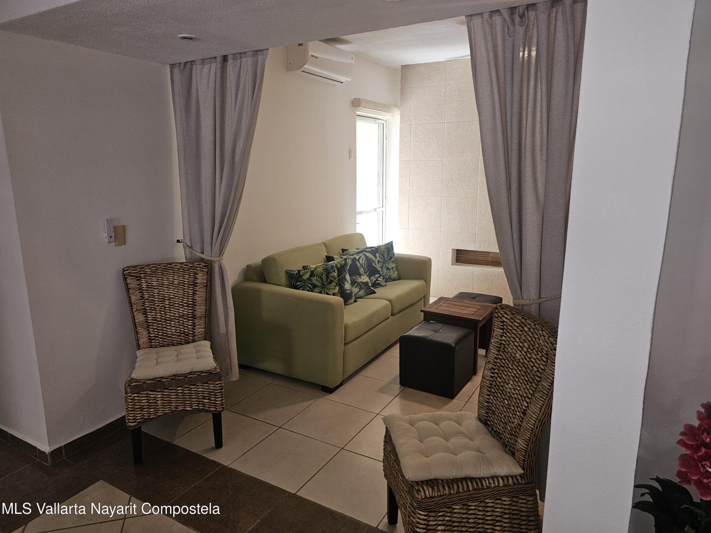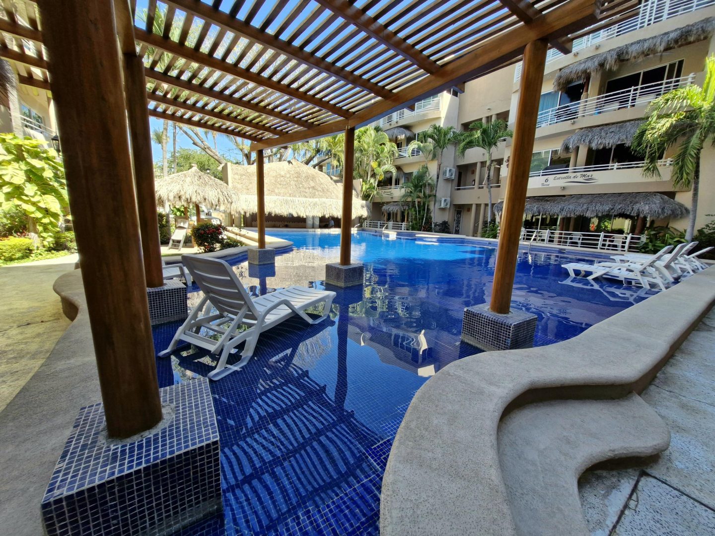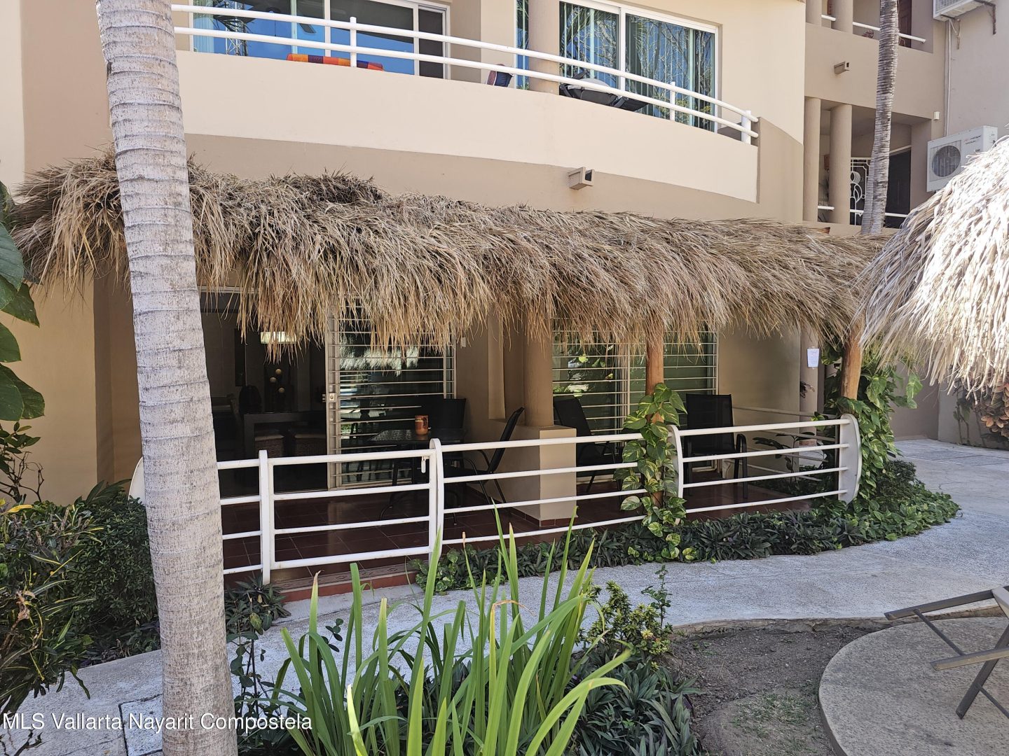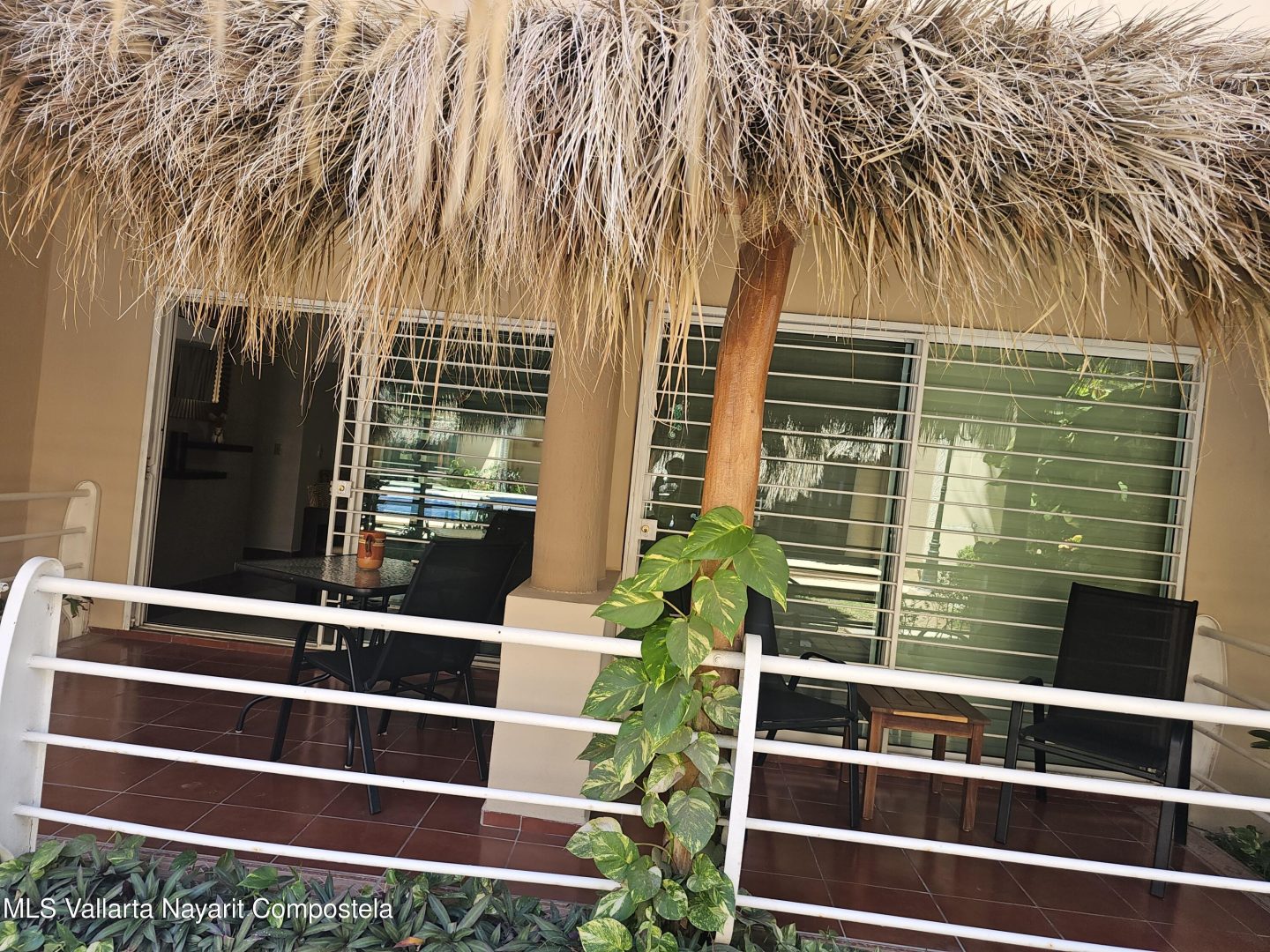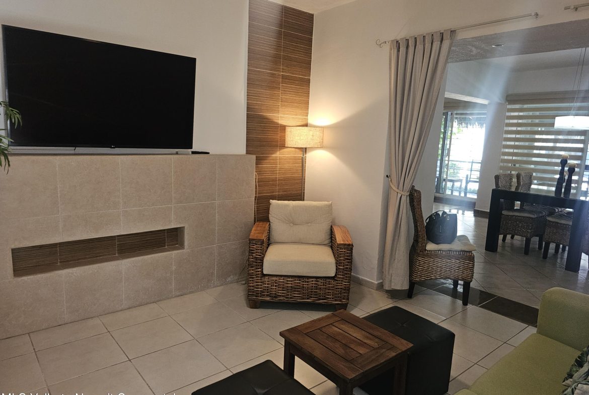 Located in beautiful Golden Zone Bucerias, walking distance to Beach, restaurants, stores, banks, pharmacy, & bus/taxi in a gated community. This beautiful Ground Level Condo, ideal for pool lovers or anyone with mobility issues. Offers quality finishings, granite countertops, & parota wood cabinetry. Recently updated with a New Palapa covered spacious patio is close to the amazing pool & swim up bar. Brand new ceiling fans, & recently painted interior. Common rooftop terrace overlooking the Bay of Banderas. This fully furnished 3 bdr/ 2 bath, fully equipped kitchen, laundry room, large double patio facing pool & private back patio, with secured parking on property for owners & outside guest parking. HOA includes gas & water. Great rental income generator or a Paradise Home