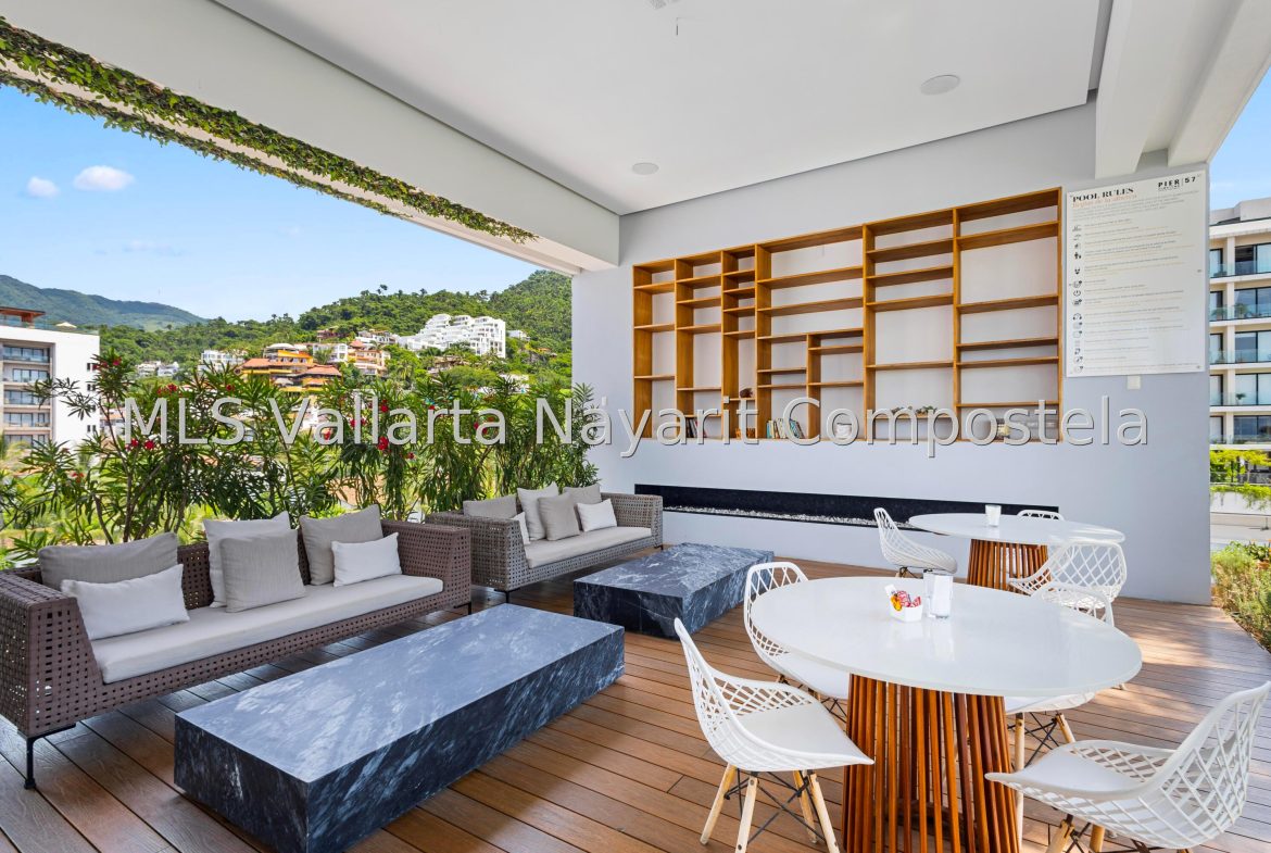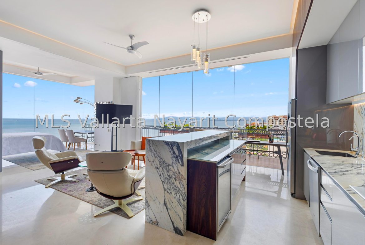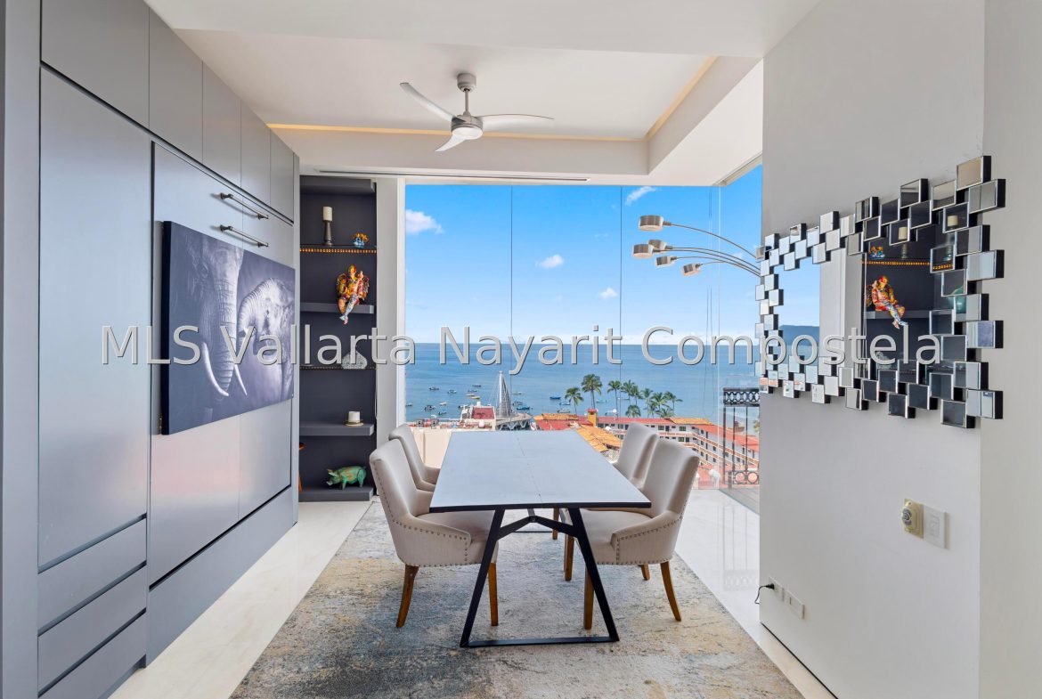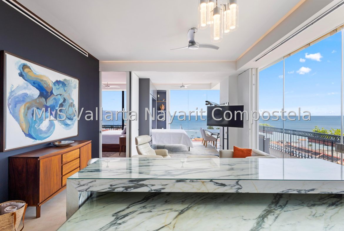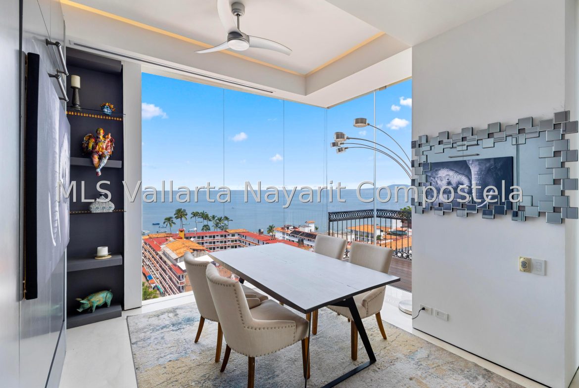 Discover the pinnacle of luxury living at Pier 57, the most modern building at Los Muertos Beach. This exquisite penthouse offers breathtaking views and an unparalleled lifestyle, featuring a stunning infinity pool with a unique fire pit at its center and bar service exclusively for residents.Step inside this modern masterpiece, where high ceilings and an open-concept layout create a spacious atmosphere. Floor-to-ceiling windows provide spectacular views of the ocean and Old Town Vallarta, seamlessly blending indoor and outdoor living. Your private terrace, known as ‘At the Top of the World,’ overlooks the picturesque Bay of Banderas and the iconic Los Muertos Pier, making it the perfect spot to unwind and enjoy breathtaking sunsets with a glass of wine.