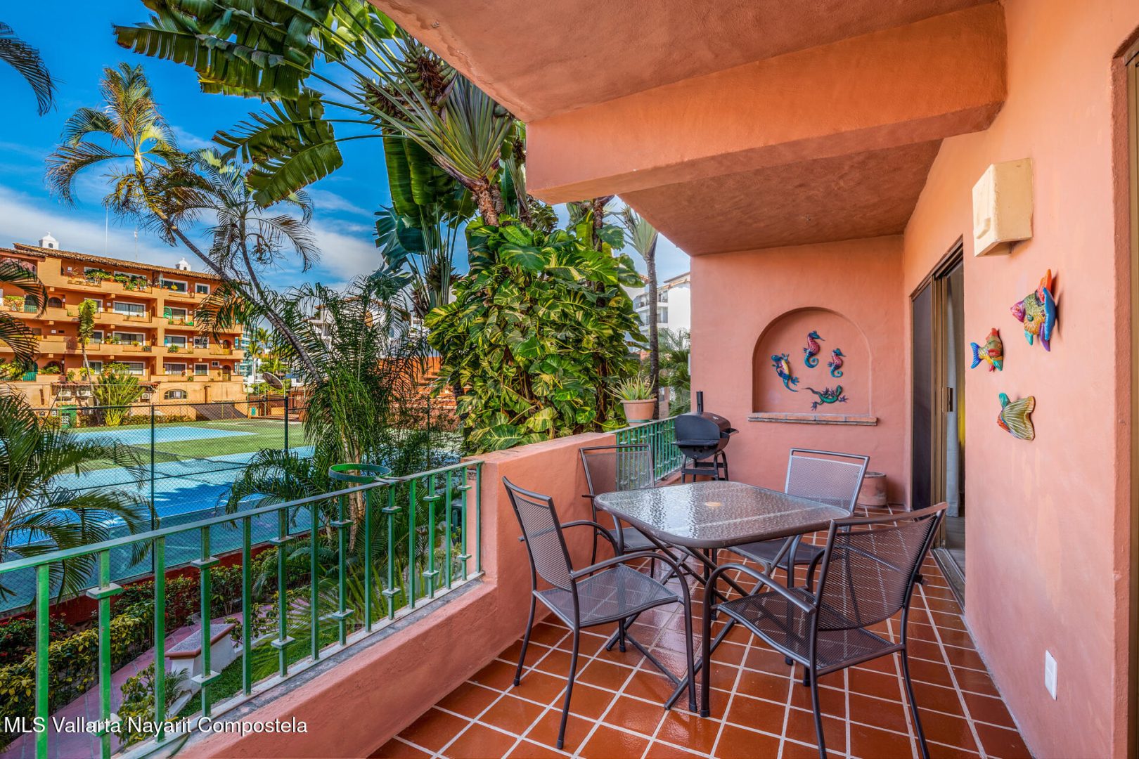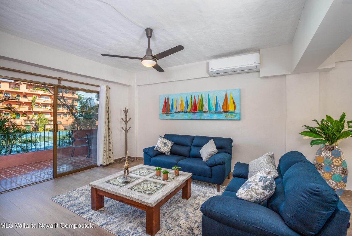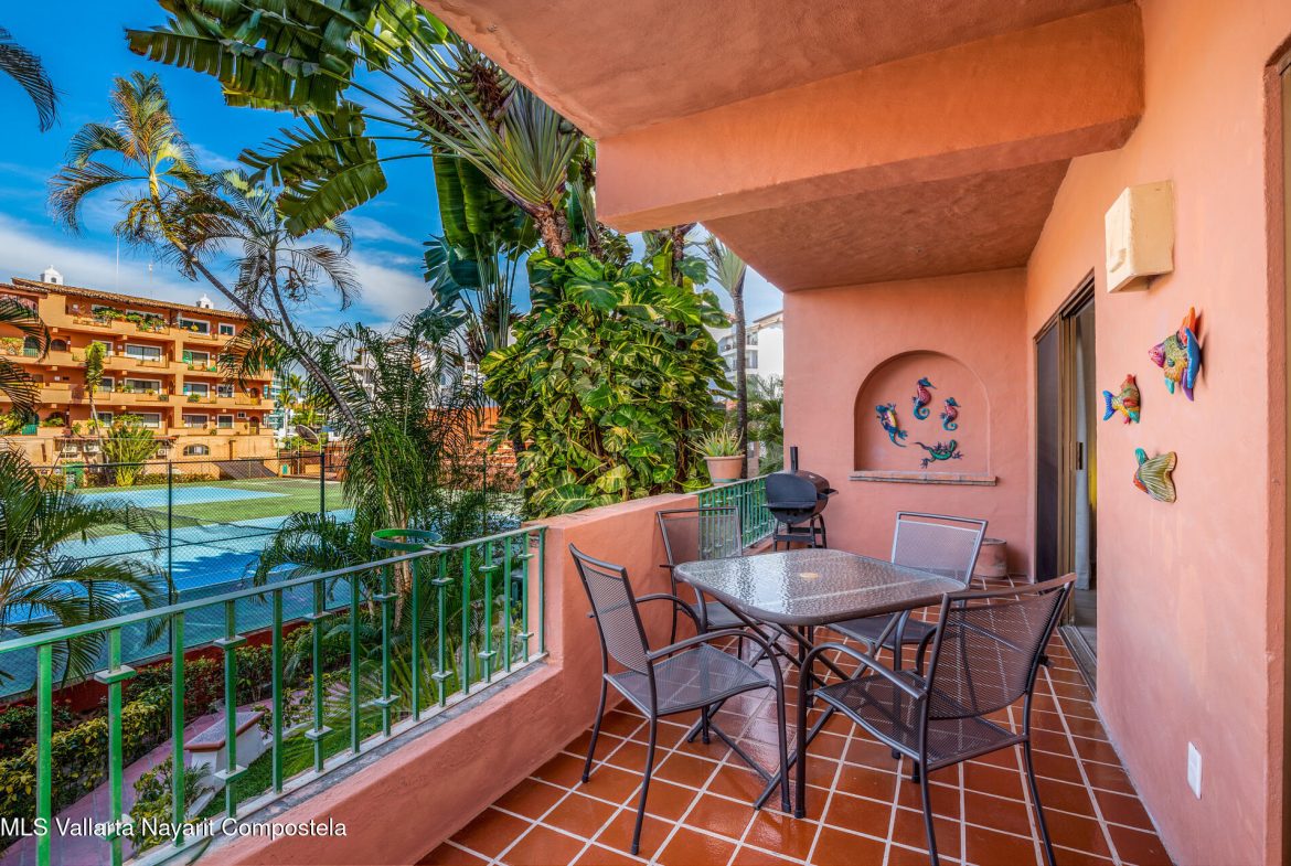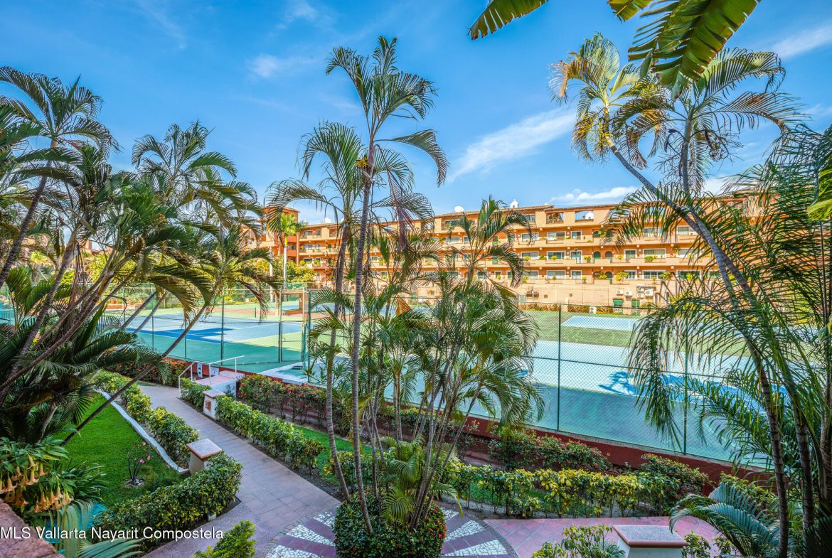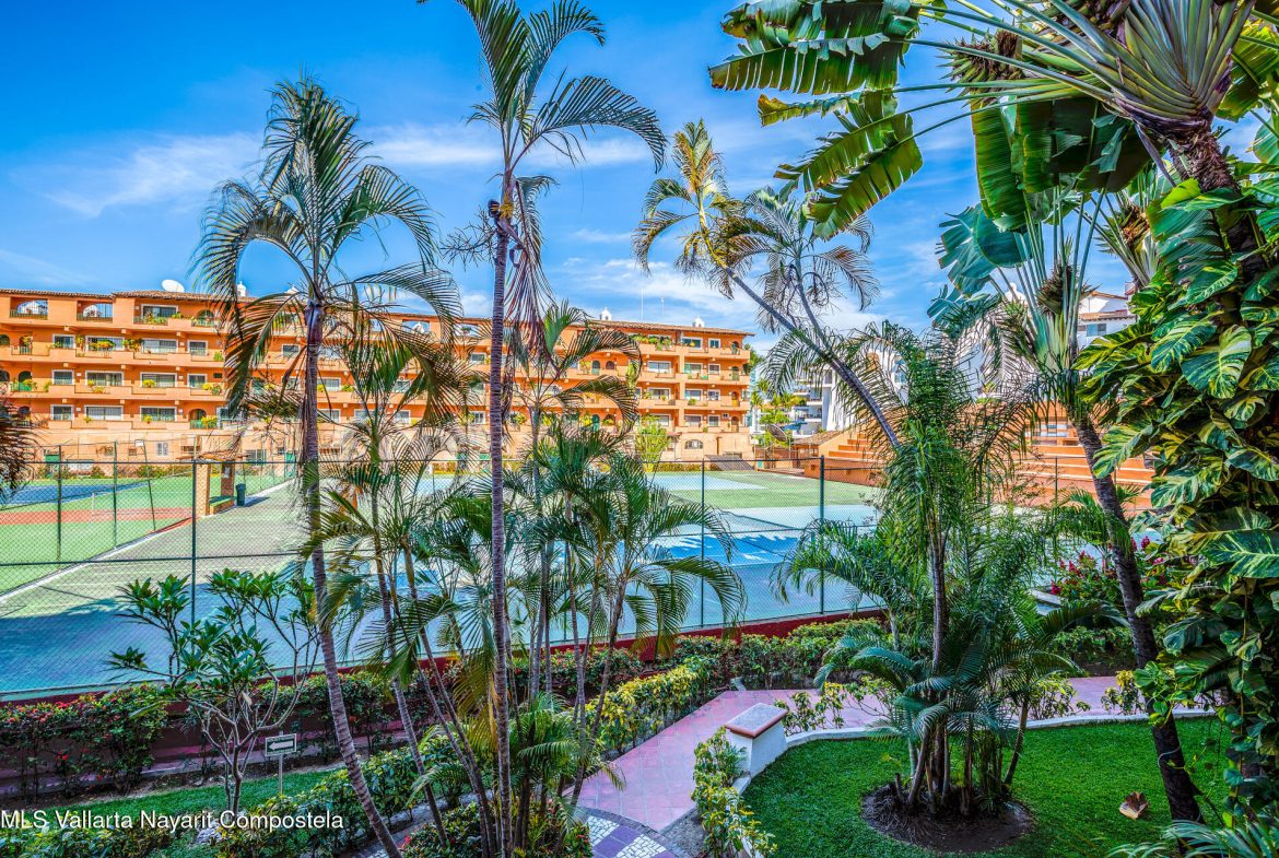 Puesta del Sol 4220 en Marina Vallarta – condominio de 2 recamaras y 2 banos, con sala, comedor, cocina, patio de servicio y terraza con vista a la cancha de tenis. Amenidades: alberca con palapa, canchas de tenis, jardines, area infantil, estacionamiento subterraneo y seguridad 24/7. A una cuadra de la playa, 10 min del aeropuerto, cerca de escuelas, restaurantes, tiendas y golf— Puesta del Sol 4220 in Marina Vallarta – 2-bed, 2-bath condo with living room, dining, kitchen, service patio, and terrace overlooking the tennis court. Amenities: pool with palapa, tennis courts, gardens, kids’ play area, underground parking & 24/7 security. One block from the beach, 10 min from airport, close to dining, shopping, schools & golf.
