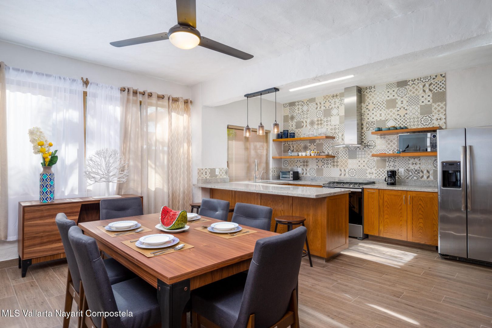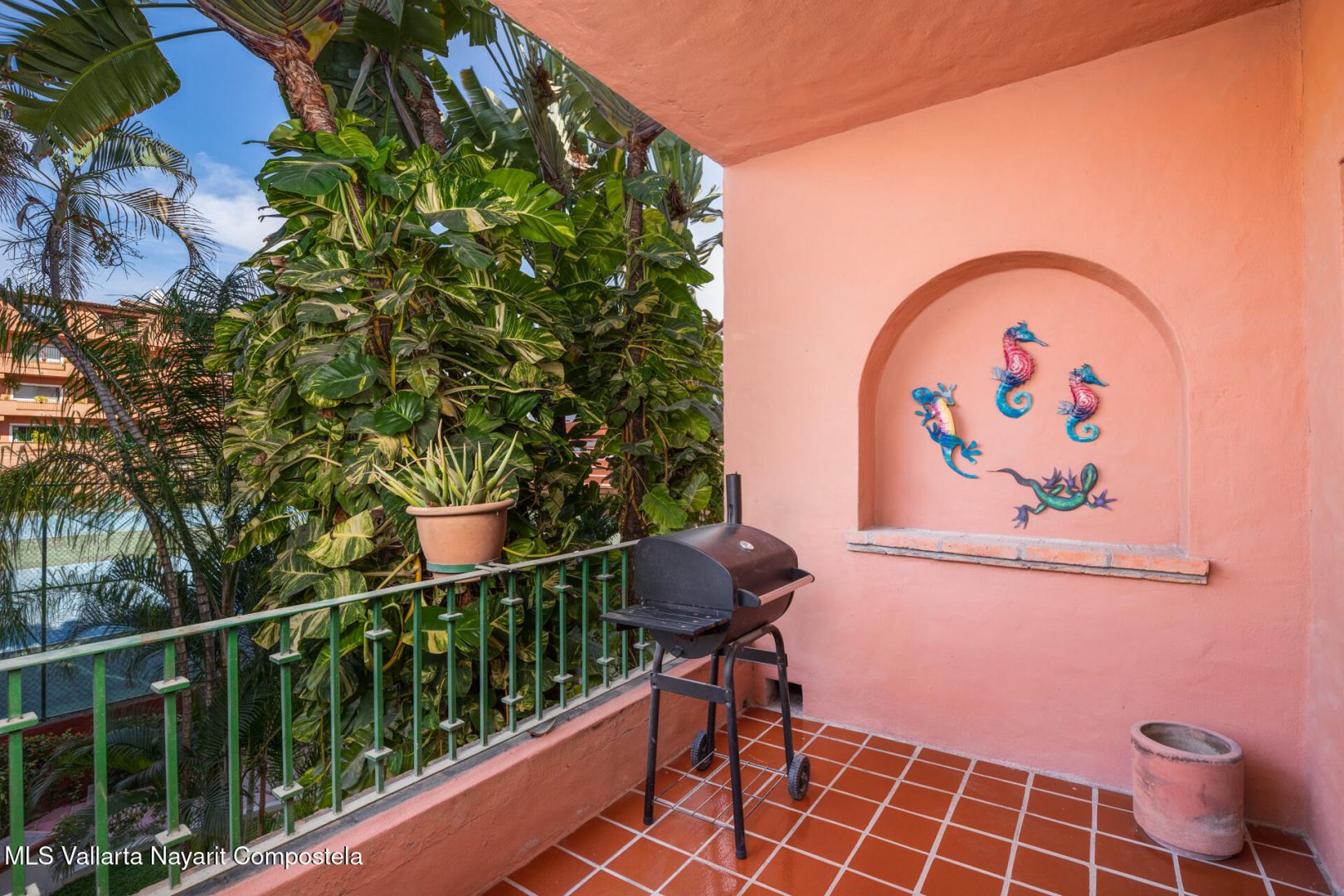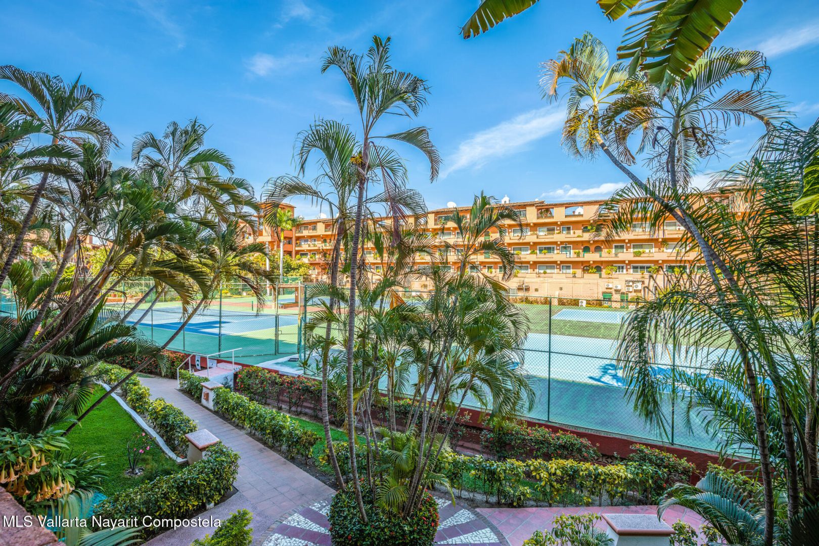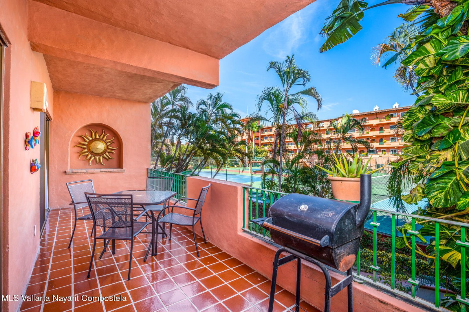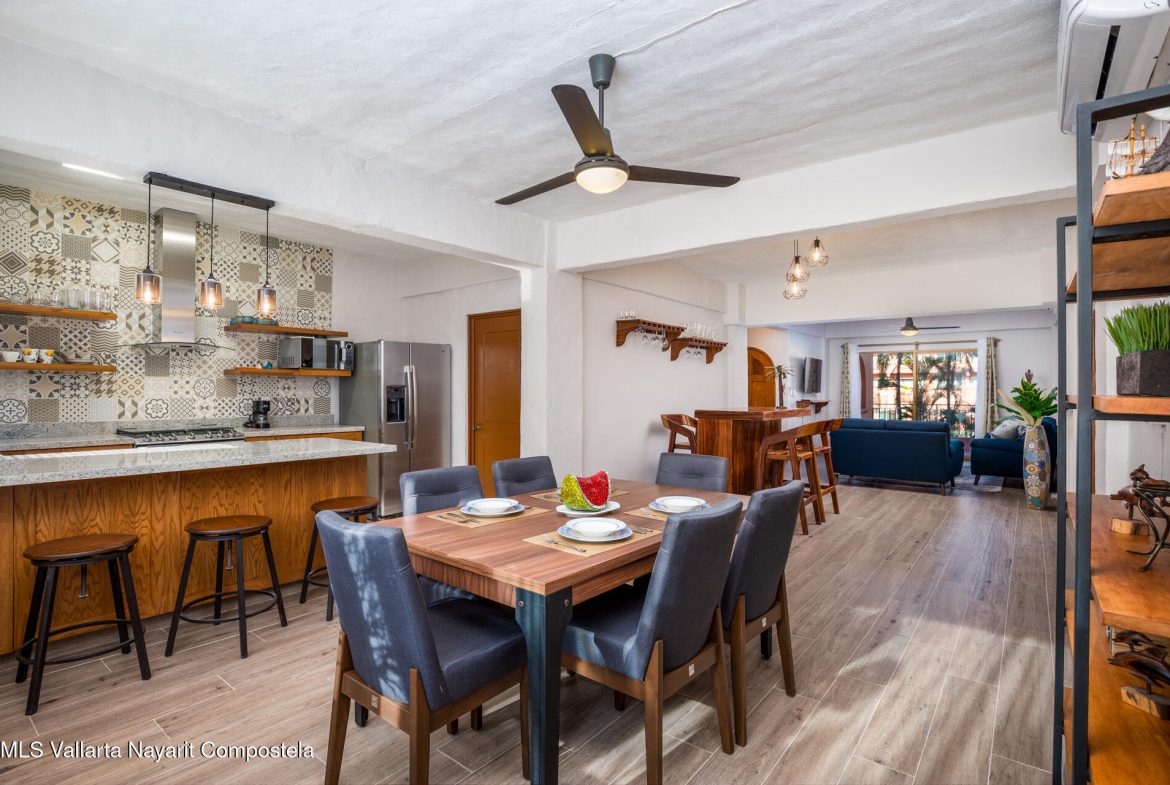 Puesta del Sol 4220 en Marina Vallarta – condominio de 2 recamaras y 2 banos, con sala, comedor, cocina, patio de servicio y terraza con vista a la cancha de tenis. Amenidades: alberca con palapa, canchas de tenis, jardines, area infantil, estacionamiento subterraneo y seguridad 24/7. A una cuadra de la playa, 10 min del aeropuerto, cerca de escuelas, restaurantes, tiendas y golf— Puesta del Sol 4220 in Marina Vallarta – 2-bed, 2-bath condo with living room, dining, kitchen, service patio, and terrace overlooking the tennis court. Amenities: pool with palapa, tennis courts, gardens, kids’ play area, underground parking & 24/7 security. One block from the beach, 10 min from airport, close to dining, shopping, schools & golf.