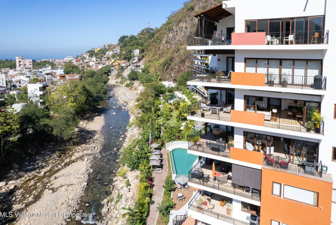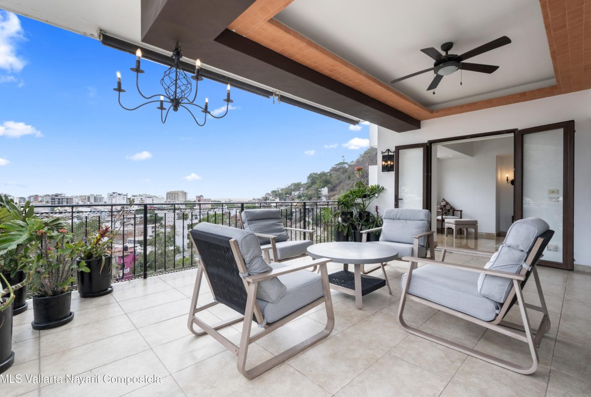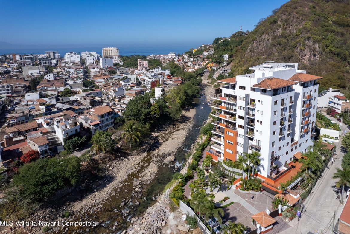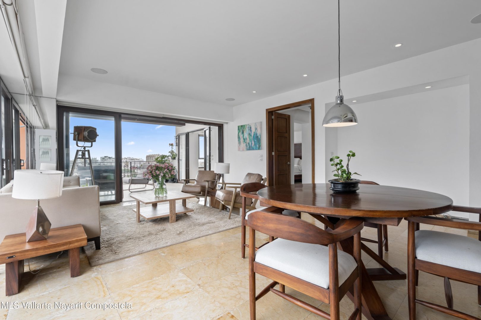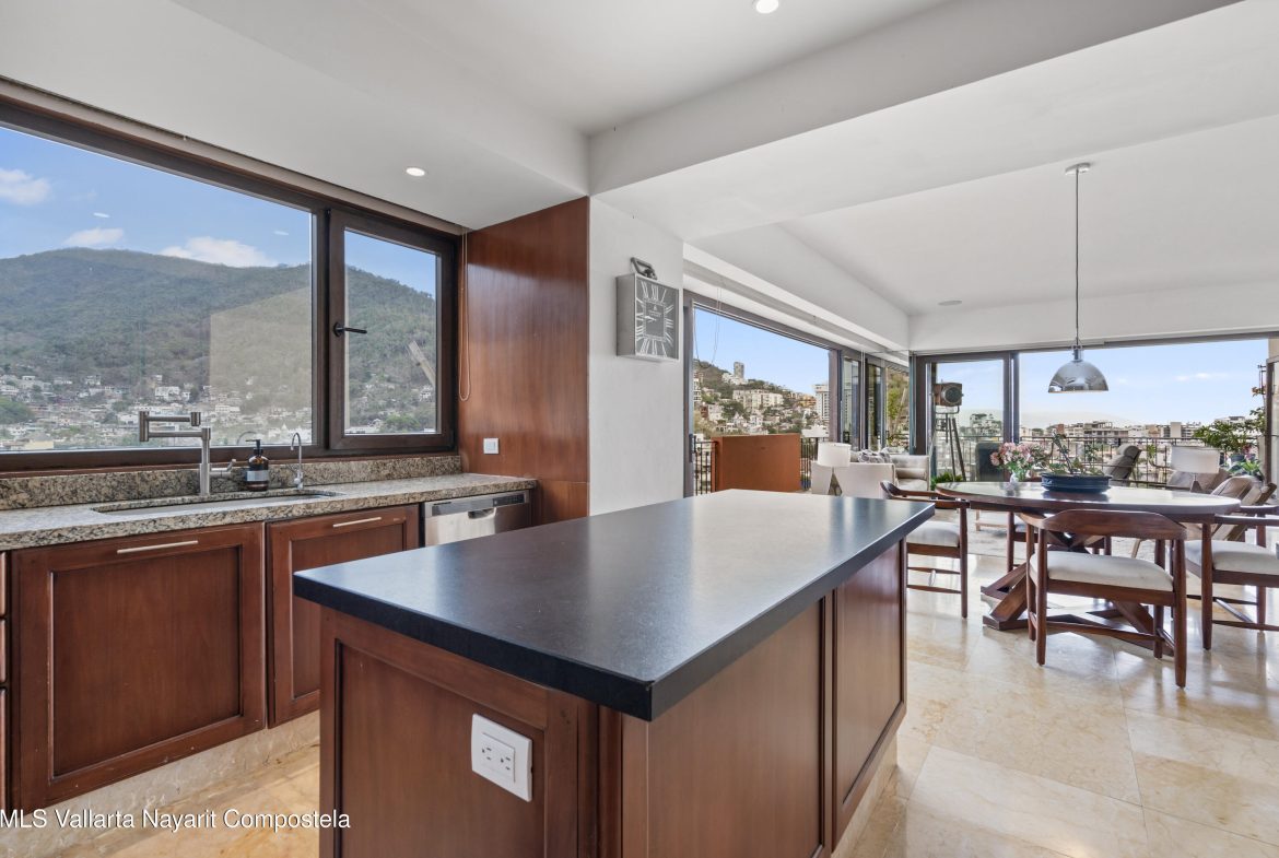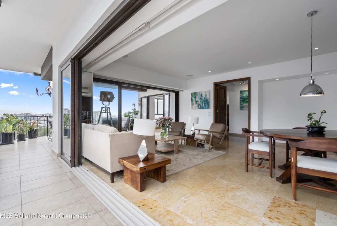 Very large and spacious apartment on an upper level on the south corner with floor-to-ceiling windows and doors around a substantial wrap-around terrace with expansive views of the mountains, the ocean, and the Rio Cuale. Large remodeled kitchen is fully equipped. Three bedrooms three bathrooms. Garage parking space and bodega included. Direct and secure elevator access. Common areas include lush tropical gardens and a newly constructed swimming pool. Comfortable and peaceful environment.