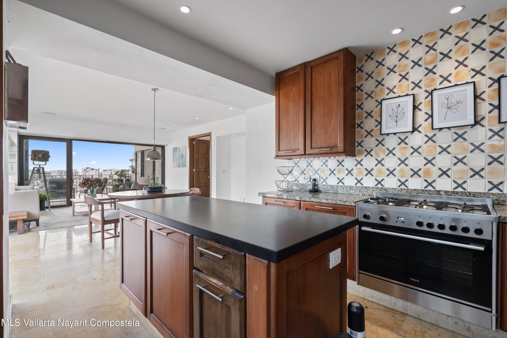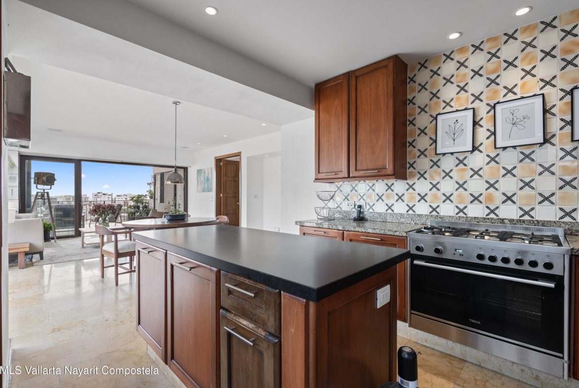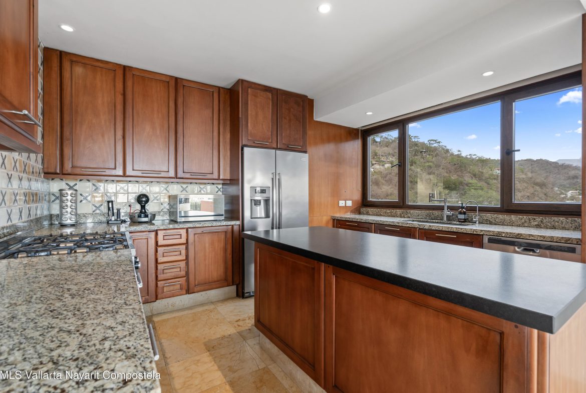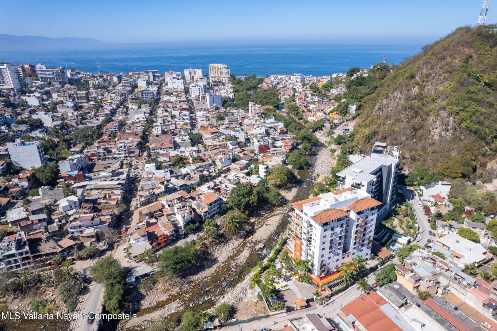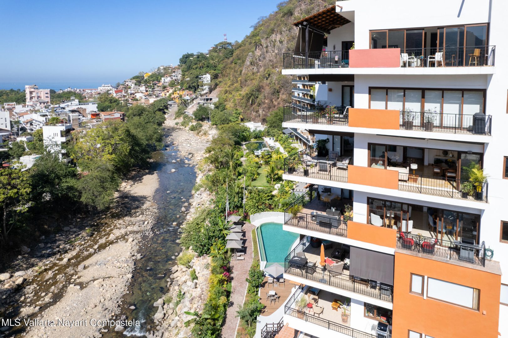 Very large and spacious apartment on an upper level on the south corner with floor-to-ceiling windows and doors around a substantial wrap-around terrace with expansive views of the mountains, the ocean, and the Rio Cuale. Large remodeled kitchen is fully equipped. Three bedrooms three bathrooms. Garage parking space and bodega included. Direct and secure elevator access. Common areas include lush tropical gardens and a newly constructed swimming pool. Comfortable and peaceful environment.