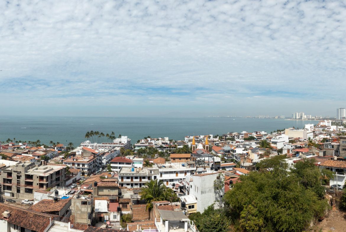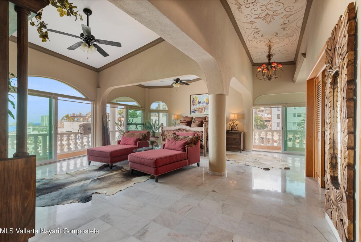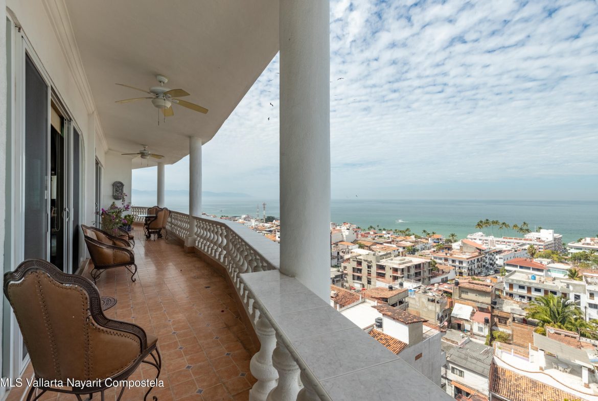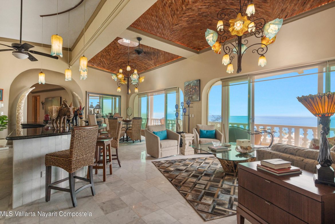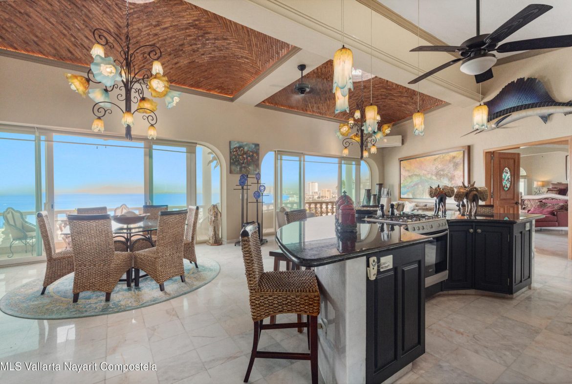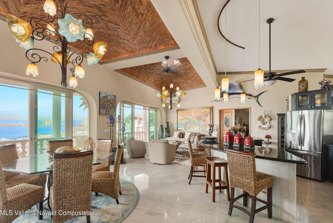 Perched on the hillside just above downtown Puerto Vallarta, this one-of-a-kind penthouse offers breathtaking, unobstructed 180-degree, bay and city views in an exclusive boutique setting. Step inside and be captivated by the custom-designed, curvilinear kitchen, a true architectural statement with handcrafted hardwood cabinetry, premium appliances, and granite countertops. A sophisticated bar seating area enhances both function and style. The grand living and dining areas exude timeless sophistication, framed by vaulted ceilings and exquisite cupolas adorned with hand-blown glass chandeliers. These spaces flow seamlessly onto a full-length, covered terrace, ideal for entertaining or quiet relaxation.