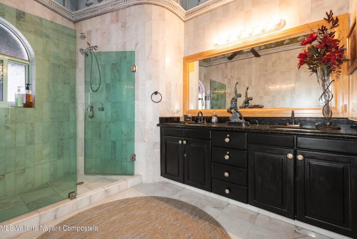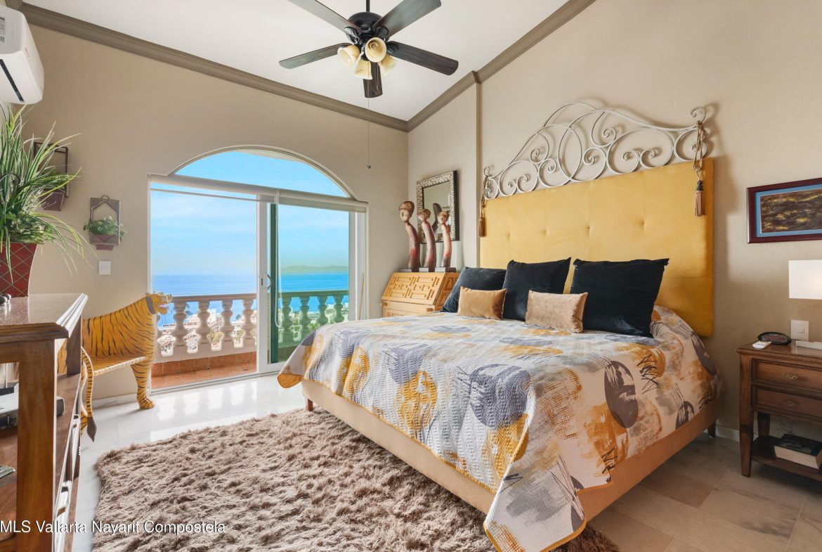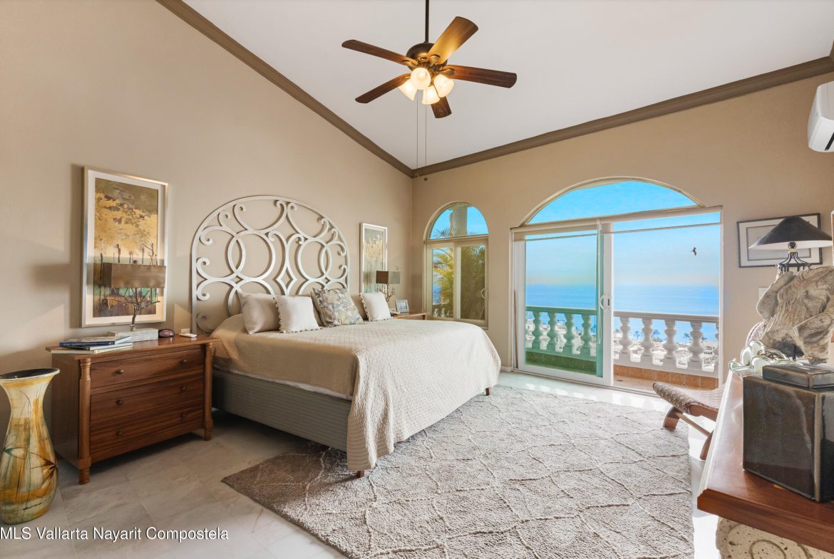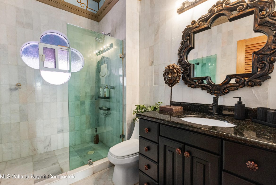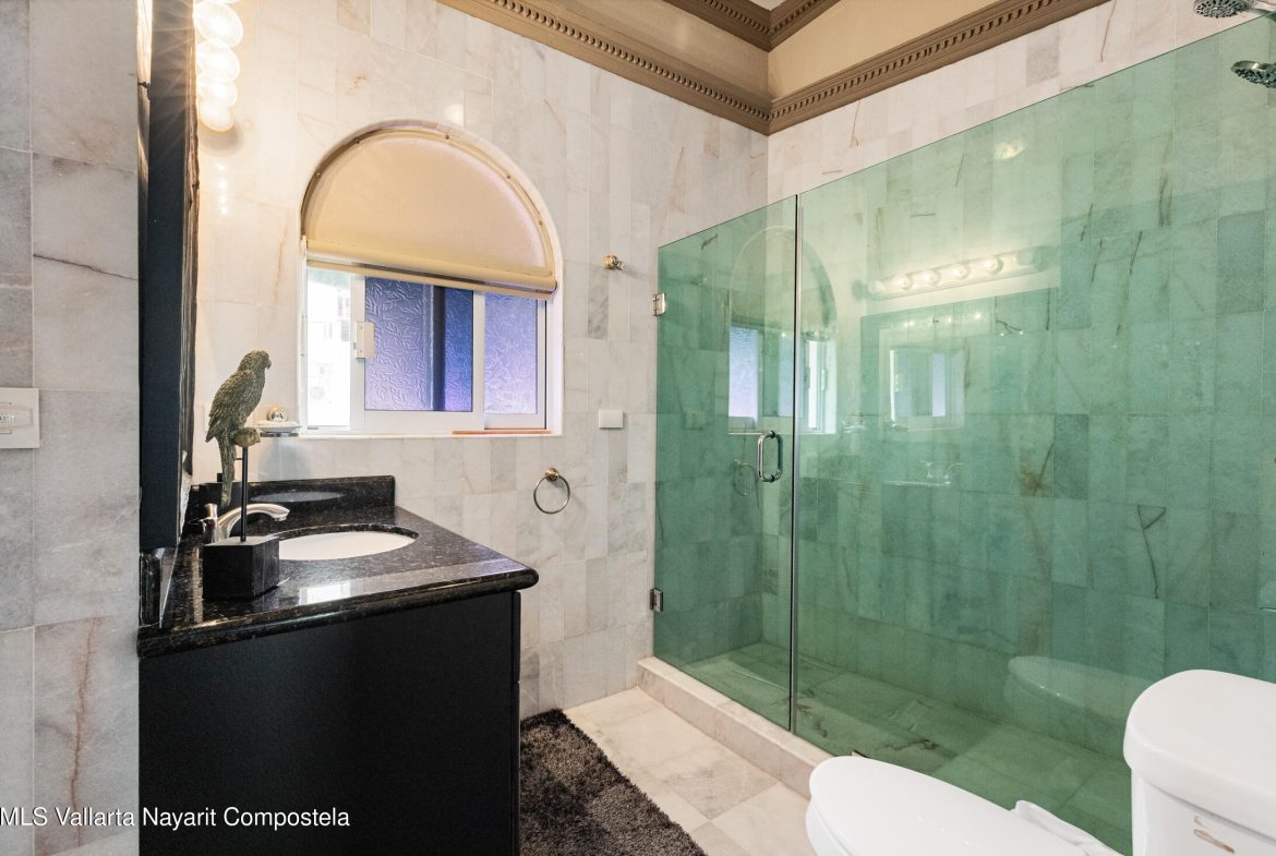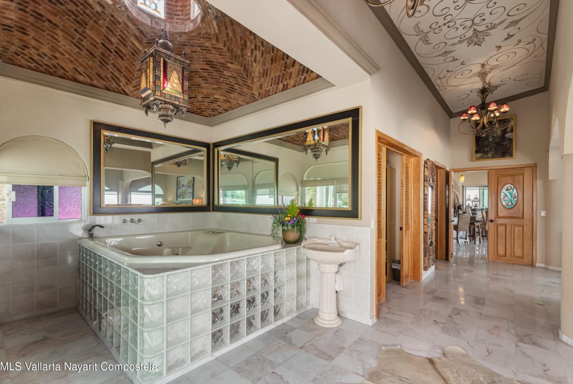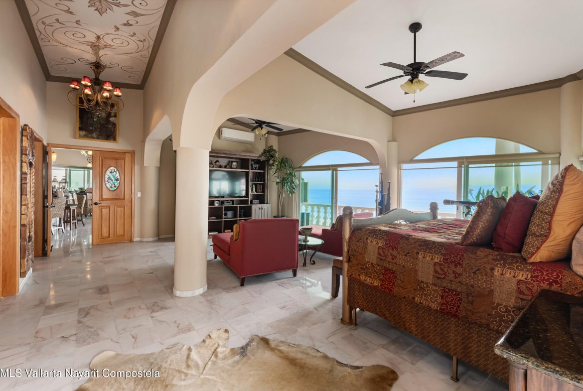 Perched on the hillside just above downtown Puerto Vallarta, this one-of-a-kind penthouse offers breathtaking, unobstructed 180-degree, bay and city views in an exclusive boutique setting. Step inside and be captivated by the custom-designed, curvilinear kitchen, a true architectural statement with handcrafted hardwood cabinetry, premium appliances, and granite countertops. A sophisticated bar seating area enhances both function and style. The grand living and dining areas exude timeless sophistication, framed by vaulted ceilings and exquisite cupolas adorned with hand-blown glass chandeliers. These spaces flow seamlessly onto a full-length, covered terrace, ideal for entertaining or quiet relaxation.