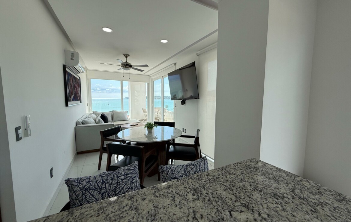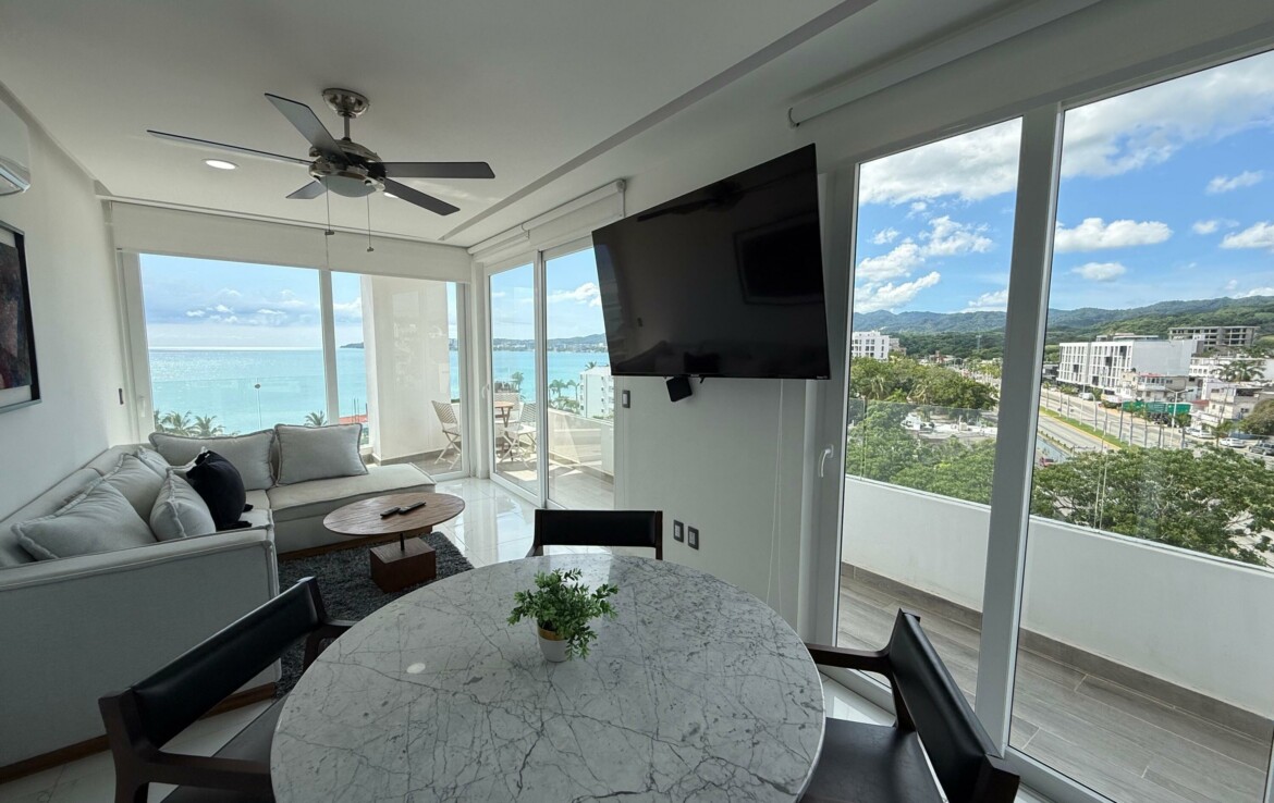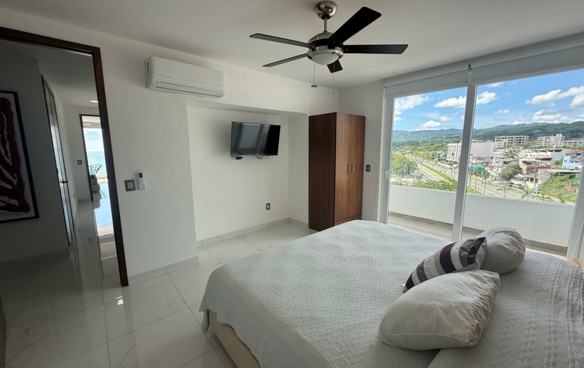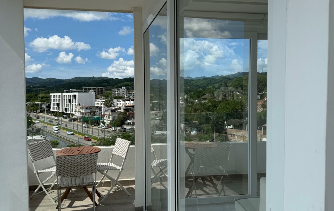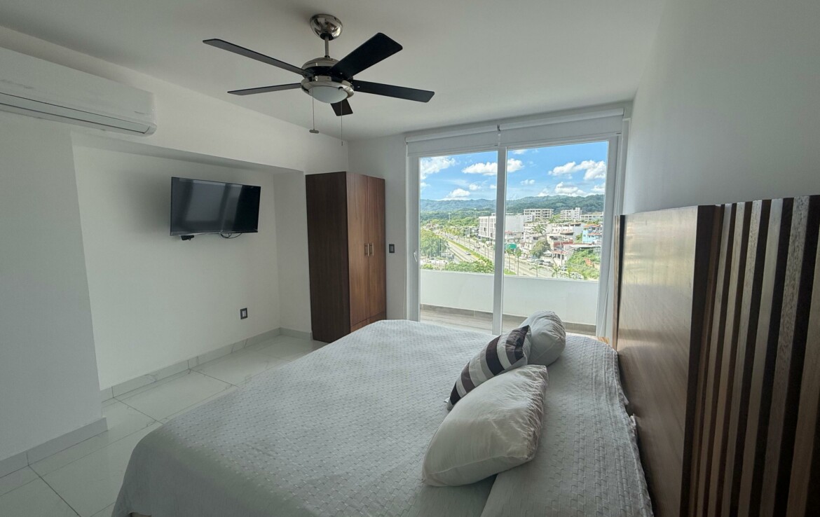 Hermoso departamento completamente amueblado y listo para utilizarse localizado en la zona centro de Bucerias cerca de restaurantes, bares tiendas etc. Increibles vistas a la montana, al mar y a toda la bahia. Cuenta tambien con estacionamiento escriturado. El edificio TAU cuenta con rooftop, lobby, administracion en el edificio, elevador alberca, servicio de alimentos etc. Propiedad ideal para rentas o para vivir tiempo completo. Amazing fully furnished and equipped condo located in the heart of Bucerias downtown close to restaurants, stores, bars etc. Incredible views to the ocean, mountains and the entire bay. Deeded parking. TAU condo features rooftop with pool, lobby, on site management office restaurant service etc. This property is ideal for rentals or full time living.