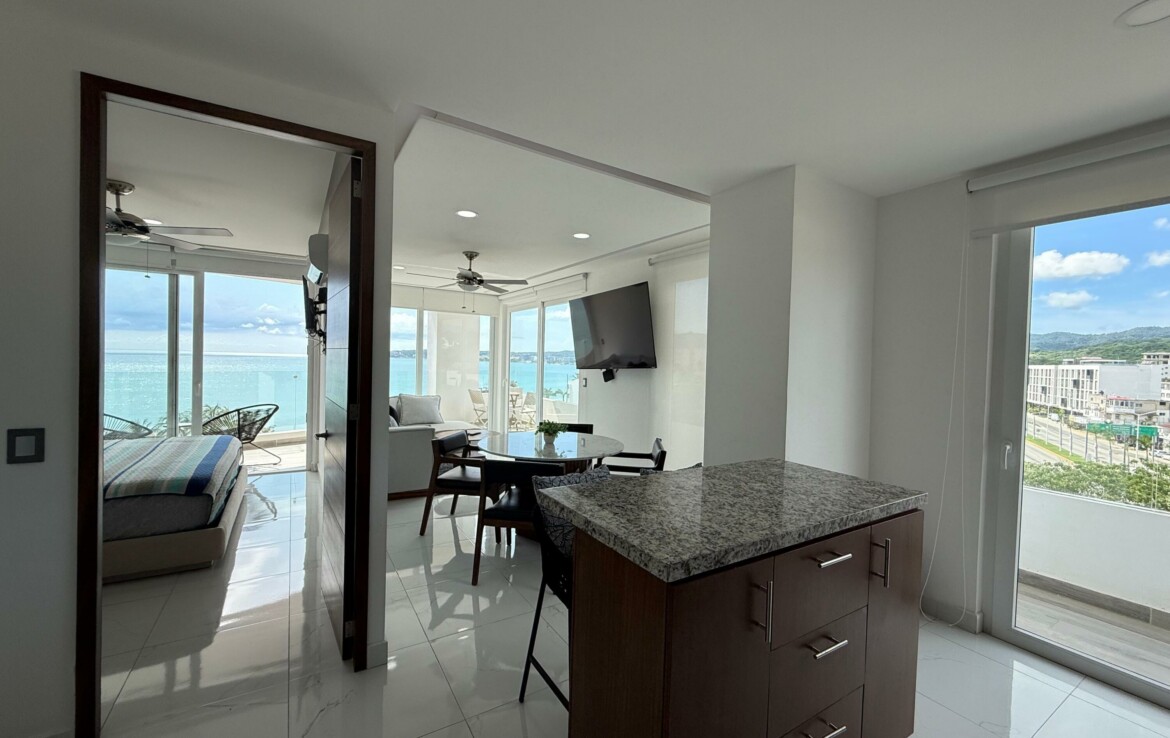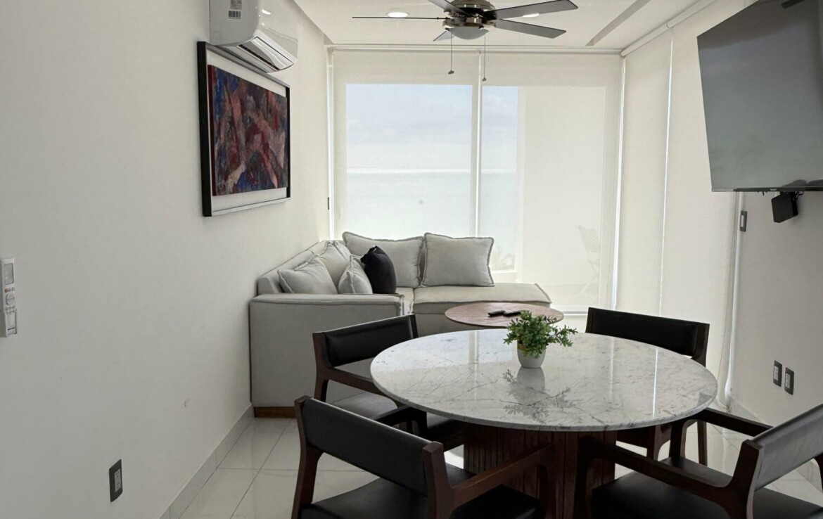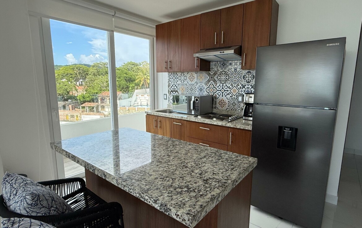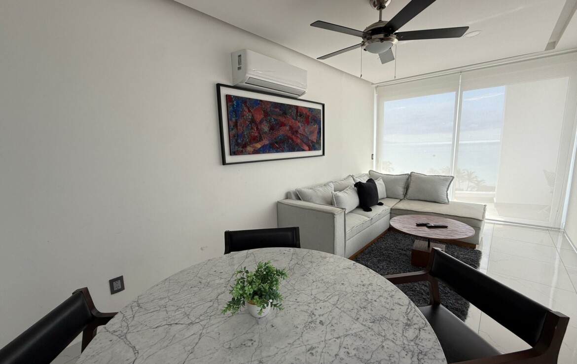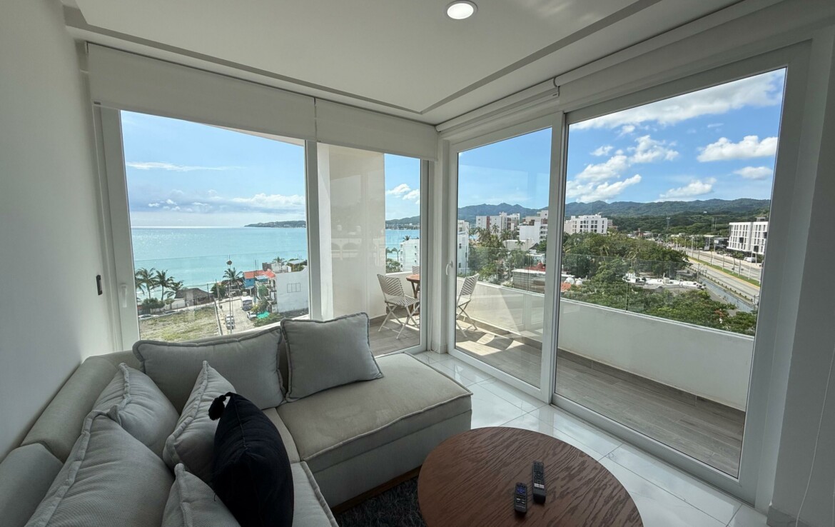 Hermoso departamento completamente amueblado y listo para utilizarse localizado en la zona centro de Bucerias cerca de restaurantes, bares tiendas etc. Increibles vistas a la montana, al mar y a toda la bahia. Cuenta tambien con estacionamiento escriturado. El edificio TAU cuenta con rooftop, lobby, administracion en el edificio, elevador alberca, servicio de alimentos etc. Propiedad ideal para rentas o para vivir tiempo completo. Amazing fully furnished and equipped condo located in the heart of Bucerias downtown close to restaurants, stores, bars etc. Incredible views to the ocean, mountains and the entire bay. Deeded parking. TAU condo features rooftop with pool, lobby, on site management office restaurant service etc. This property is ideal for rentals or full time living.