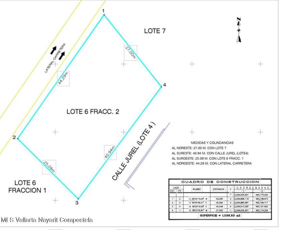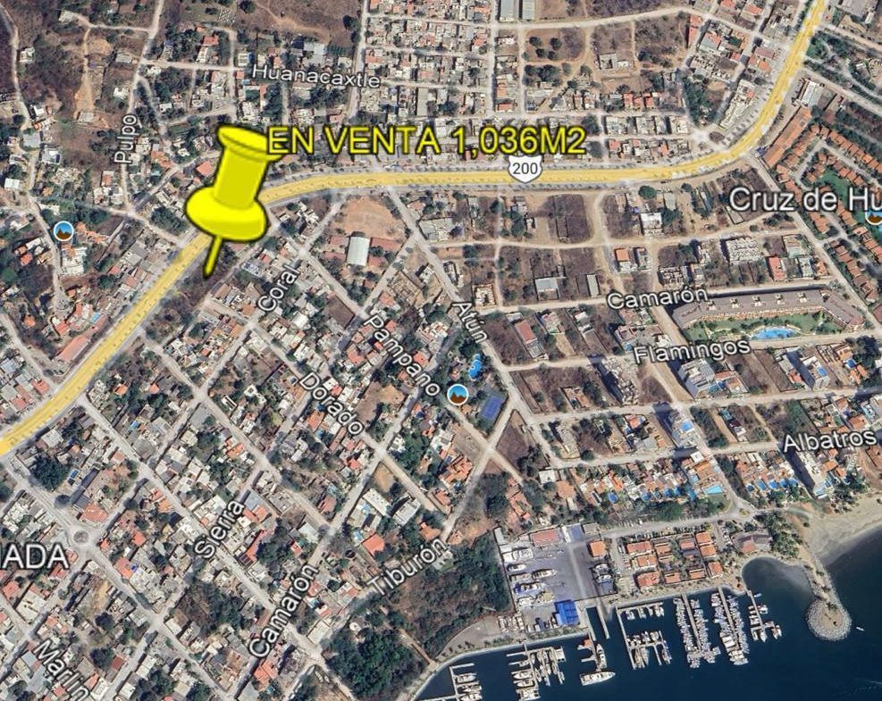 Oportunidad Estrategica en La Cruz de Huanacaxtle, Excelente terreno de 1,036.53 m con escritura, ubicado a pie de carretera sobre la Federal 200, en una de las zonas con mayor crecimiento y plusvalia de Bahia de Banderas. Con una fachada de 44.29 metros lineales frente a carretera y colindancia posterior con la calle Jurel, este terreno ofrece doble acceso, lo que lo convierte en una opcion inmejorable para proyectos comerciales y residenciales.Medidas y colindancias:Frente: 44.29m sobre carretera 200, lateral 1: 27.00m, lateral 2: 25.09 m, Parte posterior: 40.94m sobre calle Jurel, Superficie total: 1,036.53 m. Uso de suelo: Corredor Urbano ideal para desarrollar un edificio de departamentos con locales comerciales en planta baja, oficinas, o cualquier proyecto de alto impacto