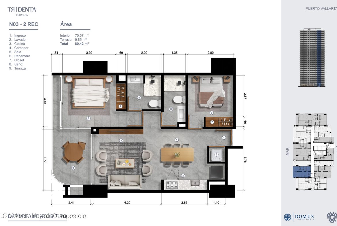 Disenado por los aclamados arquitectos de GVA, Tridenta Towers presenta un estilo de vida de playa en la Zona Hotelera de Puerto Vallarta. Esta obra maestra arquitectonica ofrece 312 exquisitas residencias en la Torre 1, desde estudios hasta departamentos de 3 habitaciones, cada uno con impresionantes vistas al mar o a las montanas. Disfruta de amenidades que incluyen albercas infinity, una increible terraza superior con vistas panoramicas a la bahia, un beach club, canchas de padel, gimnasio y exuberantes jardines tropicales. Su ubicacion privilegiada combina la tranquilidad de vivir frente al mar con facil acceso a restaurantes y vida nocturna. Estacionamiento disponible con costo adicional.