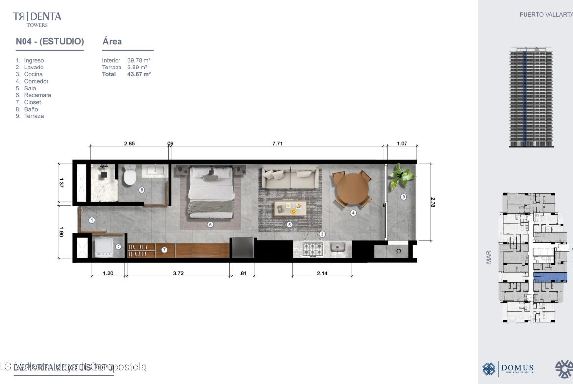 Disenado por los aclamados arquitectos de GVA, Tridenta Towers presenta un estilo de vida de playa en la Zona Hotelera de Puerto Vallarta. Esta obra maestra arquitectonica ofrece 312 exquisitas residencias en la Torre 1, desde estudios hasta departamentos de 3 habitaciones, cada uno con impresionantes vistas al mar o a las montanas. Disfruta de amenidades que incluyen albercas infinity, una increible terraza superior con vistas panoramicas a la bahia, un beach club, canchas de padel, gimnasio y exuberantes jardines tropicales. Su ubicacion privilegiada combina la tranquilidad de vivir frente al mar con facil acceso a restaurantes y vida nocturna. Estacionamiento disponible con costo adicional.