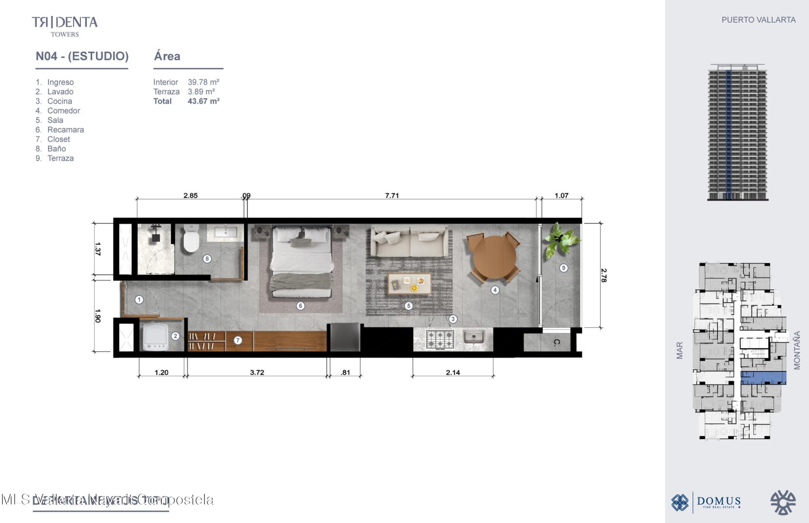 Tridenta Towers presenta un estilo de vida de playa en la Zona Hotelera de Puerto Vallarta. Esta obra maestra arquitectonica ofrece 335 exquisitas residencias en la Torre 1, desde estudios hasta departamentos de 3 habitaciones, cada uno con impresionantes vistas al mar o a las montanas. Disfruta de amenidades que incluyen albercas infinity, una increible terraza superior con vistas panoramicas a la bahia, un beach club, canchas de padel, gimnasio y exuberantes jardines tropicales. Su ubicacion privilegiada combina la tranquilidad de vivir frente al mar con facil acceso a restaurantes y vida nocturna. Estacionamiento disponible con costo adicional.