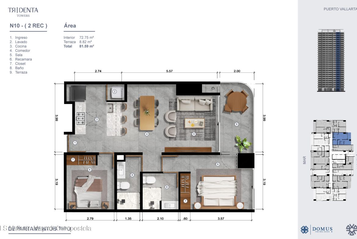 Disenado por los aclamados arquitectos de GVA, Tridenta Towers presenta un estilo de vida de playa en la Zona Hotelera de Puerto Vallarta. Esta obra maestra arquitectonica ofrece 312 exquisitas residencias en la Torre 1, desde estudios hasta departamentos de 3 habitaciones, cada uno con impresionantes vistas al mar o a las montanas. Disfruta de amenidades que incluyen albercas infinity, una increible terraza superior con vistas panoramicas a la bahia, un beach club, canchas de padel, gimnasio y exuberantes jardines tropicales. Su ubicacion privilegiada combina la tranquilidad de vivir frente al mar con facil acceso a restaurantes y vida nocturna. Estacionamiento disponible con costo adicional.
