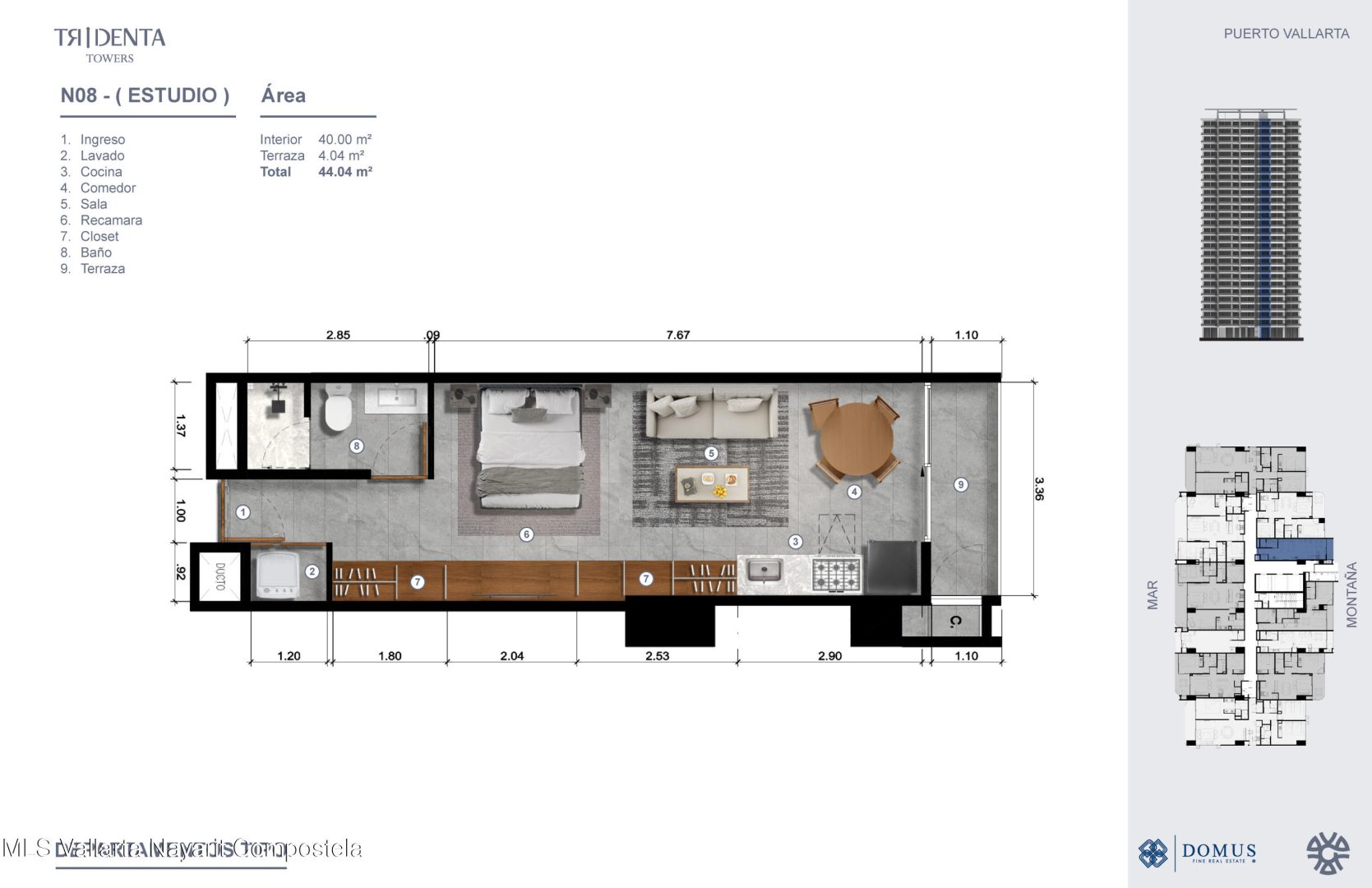 Disenado por los aclamados arquitectos de GVA, Tridenta Towers presenta un estilo de vida de playa en la Zona Hotelera de Puerto Vallarta. Esta obra maestra arquitectonica ofrece 312 exquisitas residencias en la Torre 1, desde estudios hasta departamentos de 3 habitaciones, cada uno con impresionantes vistas al mar o a las montanas. Disfruta de amenidades que incluyen albercas infinity, una increible terraza superior con vistas panoramicas a la bahia, un beach club, canchas de padel, gimnasio y exuberantes jardines tropicales. Su ubicacion privilegiada combina la tranquilidad de vivir frente al mar con facil acceso a restaurantes y vida nocturna. Estacionamiento disponible con costo adicional.