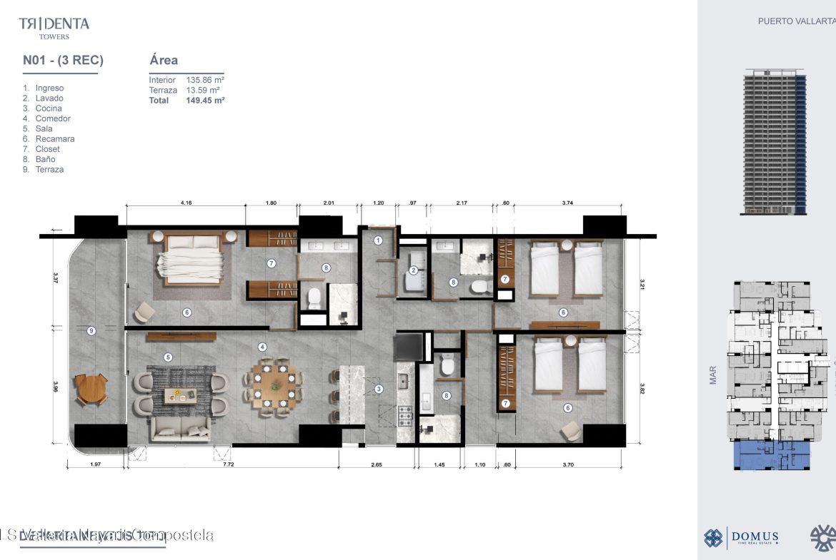 Disenado por los aclamados arquitectos de GVA, Tridenta Towers presenta un estilo de vida de playa en la Zona Hotelera de Puerto Vallarta. Esta obra maestra arquitectonica ofrece 312 exquisitas residencias en la Torre 1, desde estudios hasta departamentos de 3 habitaciones, cada uno con impresionantes vistas al mar o a las montanas. Disfruta de amenidades que incluyen albercas infinity, una increible terraza superior con vistas panoramicas a la bahia, un beach club, canchas de padel, gimnasio y exuberantes jardines tropicales. Su ubicacion privilegiada combina la tranquilidad de vivir frente al mar con facil acceso a restaurantes y vida nocturna. Estacionamiento disponible con costo adicional.