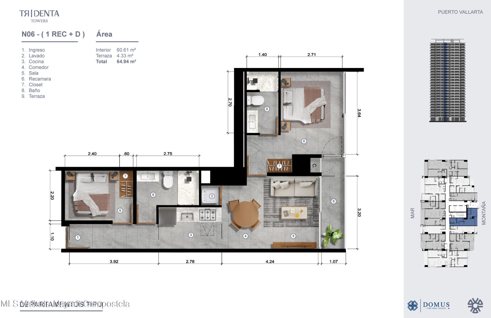 Disenado por los aclamados arquitectos de GVA, Tridenta Towers presenta un estilo de vida de playa en la Zona Hotelera de Puerto Vallarta. Esta obra maestra arquitectonica ofrece 312 exquisitas residencias en la Torre 1, desde estudios hasta departamentos de 3 habitaciones, cada uno con impresionantes vistas al mar o a las montanas. Disfruta de amenidades que incluyen albercas infinity, una increible terraza superior con vistas panoramicas a la bahia, un beach club, canchas de padel, gimnasio y exuberantes jardines tropicales. Su ubicacion privilegiada combina la tranquilidad de vivir frente al mar con facil acceso a restaurantes y vida nocturna. Estacionamiento disponible con costo adicional.