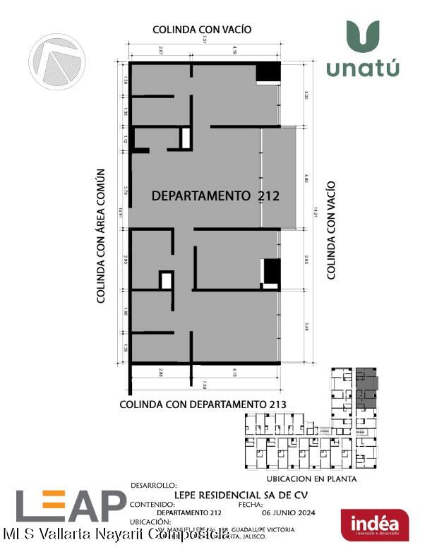 Ubicado en Calle Manuel Lepe, Col. Guadalupe Victoria, una de las zonas con mayor crecimiento y plusvalia en Puerto Vallarta, UNATU ofrece alta conectividad al aeropuerto, central camionera, centros comerciales y playas. Desarrollado por INDEA, cuenta con 116 departamentos en 10 niveles + rooftop, amenidades premium, estacionamiento y bodegas. Entrega estimada abril 2028.