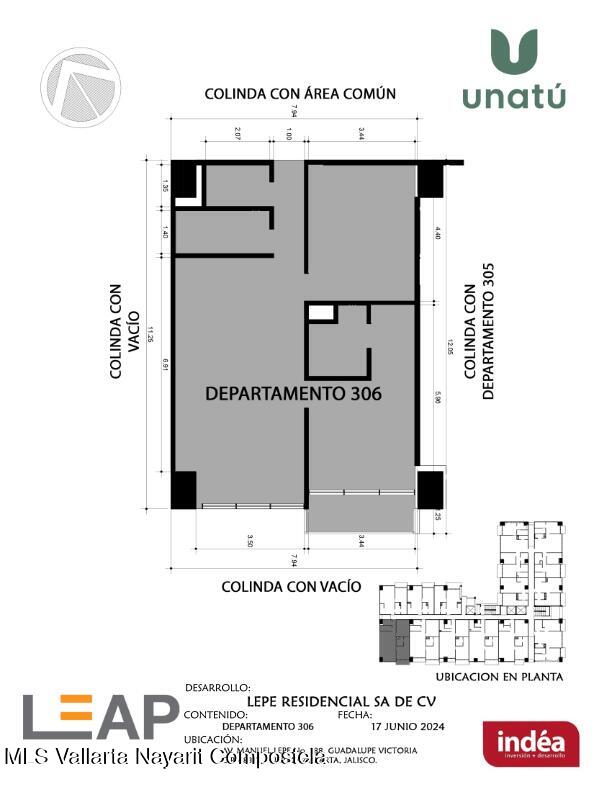 Ubicado en Calle Manuel Lepe, Col. Guadalupe Victoria, una de las zonas con mayor crecimiento y plusvalia en Puerto Vallarta, UNATU ofrece alta conectividad al aeropuerto, central camionera, centros comerciales y playas. Desarrollado por INDEA, cuenta con 116 departamentos en 10 niveles + rooftop, amenidades premium, estacionamiento y bodegas. Entrega estimada abril 2028