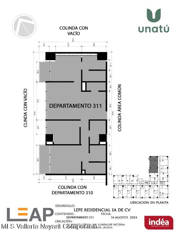Ubicado en Calle Manuel Lepe, Col. Guadalupe Victoria, una de las zonas con mayor crecimiento y plusvalia en Puerto Vallarta, UNATU ofrece alta conectividad al aeropuerto, central camionera, centros comerciales y playas. Desarrollado por INDEA, cuenta con 116 departamentos en 10 niveles + rooftop, amenidades premium, estacionamiento y bodegas. Entrega estimada abril 2028.