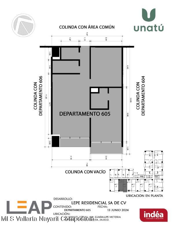 Ubicado en Calle Manuel Lepe, Col. Guadalupe Victoria, una de las zonas con mayor crecimiento y plusvalia en Puerto Vallarta, UNATU ofrece alta conectividad al aeropuerto, central camionera, centros comerciales y playas. Desarrollado por INDEA, cuenta con 116 departamentos en 10 niveles + rooftop, amenidades premium, estacionamiento y bodegas.